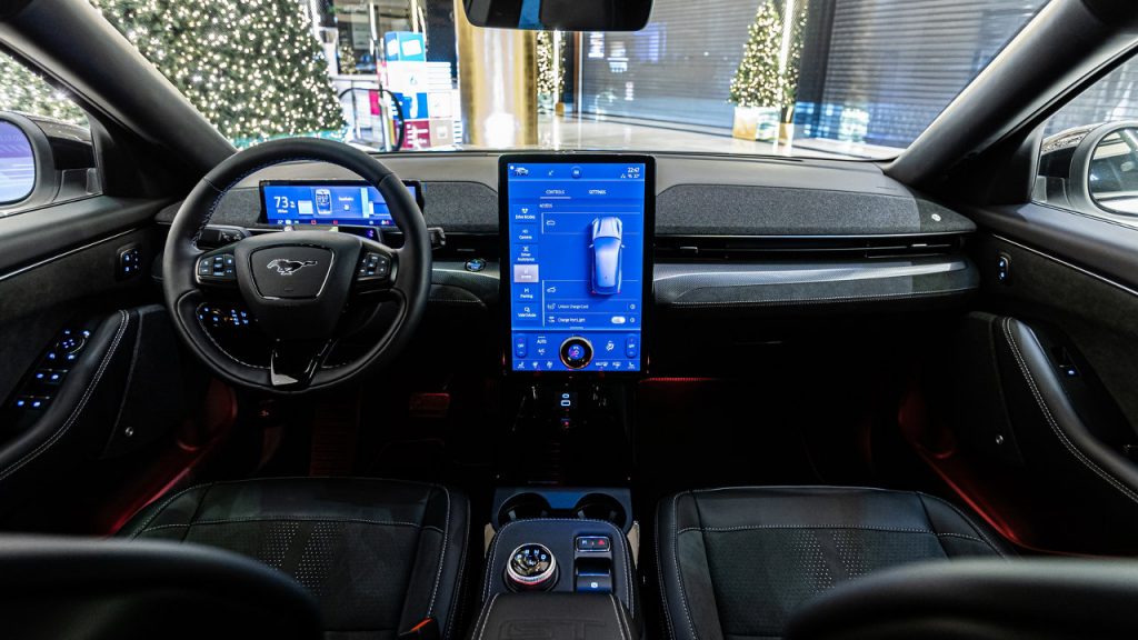 Με την είσοδο στην καμπίνα της ηλεκτρικής Ford Mustang Mach-E, ο οδηγός έρχεται σε επαφή με ένα άκρως ψηφιακό περιβάλλον. Μπροστά του δεσπόζει μία μεγάλη οθόνη αφής μεγέθους 15,5 ιντσών. Είναι κάθετα τοποθετημένη και επάνω της έχει τοποθετηθεί με έξυπνο τρόπο ο πρακτικός, περιστροφικός διακόπτης για την ένταση της φωνής. Έτσι, ο οδηγός δεν χρειάζεται να χάνει την επαφή με τον δρόμο. Μέσω αυτής της οθόνης προσφέρονται αμέτρητες ευκολίες, όπως για παράδειγμα η ασύρματη σύνδεση Apple CarPlay και Android Auto, κάμερες που καλύπτουν κάθε γωνία του αυτοκινήτου για ευκολότερη στάθμευση, αλλά και παιχνίδια που είναι “προσβάσιμα” μόνο όταν το όχημα είναι ακινητοποιημένο. Το σύστημα ενημέρωση και ψυχαγωγίας Sync4 προσφέρει επίσης την δυνατότητα της συνεχούς ενημέρωσης του οδηγού κατά τη διάρκεια του ταξιδιού, συμβουλεύοντάς τον πού και πότε να φορτίσει, αλλά και ενημερώνοντάς τον σε πραγματικό χρόνο για τη διαθεσιμότητα σταθμού φόρτισης. Μία δεύτερη οθόνη βρίσκεται πίσω από το τιμόνι με όλες τις απαραίτητες ενδείξεις, όπως για παράδειγμα η ταχύτητα, η υπολειπόμενη μπαταρία και η αυτονομία. Άκρως θετικές εντυπώσεις αφήνουν και οι χώροι, με πληθώρα πρακτικών θηκών για μικροαντικείμενα στην καμπίνα. Όσο για τις αποσκευές, στο πίσω μέρος υπάρχει διαθέσιμος όγκος 402 λτ., ενώ κάτω από το καπό υπάρχει δεύτερος χώρος που προσφέρει επιπλέον 81 λίτρα.