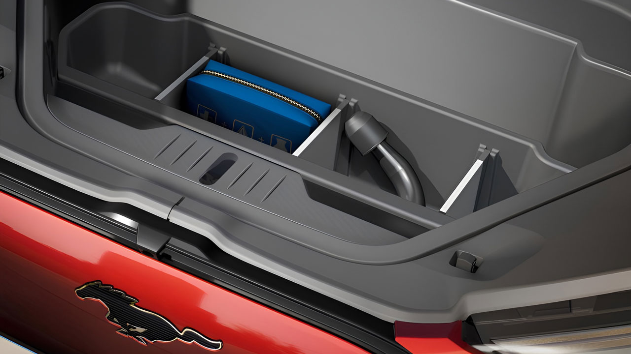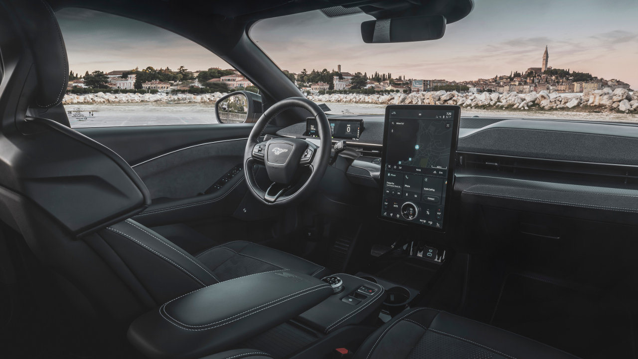 Με την είσοδο στην καμπίνα της ηλεκτρικής Ford Mustang Mach-E, ο οδηγός έρχεται σε επαφή με ένα άκρως ψηφιακό περιβάλλον. Μπροστά του δεσπόζει μία μεγάλη οθόνη αφής μεγέθους 15,5 ιντσών. Είναι κάθετα τοποθετημένη και επάνω της έχει τοποθετηθεί με έξυπνο τρόπο ο πρακτικός, περιστροφικός διακόπτης για την ένταση της φωνής. Έτσι, ο οδηγός δεν χρειάζεται να χάνει την επαφή με τον δρόμο. Μέσω αυτής της οθόνης προσφέρονται αμέτρητες ευκολίες, όπως για παράδειγμα η ασύρματη σύνδεση Apple CarPlay και Android Auto, κάμερες που καλύπτουν κάθε γωνία του αυτοκινήτου για ευκολότερη στάθμευση, αλλά και παιχνίδια που είναι “προσβάσιμα” μόνο όταν το όχημα είναι ακινητοποιημένο. Το σύστημα ενημέρωση και ψυχαγωγίας Sync4 προσφέρει επίσης την δυνατότητα της συνεχούς ενημέρωσης του οδηγού κατά τη διάρκεια του ταξιδιού, συμβουλεύοντάς τον πού και πότε να φορτίσει, αλλά και ενημερώνοντάς τον σε πραγματικό χρόνο για τη διαθεσιμότητα σταθμού φόρτισης. Μία δεύτερη οθόνη βρίσκεται πίσω από το τιμόνι με όλες τις απαραίτητες ενδείξεις, όπως για παράδειγμα η ταχύτητα, η υπολειπόμενη μπαταρία και η αυτονομία. Άκρως θετικές εντυπώσεις αφήνουν και οι χώροι, με πληθώρα πρακτικών θηκών για μικροαντικείμενα στην καμπίνα. Όσο για τις αποσκευές, στο πίσω μέρος υπάρχει διαθέσιμος όγκος 402 λτ., ενώ κάτω από το καπό υπάρχει δεύτερος χώρος που προσφέρει επιπλέον 81 λίτρα.