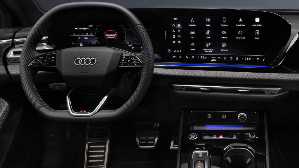 Περνάμε στο εσωτερικό, το οποίο διακρίνεται για την κορυφαία ποιότητα, με μαλακά στην υφή πλαστικά και δερμάτινες επενδύσεις. Το περιβάλλον είναι εντυπωσιακό, με το αυτοκίνητο της δοκιμής να εξοπλίζεται με την προαιρετική τρίτη οθόνη στην πλευρά του οδηγού (σίγουρα πολλοί θα το βρουν υπερβολικό). Έχουμε, λοιπόν, μία οθόνη σε ρόλο πίνακα οργάνων πίσω από το τιμόνι μεγέθους 11,9 ιντσών. Στην κεντρική κονσόλα υπάρχει η κεντρική οθόνη αφής του MMI μεγέθους 14,5 ιντσών, ενώ η προαιρετική στα δεξιά είναι 10,9 ιντσών και την χειρίζεται ο οδηγός. Bonus το αναβαθμισμένο head-up display, όπου για πρώτη φορά ο οδηγός έχει τη δυνατότητα να ελέγχει το όχημα και τις λειτουργίες του infotainment από εκεί. Μπορεί το “ψηφιακό περιβάλλον” να είναι έντονο, αλλά η εξοικείωση ήρθε πολύ γρήγορα. Σίγουρα, όμως, θα ήθελα μερικούς ακόμα “φυσικούς” διακόπτες, κυρίως για τον έλεγχο του κλιματισμού. Ο μόνος “φυσικός” διακόπτης είναι ο περιστροφικός για την ρύθμιση της έντασης. Ευτυχώς, στο τιμόνι υπάρχουν τα δύο πάνελ αφής που γίνονται όλες οι απαραίτητες λειτουργίες χωρίς να αποσπάται η προσοχή κατά την οδήγηση.