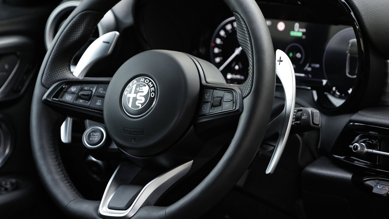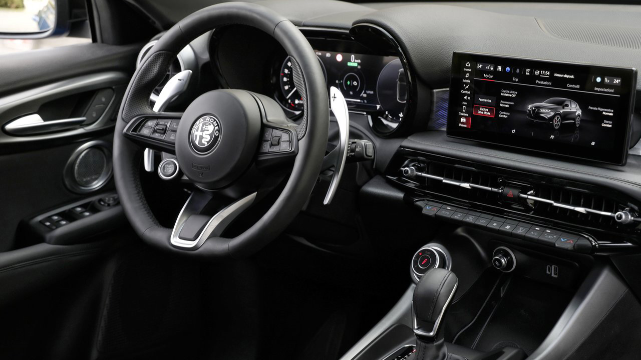 H Alfa Romeo Tonale δεν είναι καμιά μάρκα της σειράς… Έχει μεγάλη ιστορία και αν μη τι άλλο τα δημιουργήματά της σέβονται την παράδοσή της. Και αυτό αντανακλάται και στο εσωτερικό της Tonale. Οι επιβάτες περιβάλλονται από μία άκρως ποιοτική και καλαίσθητη καμπίνα. Στα περισσότερα τμήματα συναντάμε ποιοτικό φινίρισμα, ενώ δεν απουσιάζουν οι σπορ λεπτομέρειες. Πίσω από το τριάκτινο τιμόνι, το οποίο φέρει το κουμπί εκκίνησης του κινητήρα, υπάρχει μία οθόνη σε ρόλο πίνακα οργάνων. Η σχεδίασή της έχει γίνει με τέτοιον τρόπο ώστε να παραπέμπει στους διπλούς, αναλογικούς “Cannocchiale” πίνακες οργάνων του παρελθόντος. Το ψηφιακό περιβάλλον αποτελείται από την οθόνη πίσω από το τιμόνι στην οποία αναφερθήκαμε, με μέγεθος 12,25 ιντσών και στην κεντρική οθόνη αφής 10,25 ιντσών για το έλεγχο του infotainment και όλων των επιμέρους συστημάτων. Εννοείται πως δεν θα μπορούσαμε να αναφερθούμε και στα σταθερά, μεταλλικά paddles πίσω από το τιμόνι, αλλά και στα αλουμινένια πεντάλ. Αναφορικά με τους χώρους, στην καμπίνα υπάρχουν αρκετές θήκες για μικροαντικείμενα, οι οποίες είναι ιδιαίτερα πρακτικές, όπως για παράδειγμα οι “τσέπες” στις πόρτες και ο χώρος κάτω από τον “τεμπέλη”. Λίγο πιο μπροστά συναντάμε την θέση ασύρματης φόρτισης, αλλά και μία υποδοχή που θα βολέψει ένα μικρό μπουκαλάκι νερού. Στην πίσω σειρά καθισμάτων, δύο ενήλικες επιβάτες θα βολέψουν πολύ άνετα το κεφάλι και τα πόδια, ανεξαρτήτου αναστήματος. Όσο για τις αποσκευές, η Alfa Romeo ανακοινώνει 500 λτ. όγκο αποσκευών.