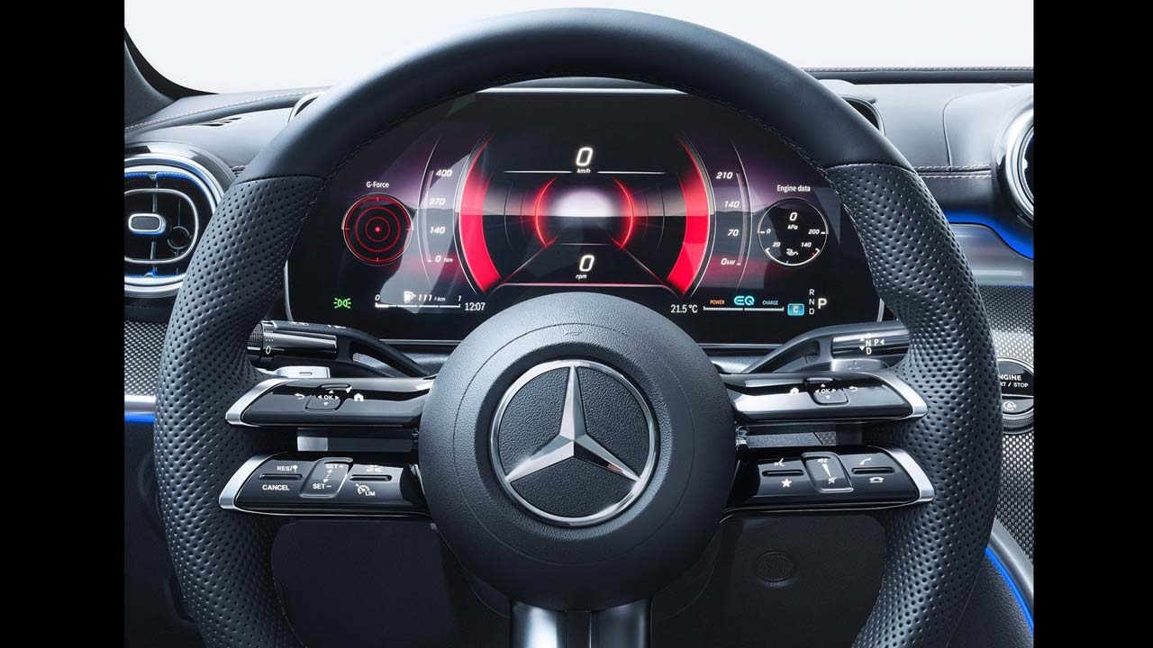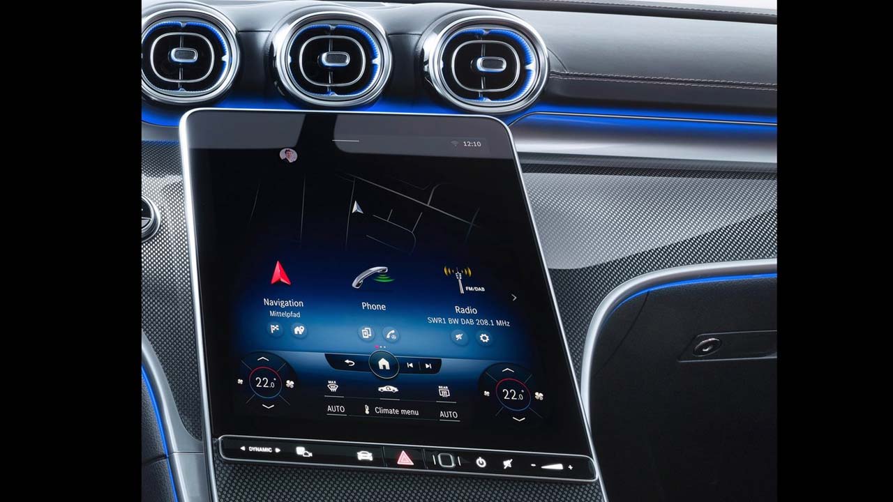 Το εσωτερικό της νέας Mercedes C-Class κυριολεκτικά δεν βλέπει τον ανταγωνισμό. Τα υλικά, το τιμόνι, ο φωτισμός, τα γραφικά, οι οθόνες, το φινίρισμα. Όλα είναι κορυφαία και συνυπάρχουν αρμονικά μεταξύ τους. H ποιότητα στη διαμόρφωση του εσωτερικού χώρου αποτυπώνεται μέχρι την τελευταία λεπτομέρεια. Το ταμπλό οργάνων είναι χωρισμένο σε δύο τμήματα. Tο επάνω τμήμα διαθέτει νέους αεραγωγούς, ενώ το κάτω τμήμα συνίσταται σε μια ενιαία επιφάνεια με πολυτελή διακοσμητικά στοιχεία, η οποία εκτείνεται ομοιόμορφα από την κεντρική κονσόλα μέχρι το ταμπλό οργάνων χωρίς καμία παρεμβολή. Tο ταμπλό οργάνων και η κεντρική οθόνη έχουν μία ελαφριά κλίση έξι μοιρών προς τον οδηγό. H οθόνη του οδηγού διαφοροποιείται ξεκάθαρα από τα παραδοσιακά κόκπιτ με τα κλασικά, στρογγυλά όργανα. Οι πελάτες μπορούν να επιλέξουν ανάμεσα σε μια έκδοση 10,25 ιντσών ή 12,3 ιντσών. Η μετάβαση προς την ψηφιοποίηση αντανακλάται και στην κεντρική οθόνη αφής, η οποία επιτρέπει τον έλεγχο των λειτουργιών του αυτοκινήτου. Έχει διαγώνιο 9,5 ιντσών (24,1 cm) στον βασικό εξοπλισμό, ενώ προαιρετικά διατίθεται μια μεγαλύτερη έκδοση 11,9 ιντσών ή 30,2 cm. Η εμφάνιση των οθονών μπορεί να εξατομικευθεί επιλέγοντας ανάμεσα σε τρία στιλ ενδείξεων (Discreet, Sporty, Classic / Διακριτικό, Σπορ, Κλασικό) και τρεις τρόπους λειτουργίας (Navigation, Assistance, Service / Πλοήγηση, Υποβοήθηση, Service). Σε συνδυασμό με οποιαδήποτε εξοπλιστική έκδοση, ο βασικός εξοπλισμός της νέας C-Class περιλαμβάνει ατμοσφαιρικό φωτισμό με οπτικές ίνες. Όπως η νέα S-Class, έτσι και η νέα C-Class είναι εξοπλισμένη με τη δεύτερη γενιά του MBUX (Mercedes-Benz User Experience). Το εσωτερικό του αυτοκινήτου έχει γίνει ακόμη πιο ψηφιακό και ευφυές, καθώς τόσο το hardware όσο και το λογισμικό έχουν κάνει άλματα προόδου. Η φωνητική υποβοήθηση «Hey Mercedes» γίνεται πιο διαδραστική και μπορεί να μαθαίνει ενεργοποιώντας τις online υπηρεσίες στην εφαρμογή Mercedes me App. Προφανώς και όλη αυτή η τεχνολογία χρειάζεται εξοικείωση.