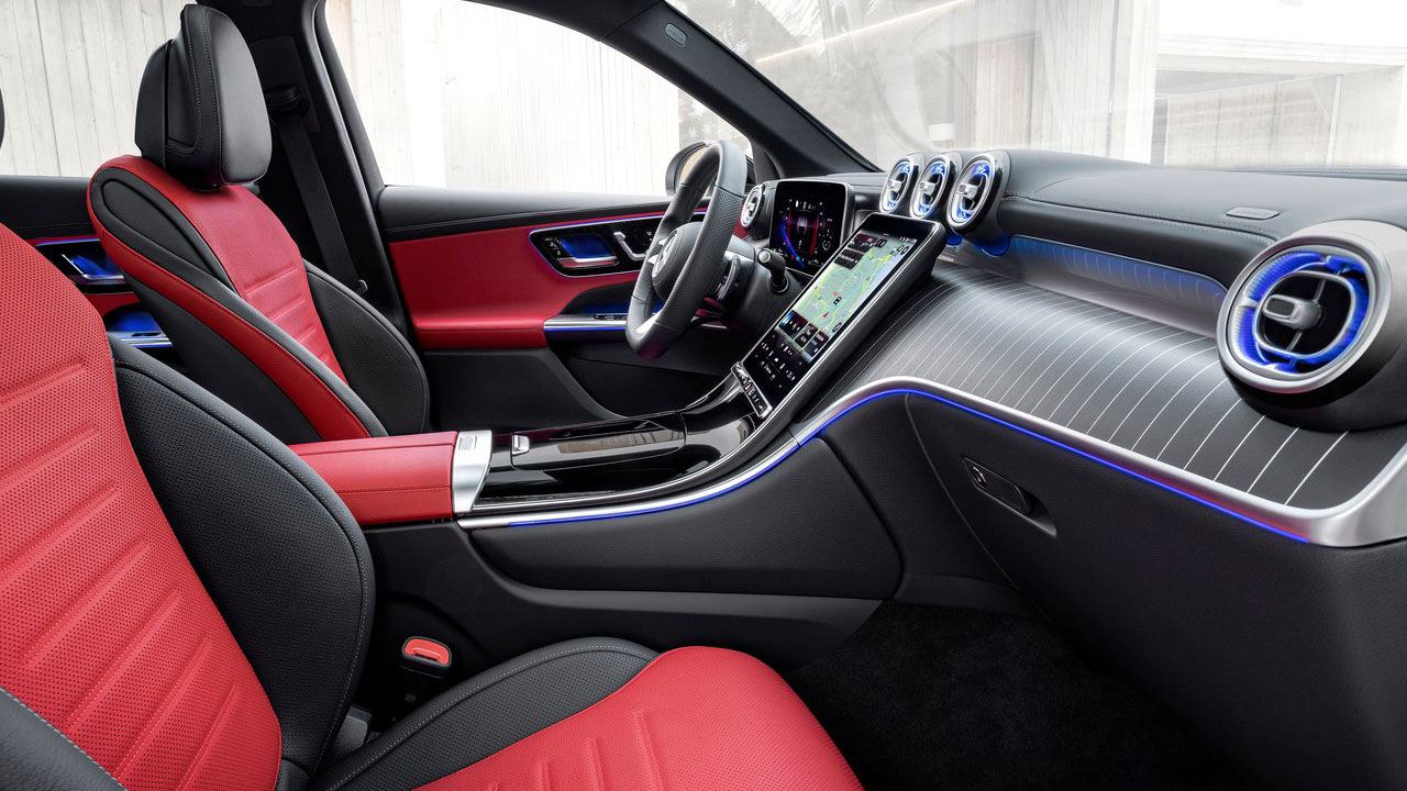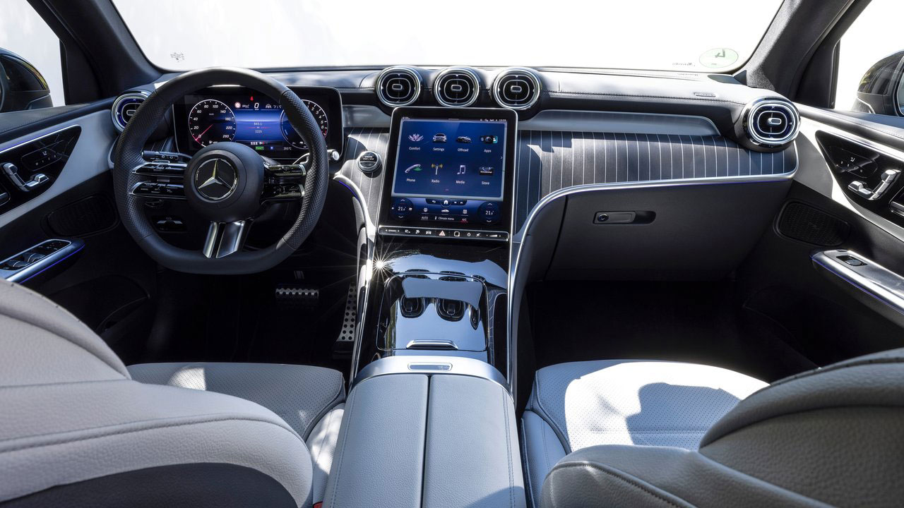 Περνάμε στην καμπίνα της νέας Mercedes GLC, εκεί όπου οι πάντες θα εντυπωσιαστούν από τις μεγάλες οθόνες και τον κρυφό φωτισμό που δημιουργεί μία φουτουριστική αίσθηση τη νύχτα. Μία LCD βρίσκεται πίσω από το τιμόνι, αναλαμβάνει την ενημέρωση του οδηγού με χρήσιμα στοιχεία και το μέγεθός της αγγίζει τις 12,3 ίντσες. Στο κέντρο είναι κάθετα τοποθετημένη η κύρια οθόνη αφής 11,9 ιντσών, η οποία “αιωρείται” και είναι στραμμένη ελαφρώς προς τον οδηγό, δίνοντας μία οδηγοκεντρική φιλοσοφία στο γερμανικό SUV. Στην τελευταία ενσωματώνεται και το προηγμένο σύστημα MBUX (Mercedes-Benz User Experience), το οποίο προσφέρει πληθώρα ευκολιών στον χρήστη. Από εκεί και πέρα, η πληθώρα χώρων αποθήκευσης εκτοξεύει την πρακτικότητα, ενώ ιδιαίτερες συστάσεις για την ποιότητα δεν χρειάζονται. Σε κάθε επιφάνεια συναντάμε ποιοτικά υλικά με μαλακή υφή, ενώ δεν απουσιάζουν και sportive στοιχεία, όπως για παράδειγμα το νέο, εντυπωσιακό flat-buttomed τιμόνι, τα αλουμινένια paddles για χειροκίνητες αλλαγές σχέσης και τα επίσης αλουμινένια πεντάλ. Ανοίγοντας ηλεκτρικά την πόρτα αποσκευών, εμφανίζεται ένας διαθέσιμος όγκος 620 λτ., ενώ με το πάτημα δύο κουμπιών πέφτουν τα καθίσματα και δημιουργείται ενιαίος χώρος με επίπεδο πάτωμα.