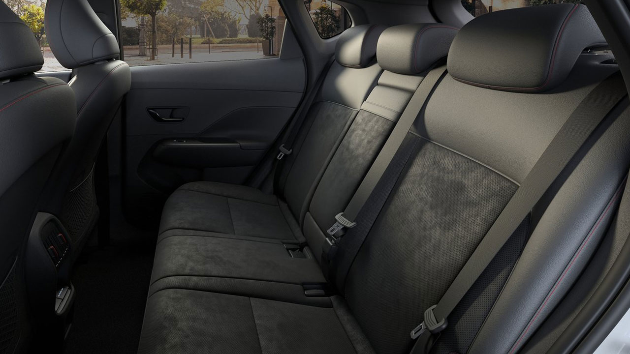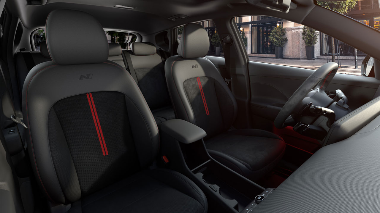 Αξιοσημείωτα στοιχεία στην καμπίνα είναι το “αιωρούμενο” C-Pad, όπως ονομάζεται, το οποίο απαρτίζεται από διπλές οθόνες 12,3 ιντσών. Αυτή που βρίσκεται πίσω από το τιμόνι αναλαμβάνει ρόλο πίνακα οργάνων, παρέχοντας όλες τις απαραίτητες πληροφορίες στον οδηγό. Η κεντρική οθόνη συνοδεύεται και από αρκετούς “φυσικούς” διακόπτες που είναι αρκετά χρήσιμοι, ώστε ο οδηγός να αλλάζει το κεντρικό μενού χωρίς να αποσπάται η προσοχή του. Κάπου εδώ να αναφέρουμε ότι υπάρχει και το σύστημα “Blind View Monitor”. Μόλις ο οδηγός βγάζει φλας, ανοίγει κάμερα που προβάλλει τη νεκρή γωνία. Έτσι, γίνονται για παράδειγμα πιο ασφαλείς οι αλλαγές λωρίδας. Στην περίπτωση της N Line έκδοσης, υπάρχουν αρκετά στοιχεία που κάνουν το Kona να ξεχωρίζει. Το εσωτερικό διαθέτει σπορ