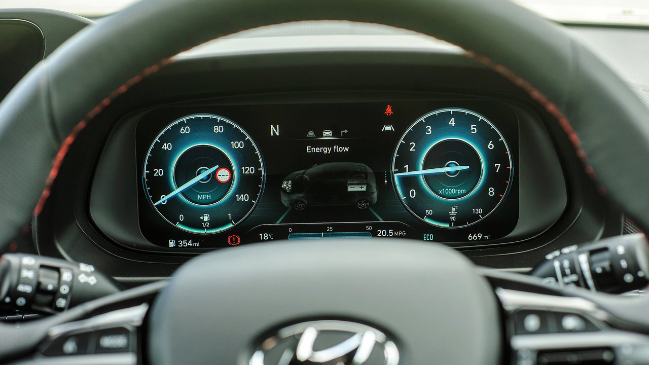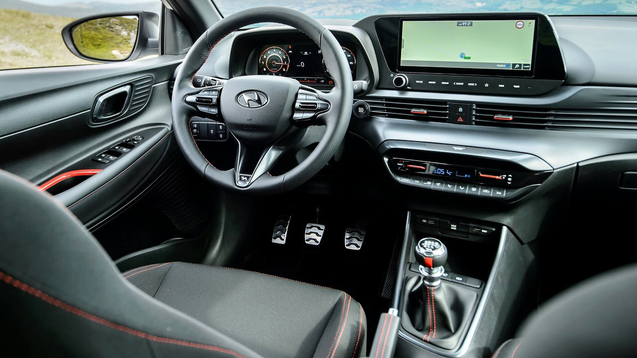 Στο εσωτερικό του Hyundai i20 έχουμε ξανά αναφερθεί στο παρελθόν, οπότε αυτή τη φορά θα δώσουμε έμφαση στα στοιχεία που διαφοροποιούν την εν λόγω έκδοση. Για παράδειγμα, η μονοτονία του μαύρου χρώματος “σπάει” με κάποιες κόκκινες λεπτομέρειες, όπως για παράδειγμα οι ραφές στο τιμόνι και τα καθίσματα, οι λεπτομέρειες στους αεραγωγούς, στον επιλογέα ταχυτήτων και στα χερούλια στις πόρτες. Επιπλέον, υπάρχουν αλουμινένια πεντάλ, αλλά και σήματα Ν σε αρκετά σημεία, όπως το τιμόνι και οι πλάτες των καθισμάτων. Το ψηφιακό περιβάλλον αποτελείται από μία οθόνη αφής μεγέθους 8 ιντσών για την ενημέρωση και ψυχαγωγία των επιβατών (εξοπλίζεται με Android Auto και το Apple CarPlay). Μία δεύτερη οθόνη σε ρόλο πίνακα οργάνων βρίσκεται πίσω από το τιμόνι. Το μέγεθος φτάνει τις 10,25 ίντσες, οι πληροφορίες που παρέχονται είναι ευδιάκριτες, ενώ υπάρχει και αλλαγή ανάλογα με το προφίλ οδήγησης που επιλέγεται (Normal ή Sport).