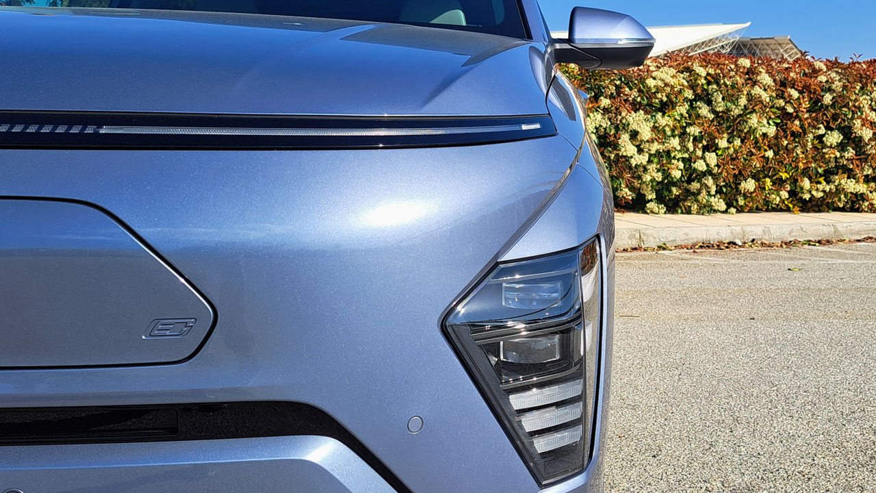Ξεκινάμε από την εξωτερική εμφάνιση, εκεί όπου το Hyundai Kona Electric απέκτησε μερικές “πινελιές” ανανέωσης. Στο εμπρός τμήμα φέρει μία LED λωρίδα που διατρέχει όλο το εμπρός τμήμα. Εκεί βρίσκεται και η θύρα για την φόρτιση, όπως ακριβώς συνέβαινε και στην πρώτη γενιά του μοντέλου. Ακριβώς το ίδιο συμβαίνει και στο πίσω μέρος, με την φωτεινή λωρίδα να “ελκύει” τα βλέμματα, Pixelated Seamless Horizon Lamp την ονομάζει η εταιρεία. Αναφορικά με τις διαστάσεις, το αυξημένο μήκος του νέου Hyundai Kona αγγίζει τα 4.355 χλστ. (N Line: 4.385 χλστ.), το πλάτος τα 1.825 χλστ. και το ύψος τα 1.575 χλστ. Οι διαστάσεις των ζαντών κυμαίνονται από 17 έως 19 ίντσες (19″ στην έκδοση της δοκιμής μας), ενώ δεν γίνεται να μην αναφερθούμε και στον συντελεστή οπισθέλκουσας, μιας και δόθηκε ιδιαίτερη έμφαση στην αεροδυναμική ώστε να μειωθεί στο 0,28.