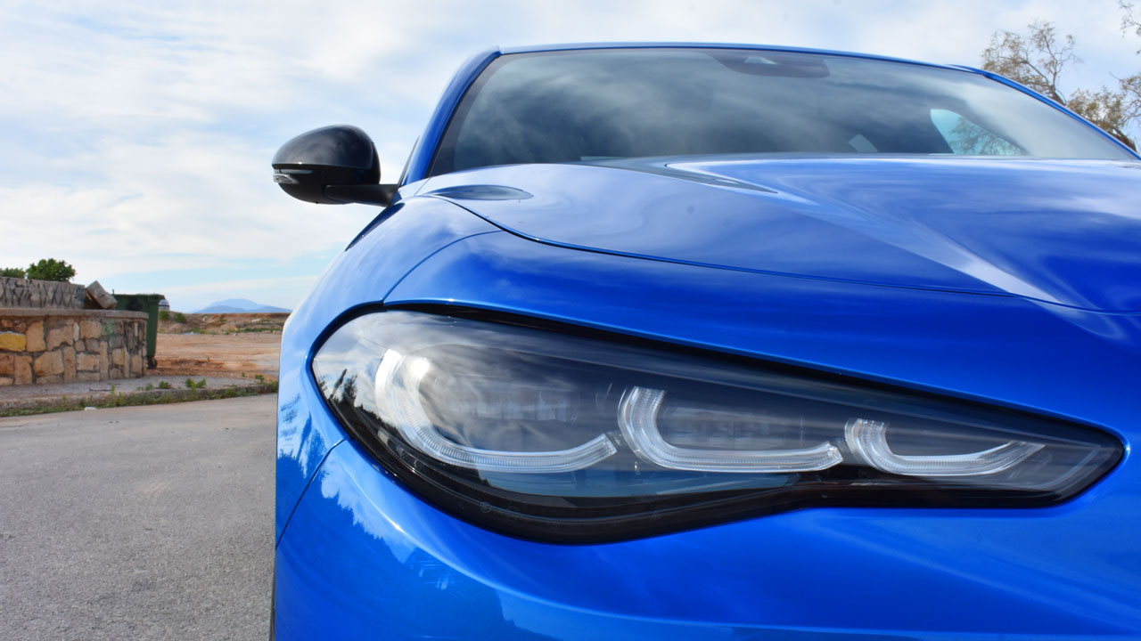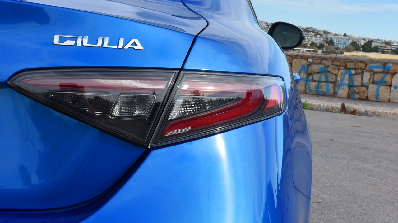 Μπορεί, όπως αναφέραμε, το κοινό να γυρνά την πλάτη στα sedan να στρέφεται στα SUV, αλλά στην περίπτωση της Alfa Romeo Giulia διαπιστώσαμε κατά την δοκιμή πως οι πάντες όχι απλά δεν γυρνούν την πλάτη, αλλά “καρφώνουν” το βλέμμα επάνω της. Υπάρχουν πολλά στοιχεία επάνω της που την κάνουν να ξεχωρίζει στον δρόμο! Τα λεπτά, ανασχεδιασμένα σώματα με τεχνολογία Full-Led Adaptive Matrix, σε συνδυασμό με την χαρακτηριστική τριγωνική μάσκα (Trilobo) “φωνάζουν” από μακριά ότι περνά μία Alfa Romeo. Το ίδιο ισχύει και στο πλάι, με τα έντονα νεύρα και τις μοναδικές ζάντες 19 ιντσών με τους πέντε κύκλους. Bonus οι κόκκινες δαγκάνες της έκδοσης δοκιμής! Πιο πίσω, η “sportive” φιλοσοφία της Alfa Romeo Giulia ολοκληρώνεται με τα επίσης ανασχεδιασμένα φωτιστικά σώματα, τον μαύρο διαχύτη και τις δύο απολήξεις του συστήματος εξάτμισης εκατέρωθεν αυτού. Αναφορικά με τις διαστάσεις, το μήκος της ιταλικής berlina αγγίζει τα 4.650 χλστ., το πλάτος τα 1.860 και το ύψος τα 1.438 χλστ.