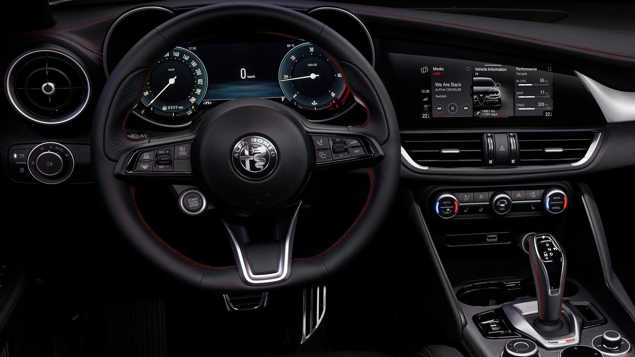 Περνάμε στο εσωτερικό της ανανεωμένης Alfa Romeo Giulia, ξεκινώντας από τα νέα στοιχεία. Ένα εξ’ αυτών είναι η νέα οθόνη μεγέθους 12,3 ιντσών σε ρόλο πίνακα οργάνων, η οποία μπορεί να είναι σύγχρονη, αλλά περιβάλλεται από το χαρακτηριστικό στρογγυλό περίβλημα (cannocchiale, δηλαδή τηλεσκόπιο στα ιταλικά). Στο θερμαινόμενο τιμόνι συναντάμε το κουμπί έναυσης του κινητήρα, ενώ ακριβώς πίσω του υπάρχουν τα μεγάλα, σταθερά και… αλουμινένια παρακαλώ paddles για τις χειροκίνητες αλλαγές σχέσεων. Όσο για την κεντρική οθόνη αφής, αυτή έχει μέγεθος 8,8 ιντσών και προσφέρει όλα τα απαραίτητα συστήματα ενημέρωσης και ψυχαγωγίας, από σύστημα πλοήγησης TomTom, μέχρι κάμερα οπισθοπορείας. Ένα ψεγάδι θα μπορούσαμε να πούμε πως είναι η ανάλυση της κάμερας, ιδίως κατά τις νυχτερινές ώρες. Συνεχίζουμε προς την κεντρική κονσόλα, εκεί όπου, πέρα από τον επιλογέα, υπάρχει ηλεκτρικό χειρόφρενο αλλά και ένας περιστροφικός διακόπτης για την ρύθμιση των τριών προγραμμάτων οδήγησης.