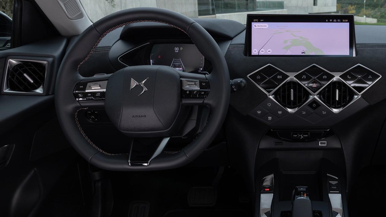 Περνώντας στο εσωτερικό του ανανεωμένου DS 3, τα ποιοτικά υλικά κυριαρχούν. Μαλακά πλαστικά δερμάτινες επενδύσεις και ραφές σε σχήμα ρόμβου κλέβουν την παράσταση, ενώ νέο είναι το σύστημα πολυμέσων IRIS που συνοδεύεται και από στάνταρ έγχρωμη οθόνη αφής 10,3 ιντσών. Οι χώροι είναι ικανοποιητικοί για τέσσερις επιβάτες, ενώ ο χώρος αποσκευών είναι 350 λίτρα. Εργονομικά, το αυτοκίνητο απαιτεί μια εξοικείωση, καθώς οι διακόπτες στην κεντρική κονσόλα για τα παράθυρα, είναι κάτι που είχα να δω από την BMW Σειρά 3 E46 (25 χρόνια πίσω), ενώ η περιμετρική ορατότητα είναι ικανοποιητική.