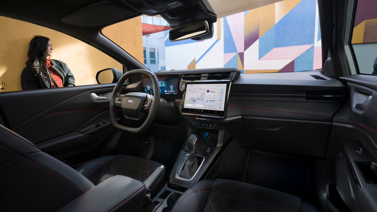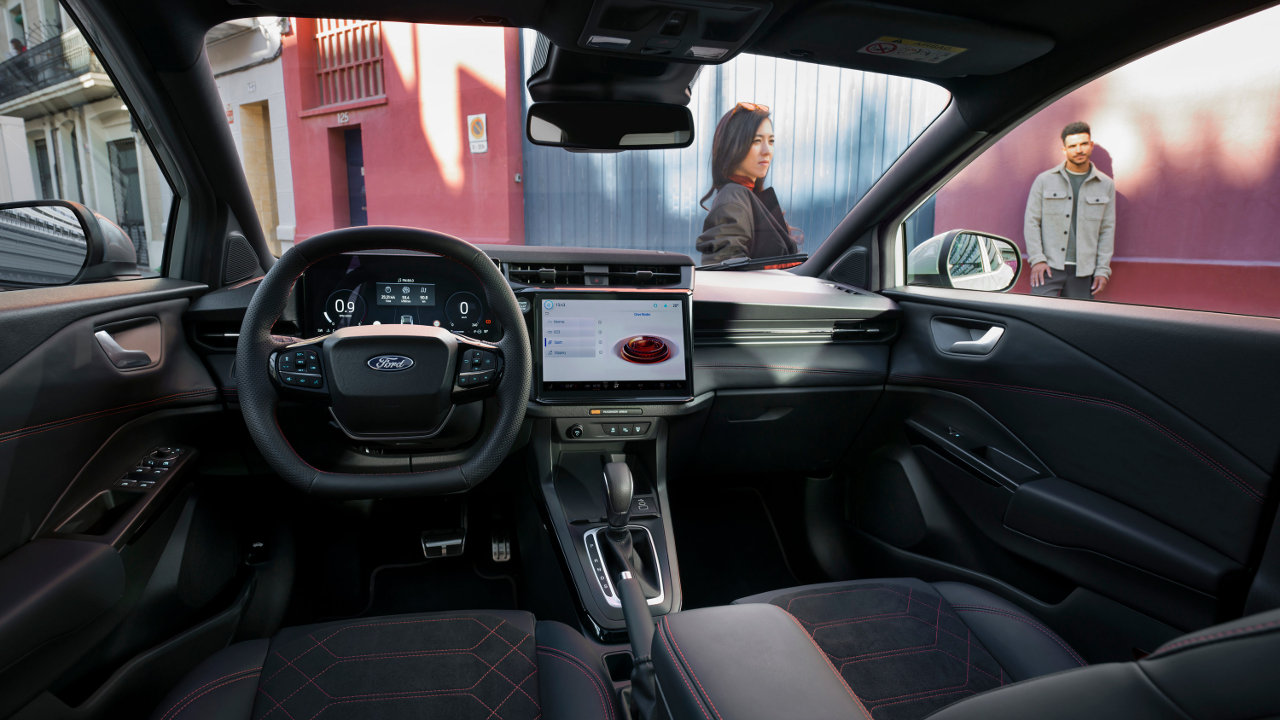 Μπορεί στην εξωτερική εμφάνιση οι διαφοροποιήσεις να είναι περιορισμένες, αλλά κάτι τέτοιο δεν ισχύει στην περίπτωση της καμπίνας. Κατά την είσοδό του στο εσωτερικό, ο οδηγός θα αντιληφθεί κατευθείαν το ολικά ανασχεδιασμένο cockpit. Το τιμόνι είναι ολοκαίνουριο και τετραγωνισμένο, ώστε να προσφέρει “καθαρή” οπτική επαφή με την οθόνη σε ρόλο πίνακα οργάνων που βρίσκεται ακριβώς πίσω του. Η συγκεκριμένη έχει μέγεθος 12,8 ιντσών και παρέχει όλες τις απαραίτητες πληροφορίες. Δίπλα της, βρίσκεται η κεντρική οθόνη αφής μεγέθους 12 ιντσών (λειτουργικό σύστημα SYNC 4), η οποία πλέον είναι “χωνευτή” στο ταμπλό και όχι αιωρούμενη. Μέσω της συγκεκριμένης προσφέρεται δυνατότητα συνδεσιμότητας με ασύρματο τρόπο (Android Auto και Apple CarPlay), ενώ εξαιρετική ήταν η εμπειρία μας από την ανάλυση της κάμερας 360 μοιρών που έχει ενσωματωθεί. Πλέον, ο έλεγχος κάθε λειτουργίας (πχ. ρύθμιση κλιματισμού) γίνεται μέσα από την οθόνη. Ευτυχώς, όμως, εξακολουθεί να υπάρχει “φυσικός” διακόπτης για την ένταση του ήχου. Εντυπωσιακό δε είναι το γεγονός ότι το “ψηφιακό περιβάλλον” που αναφέραμε περιλαμβάνεται από την βασική έκδοση “Titanium” της δοκιμής.