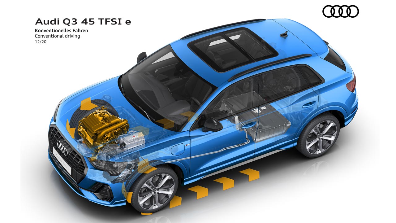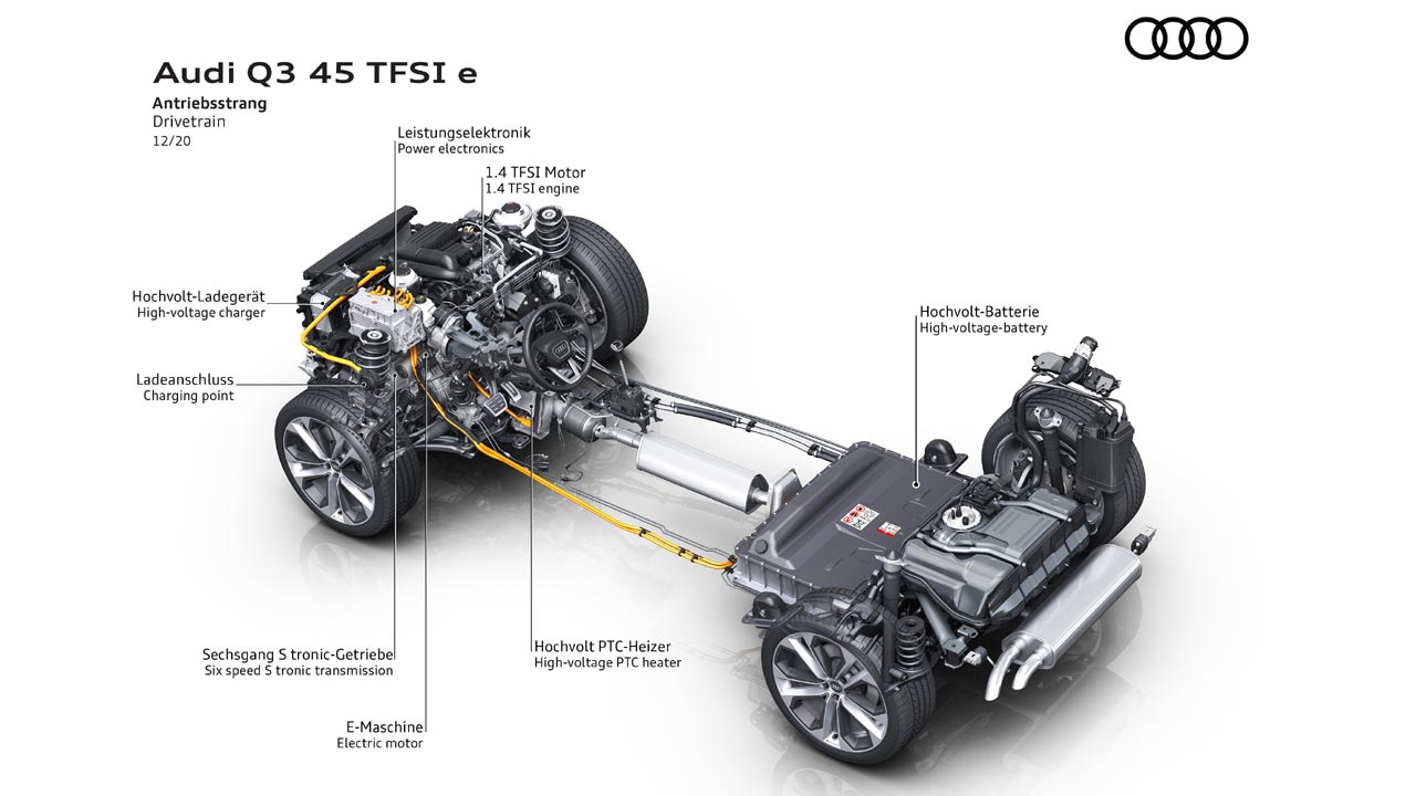 Όπως προανέφερα η συγκεκριμένη έκδοση του Audi Q3 είναι υβριδική και μάλιστα έχει την δυνατότητα φόρτισης από εξωτερική πηγή ενέργειας (πρίζα). Το υβριδικό σύστημα απαρτίζεται από έναν βενζινοκινητήρα 1.4 λτ. TFSI ο οποίος αποδίδει 150 ίππους (5.000 – 6.000 σ.α.λ.) και 250 Nm ροπής (1.550 – 3.500 σ.α.λ.) και συνεργάζεται με αυτόματο κιβώτιο διπλού συμπλέκτη έξι σχέσεων (S tronic). Εκεί ενσωματώνεται και ο ηλεκτροκινητήρας των 116 ίππων. για να προσφέρει συνδυαστικά 245 ίππους και 400 Nm ροπής. Τιμές που χαρίζουν στο γερμανικό SUV 0-100 χλμ./ώρα σε 7,3 δλ. και τελική ταχύτητα 210 χλμ./ώρα. Αποκλειστικά με χρήση ηλεκτρικής ενέργειας, το Audi Q3 έχει τελική ταχύτητα 140 χλμ./ώρα και μπορεί να καλύψει απόσταση μέχρι και 48 χλμ. (στην πράξη έκανα 45 χλμ. μόνο με ρεύμα).
