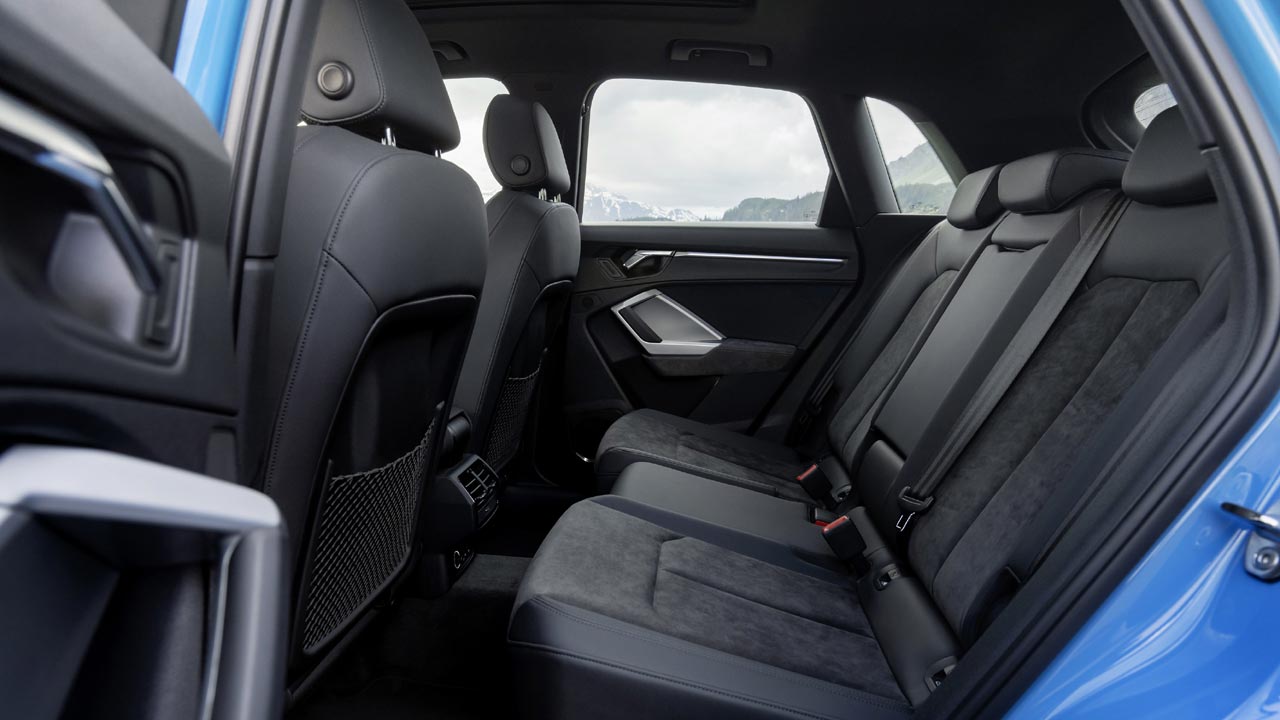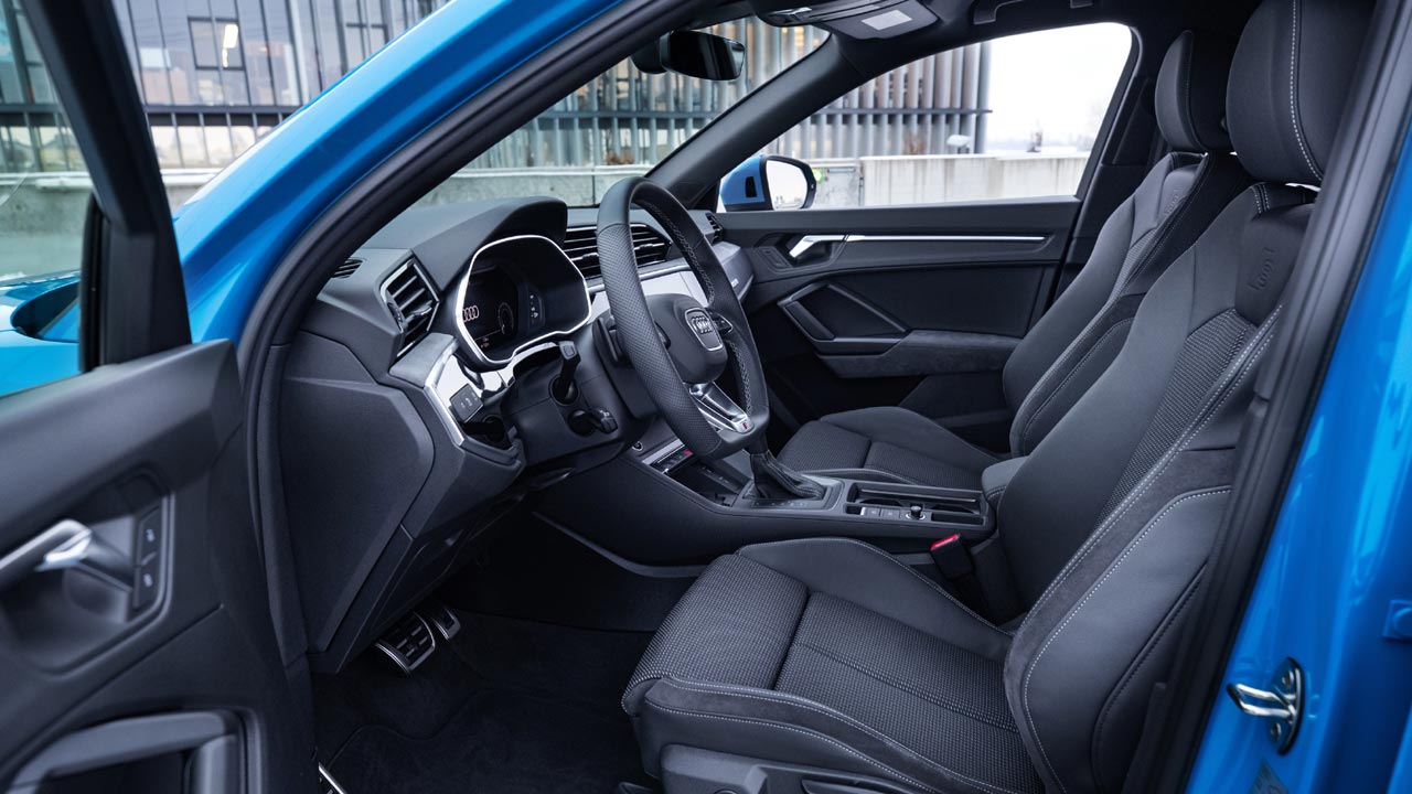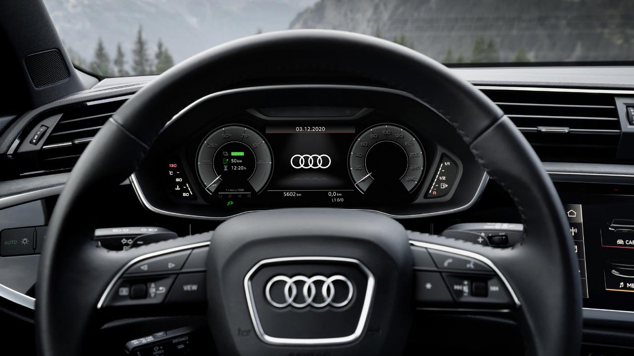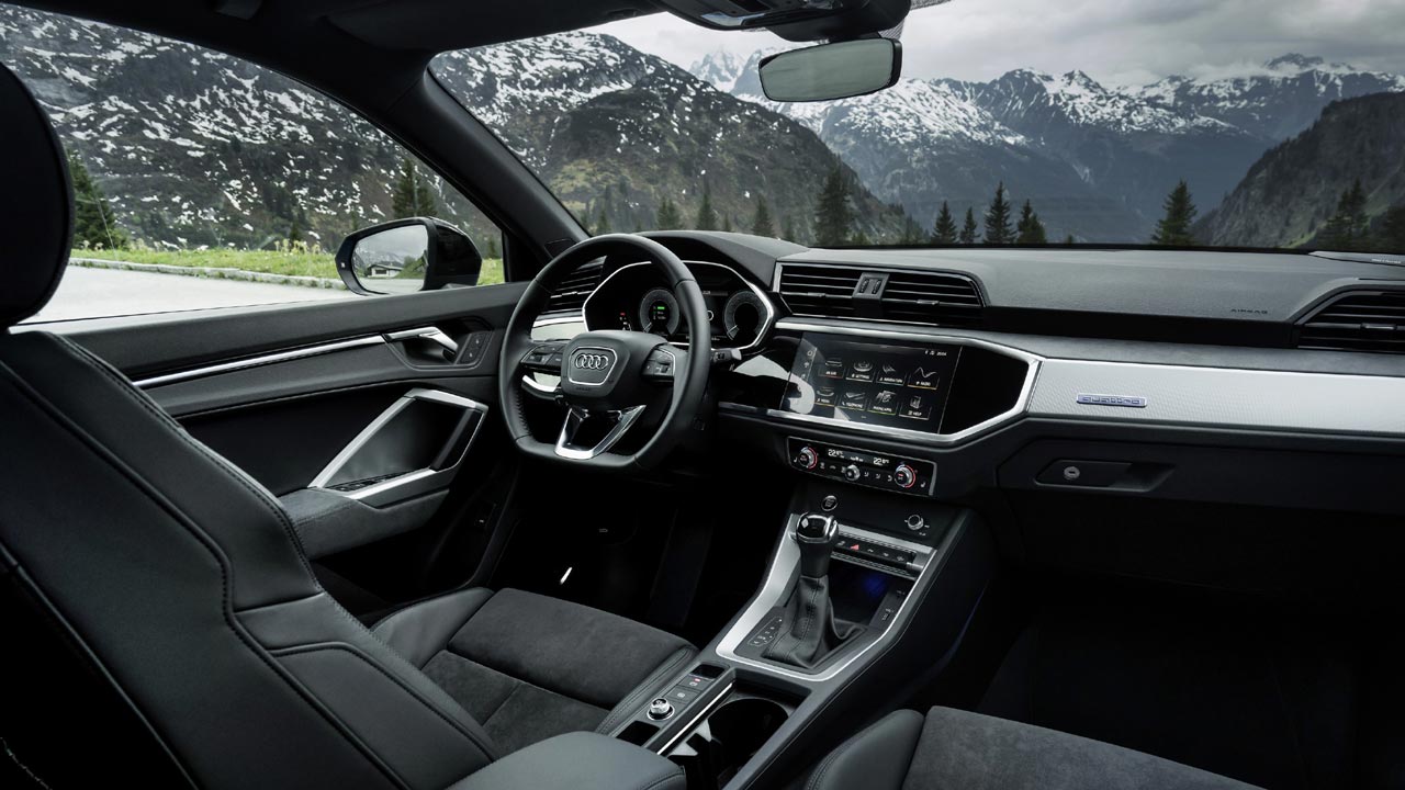 Εντελώς ανασχεδιασμένο είναι και το εσωτερικό του νέου Audi Q3. Το ταμπλό διαιρείται στα δύο, με το άνω μέρος του να περιλαμβάνει τους αεραγωγούς και το κάτω το black-panel με την ψηφιακή οθόνη αφής για το σύστημα πολυμέσων MMI. Ο οδηγοκεντρικός χαρακτήρας του εσωτερικού, τονίζεται από την κλίση 10 μοιρών του ταμπλό προς τον οδηγό, ενώ ο ψηφιακός πίνακας οργάνων των 10.25 ιντσών είναι στα highligts του. Τα υλικά στο εσωτερικό είναι από το… πάνω ράφι. Και στην ευρυχωρία όμως, το νέο Audi Q3 τα καταφέρνει μια χαρά αφού η αύξηση του μεταξονίου κατά 77 χλστ. (πλέον είναι στα 2.680 χλστ.) εξασφάλισε καλύτερη εκμετάλλευση χώρων στο εσωτερικό. Επιπροσθέτως, χάρη στο στάνταρ συρόμενο πίσω κάθισμα κατά 150 χιλιοστά, διαιρούμενο σε αναλογία 40/20/40 και με ρυθμιζόμενη κλίση πλάτης, η πρακτικότητα αυξάνεται κατακόρυφα. Το ίδιο ισχύει και για τον χώρο αποσκευών, ο οποίος είναι στα 380 (μειωμένος λόγω μπαταρίας κατά 155 λίτρα) και με την αναδίπλωση της πίσω σειράς φτάνει στα 1.250 λίτρα. Φυσικά, ο εξοπλισμός του νέου Audi Q3 είναι κορυφαίος, καθώς ακόμη και στην έκδοση με το στάνταρ MMI touch υπάρχει ψηφιακός πίνακας οργάνων με οθόνη διαγώνιου 10,25 ιντσών και οθόνη αφής 8,8 ιντσών που βρίσκεται στο κέντρο του ταμπλό. Στην κορυφαία έκδοση εξοπλισμού MMI navigation plus η οθόνη είναι 10,1 ίντσες και προαιρετικά ο πίνακας οργάνων 10,25 ιντσών μπορεί να αναβαθμιστεί στις 12,3 ίντσες (όπως αυτός του αυτοκινήτου της δοκιμής μας).