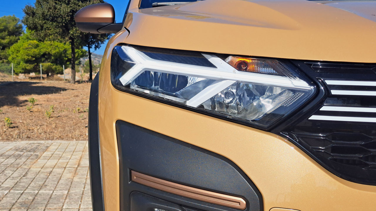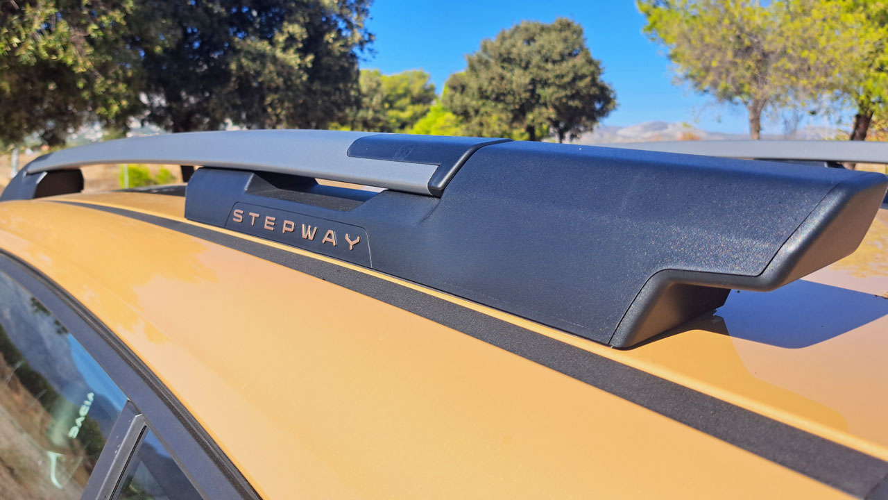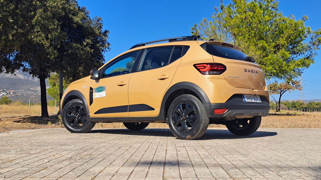 Ξεκινώντας από την εξωτερική εμφάνιση του Dacia Sandero Stepway, το οποίο στην πλούσια έκδοση “Extreme” της δοκιμής έρχεται με αρκετές ενδιαφέρουσες λεπτομέρειες. Για παράδειγμα, οι καθρέπτες έχουν μία καφέ απόχρωση, υπάρχουν προστατευτικά αυτοκόλλητα με το σήμα της Dacia στο πλαϊνό τμήμα, αλλά και ζάντες 16 ιντσών σε απόχρωση “Mahalia Dark” (διάσταση ελαστικών 205/60) που δημιουργούν μία εντυπωσιακή εμφάνιση. Εννοείται ότι δεν απουσιάζουν και τα γνωστά crossover στοιχεία, όπως για παράδειγμα η αυξημένη απόσταση από το έδαφος (201 χλστ.), οι ράγες στην οροφή και οι πλαστικές επενδύσεις στο κάτω τμήμα του αμαξώματος. Αναφορικά με τις διαστάσεις, το Dacia Sandero Stepway έχει μήκος 4.099 χλστ., πλάτος 1.848 και ύψος 1.587 χλστ. (με τις ράγες).