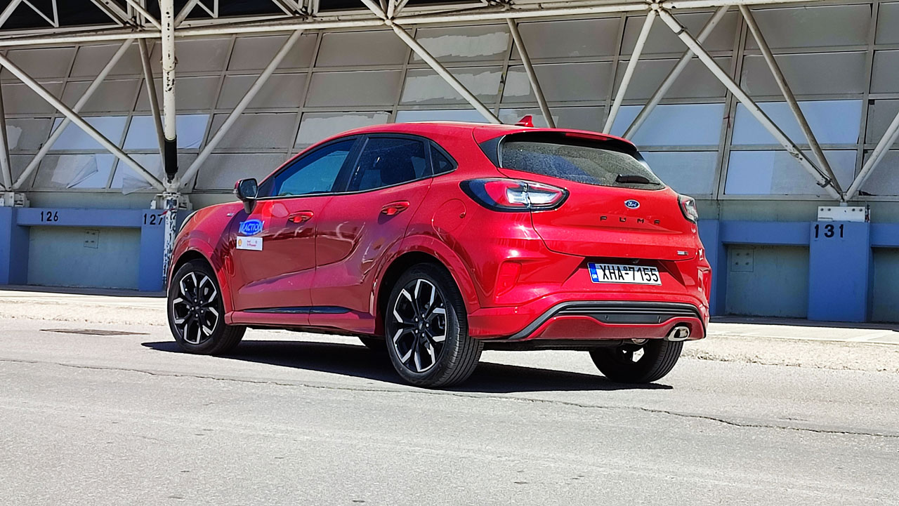 Ο υπερτοφοδοτούμενος 1.000άρης Ecoboost της Ford έχει αποδείξει την αξία του σε πολλά μοντέλα της εταιρείας. Στην κορυφαία έκδοση του Puma, η απόδοση του ανέρχεται στους 155 ίππους και τα 220 Nm, ενώ δεν απουσιάζει και το ήπια υβριδικό σύστημα που μειώνει την κατανάλωση έως και 9% σύμφωνα με τη Ford. Το μικρό ηλεκτρικό μοτέρ αντικαθιστά και την παραδοσιακή μίζα λειτουργώντας ως Start/Stop, “συνεργάζεται” με το μοτέρ εσωτερικής καύσης μέσω ιμάντα, ενώ ανακτά και αποθηκεύει ενέργεια κατά την επιβράδυνση σε μια μικρή μπαταρία ιόντων λιθίου που το συνοδεύει. Στην προκειμένη περίπτωση, το μοτέρ συνεργάζεται με χειροκίνητο σασμάν έξι σχέσεων και η κίνηση περνά ασφαλώς στον εμπρός άξονα. Η Ford αναφέρει κατανάλωση 5,6-5,7 λίτρων ανά 100 χλμ. στον συνδυασμένο κύκλο κατά το πρότυπο WLTP, ενώ εμείς στη διάρκεια της δοκιμής είδαμε την μέση τιμή να διαμορφώνεται στα 7,2 λτ./100 χλμ. Στο κομμάτι των επιδόσεων, τα 0-100 έρχονται σε εννέα δευτερόλεπτα και η τελική ταχύτητα αγγίζει τα 200 χλμ./ώρα.