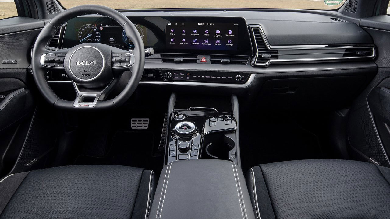 Ιδιαίτερα σύγχρονη είναι και η καμπίνα του νέου Kia Sportage. Στην κεντρική κονσόλα υπάρχει μία οθόνη αφής μεγέθους 12,3 ιντσών, η οποία είναι στραμμένη προς τη μεριά του οδηγού (φέρει σύστημα πλοήγησης, συνδεσιμότητα Android Auto / Apple CarPlay), ενώ σε ρόλο πίνακα οργάνων συναντάμε ψηφιακή οθόνη επίσης 12,3 ιντσών. Οι δύο οθόνες δημιουργούν ένα ενιαίο, κυρτό πάνελ. Λίγο πιο χαμηλά, συναντάμε ακόμα ένα, μικρότερο πάνελ μέσα από το οποίο οι εμπρός επιβάτες μπορούν ελέγξουν εύκολα τις σημαντικότερες λειτουργίες του infotainment και του κλιματισμού. Πρόκειται για μία πρακτική εφαρμογή που βοηθά τον οδηγό να μην τραβά το βλέμμα από τον δρόμο.