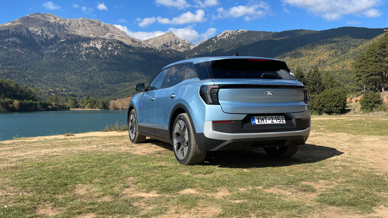 Έφτασε η ώρα για την πρώτη μας επαφή μαζί του, η οποία έγινε στην έκδοση με την μεγάλη μπαταρία και την κίνηση στον πίσω άξονα. Πάμε να το γνωρίσουμε πιο αναλυτικά, αλλά και να μεταφέρουμε τις εντυπώσεις μας από την μικρή εξόρμηση μέχρι τη λίμνη Δόξα. Ξεκινάμε όπως πάντα με την εξωτερική του εμφάνιση, η οποία πλέον παραπέμπει σε SUV της μεσαίας κατηγορίας. Στο εμπρός τμήμα του ολοκαίνουριου Ford Explorer συναντάμε LED σώματα και την κλειστή μάσκα που “μαρτυρά” την ηλεκτρική φύση του οχήματος. Το πίσω μέρος είναι ιδιαίτερα μοντέρνο και ξεχωρίζει η LED μπάρα που ενώνει τα φωτιστικά σώματα, ενώ “sportive” φιλοσοφία προσδίδει και η ενσωματωμένη στο αμάξωμα αεροτομή. Εννοείται ότι από το “περιπετειώδες” Ford Explorer δεν απουσιάζουν τα crossover στοιχεία, όπως για παράδειγμα η αυξημένη απόσταση από το έδαφος, αλλά και οι πλαστικές επενδύσεις στο κάτω τμήμα του αμαξώματος. Αναφορικά με τις διαστάσεις, το μήκος του νέου Ford Explorer αγγίζει τα 4.468 χλστ., το πλάτος τα 1.871 και το ύψος τα 1.630 χλστ.