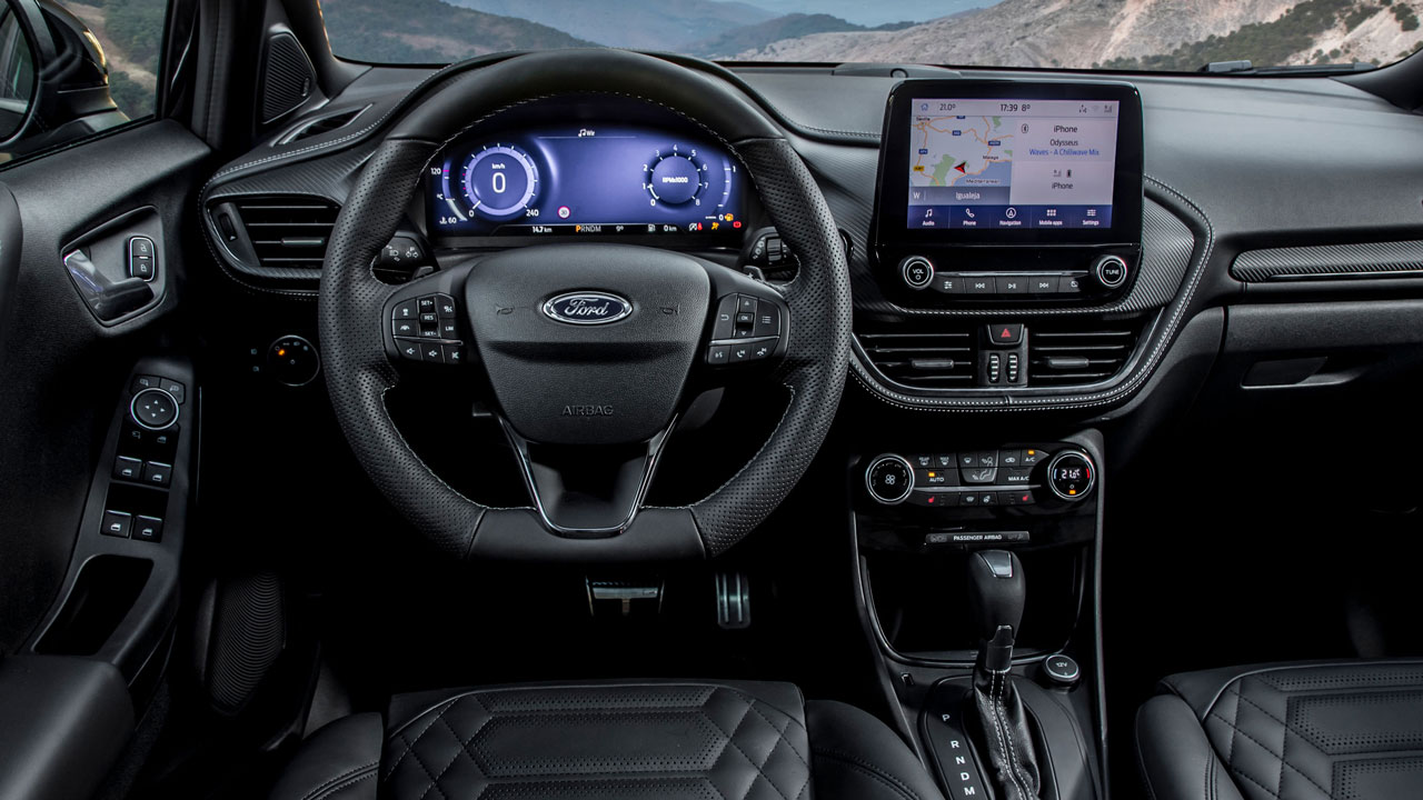 Το γνώριμο εσωτερικό του Puma προέρχεται σε μεγάλο βαθμό από το Fiesta, πάνω στο οποίο άλλωστε “πατάει” το μικρό crossover. H ποιότητα κατασκευής βρίσκεται σε υψηλά επίπεδα, ενώ στην έκδοση δοκιμής ST-Line X ξεχωρίζουν οι επενδύσεις των σπορ καθισμάτων με τις κόκκινες ραφές που κάνουν την εμφάνιση τους στο τιμόνι, στον επιλογέα, στο χειρόφρενο και τις πόρτες. Σε αυτή την έκδοση ο οδηγός επωφελείται από έναν έγχρωμο TFT πίνακα-οθόνη με διαγώνιο στις 12,3 ίντσες που αλλάζει τα γραφικά αλλά και τον τρόπο παρουσίασης των πληροφοριών ανάλογα με το επιλεγμένο προφίλ οδήγησης (Normal, Sport, Trail, Slippery και Eco) δίνοντας κάθε φορά προτεραιότητα σε διαφορετικά δεδομένα. Δίπλα του, στο κέντρο του ταμπλό βρίσκεται η οθόνη αφής 8 ιντσών του συστήματος πολυμέσων SYNC 3 της Ford, το οποίο με την ανάλογη εφαρμογή στο κινητό σας (Ford Pass), και εφόσον στον εξοπλισμό συγκαταλέγεται και το αυτόματο κιβώτιο σχέσεων, επιτρέπει και απομακρυσμένο έλεγχο του Puma, όπως την εκκίνηση του μοτέρ, τη χρήση του κλιματιστικού για τη ρύθμιση της θερμοκρασίας σε ιδανικά επίπεδα, ενώ παρέχει και χρήσιμες συμβουλές, όπως τον έλεγχο αυτονομίας και πίεσης ελαστικών.
