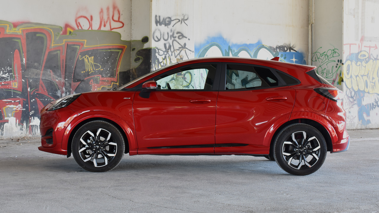 Στο αισθητικό επίπεδο, το Ford Puma χαρακτηρίζεται από τα “sportive” στοιχεία του, ειδικά στην προκειμένη περίπτωση που εξοπλίζεται με το πακέτο ST-Line, γεγονός που επιβεβαιώνεται και με την σχετική σήμανση στο πλαϊνό τμήμα. Στο εμπρός τμήμα συναντάμε LED φωτιστικά σώματα, ομοίως και στο πίσω, ενώ οι ζάντες αλουμινίου είναι μεγέθους 17 ιντσών. Λόγω του ST-Line πακέτου, το Ford Puma της δοκιμής φέρει τον χαρακτηριστικό εμπρός προφυλακτήρα με το σκουρόχρωμο πλαίσιο, ενώ στο πίσω μέρος συναντάμε διαχύτη στο χρώμα του αμαξώματος, χρωμιωμένη απόληξη της εξάτμισης και μία διακριτική αεροτομή. Το αμάξωμα αγγίζει σε μήκος τα 4.186 χλστ., σε πλάτος τα 1.930 χλστ., σε ύψος τα 1.537, ενώ το βάρος διαμορφώνεται στα 1.280 κιλά.