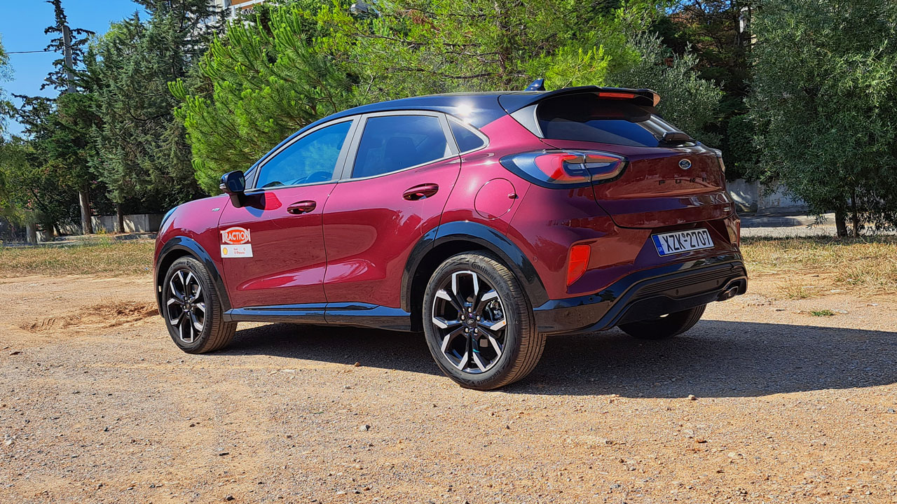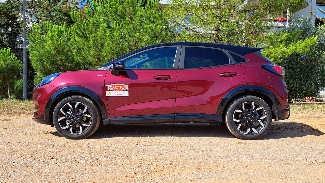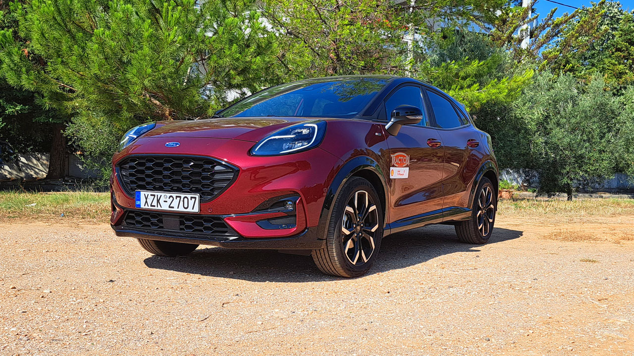Ο υπερτοφοδοτούμενος 1.000άρης Ecoboost της Ford έχει αποδείξει την αξία του σε πολλά μοντέλα της εταιρείας. Στην κορυφαία έκδοση του Puma, η απόδοση του ανέρχεται στους 155 ίππους και τα 220 Nm, ενώ δεν απουσιάζει και το ήπια υβριδικό σύστημα που μειώνει την κατανάλωση έως και 9% σύμφωνα με τη Ford. Το μικρό ηλεκτρικό μοτέρ αντικαθιστά και την παραδοσιακή μίζα λειτουργώντας ως Start/Stop, “συνεργάζεται” με το μοτέρ εσωτερικής καύσης μέσω ιμάντα, ενώ ανακτά και αποθηκεύει ενέργεια κατά την επιβράδυνση σε μια μικρή μπαταρία ιόντων λιθίου που το συνοδεύει. Στην προκειμένη περίπτωση, το μοτέρ συνεργάζεται με χειροκίνητο σασμάν έξι σχέσεων και η κίνηση περνά ασφαλώς στον εμπρός άξονα. Η Ford αναφέρει κατανάλωση 5,6-5,7 λίτρων ανά 100 χλμ. στον συνδυασμένο κύκλο κατά το πρότυπο WLTP, ενώ εμείς στη διάρκεια της δοκιμής είδαμε την μέση τιμή να διαμορφώνεται στα 7,2 λτ./100 χλμ. Στο κομμάτι των επιδόσεων, τα 0-100 έρχονται σε εννέα δευτερόλεπτα και η τελική στα 200 χλμ./ώρα.