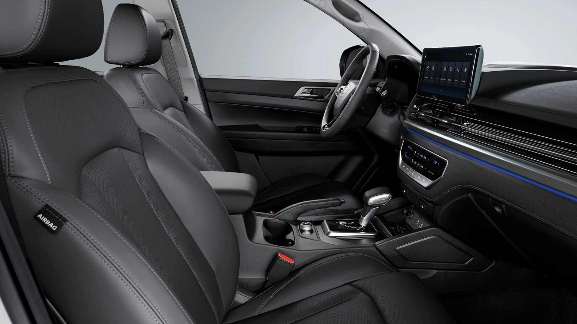 Περνώντας στο εσωτερικό του KGM Musso Grand, ο οδηγός κατευθείαν θα διαπιστώσει ότι πρόκειται για ένα αυτοκίνητο που δεν έχει να ζηλέψει τίποτα από ένα τυπικό μοντέλο της C-SUV κατηγορίας. Όλες οι σύγχρονες τεχνολογίες βρίσκονται εκεί και το ψηφιακό περιβάλλον αποτελείται από μία κεντρική οθόνη αφής μεγέθους 12,3 ιντσών σε ρόλο infotainment (ασύρματη συνδεσιμότητα Android Auto και Apple CarPlay). Μία δεύτερη οθόνη βρίσκεται πίσω από το τιμόνι και προσφέρει όλες τις απαραίτητες πληροφορίες στον οδηγό. Στην πλούσια έκδοση της δοκιμής συναντάμε μεταξύ άλλων θερμαινόμενα εμπρός καθίσματα και θερμαινόμενο τιμόνι. Κάτω από το infotainment συναντάμε ένα πρακτικό πάνελ για την ρύθμιση του κλιματισμού, ενώ στο κεντρικό τούνελ υπάρχει ο επιλογέας του αυτόματου κιβωτίου, ο περιστροφικός διακόπτης για την επιλογή προγράμματος τετρακίνησης (4L, 4H και 2H) και το “παραδοσιακό” χειρόφρενο με ντίζα. Οι χώροι για μικροαντικείμενα είναι αρκετοί μέσα στην καμπίνα, ενώ στα πίσω καθίσματα θα βολευτούν άνετα δύο ενήλικες.
