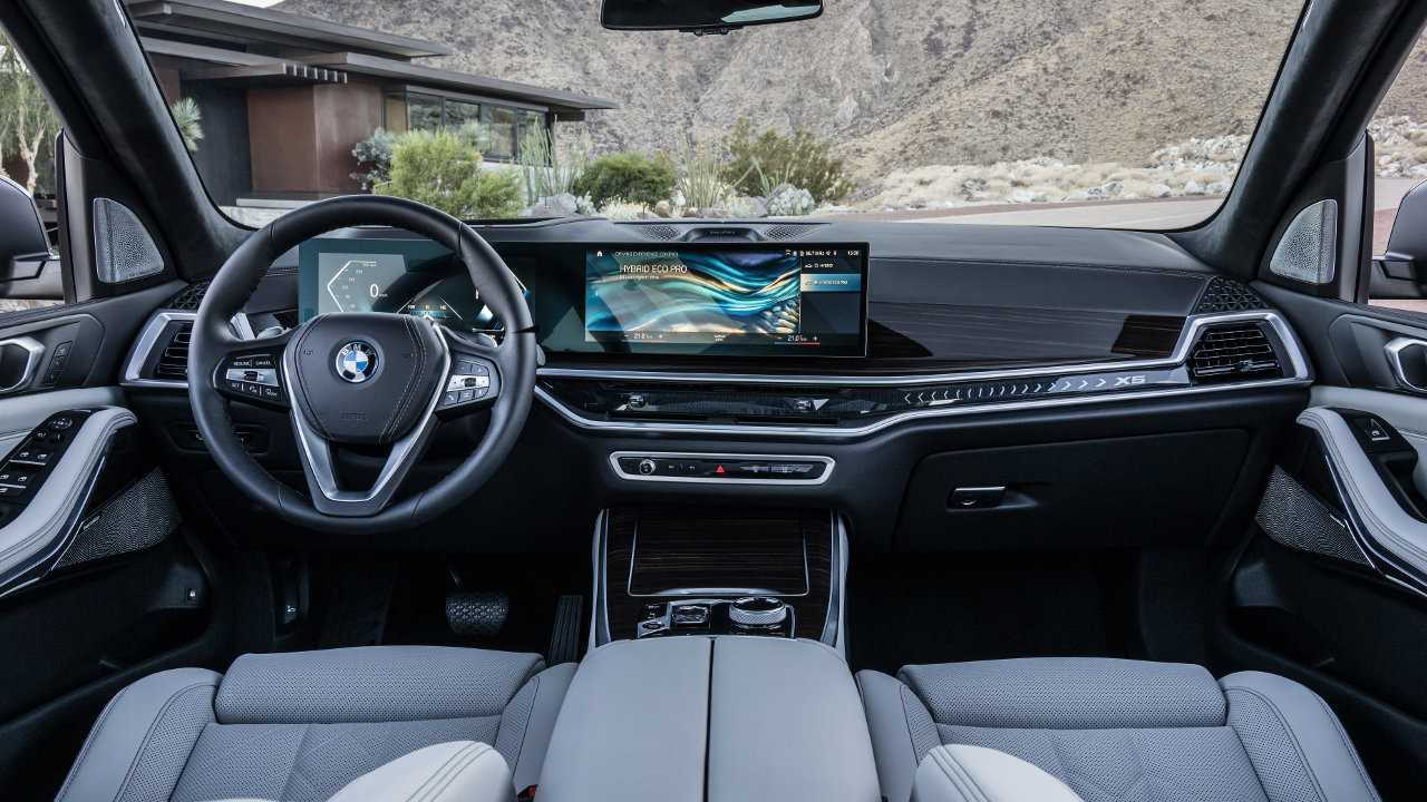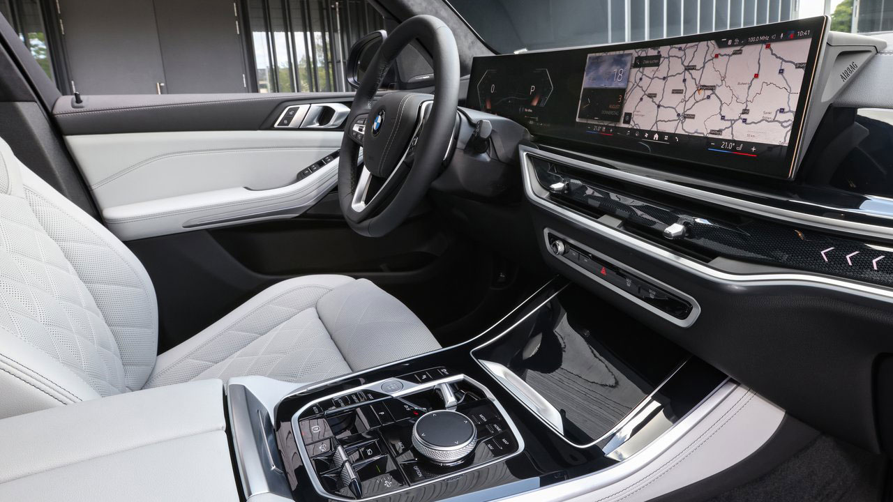Περνώντας στο εσωτερικό, η καμπίνα της ανανεωμένης BMW X5 έχει δεχτεί επίσης αλλαγές. Η ενσωμάτωση του BMW Operating System 8 και της τελευταίας γενιάς του συστήματος ελέγχου/λειτουργίας iDrive έφεραν μαζί τους την κυρτή οθόνη BMW Curved Display. Η BMW Curved Display αποτελείται από μια οθόνη πληροφοριών 12,3 ιντσών πίσω από το τιμόνι και μια οθόνη ελέγχου με διαγώνιο 14,9 ιντσών – και οι δύο βρίσκονται πίσω από μια ενιαία γυάλινη επιφάνεια. Η λειτουργία αφής της οθόνης ελέγχου έχει επιφέρει σημαντική μείωση του αριθμού των κουμπιών και των διακοπτών προς όφελος του ψηφιακού ελέγχου για πολλές λειτουργίες. Μέσα από αυτήν γίνονται κυριολεκτικά τα πάντα, από τον έλεγχο του κλιματισμού και των προγραμμάτων οδήγησης, μέχρι την προβολή της 360 μοιρών κάμερας και της συνδεσιμότητας (Android Auto / Apple CarPlay). Ένα άλλο νέο χαρακτηριστικό είναι η μπάρα φωτισμού περιβάλλοντος με εντυπωσιακό κρυφό φωτισμό LED, ενσωματωμένο κάτω από την επένδυση στην περιοχή του συνοδηγού. Η σχετική επιγραφή του μοντέλου – “X5” – προστίθεται στο γραφικό της μπάρας φωτισμού. Ο πίνακας ελέγχου στην κεντρική κονσόλα περιλαμβάνει πρόσθετες επιφάνειες αφής και έναν νέας σχεδίασης επιλογέα ταχυτήτων.