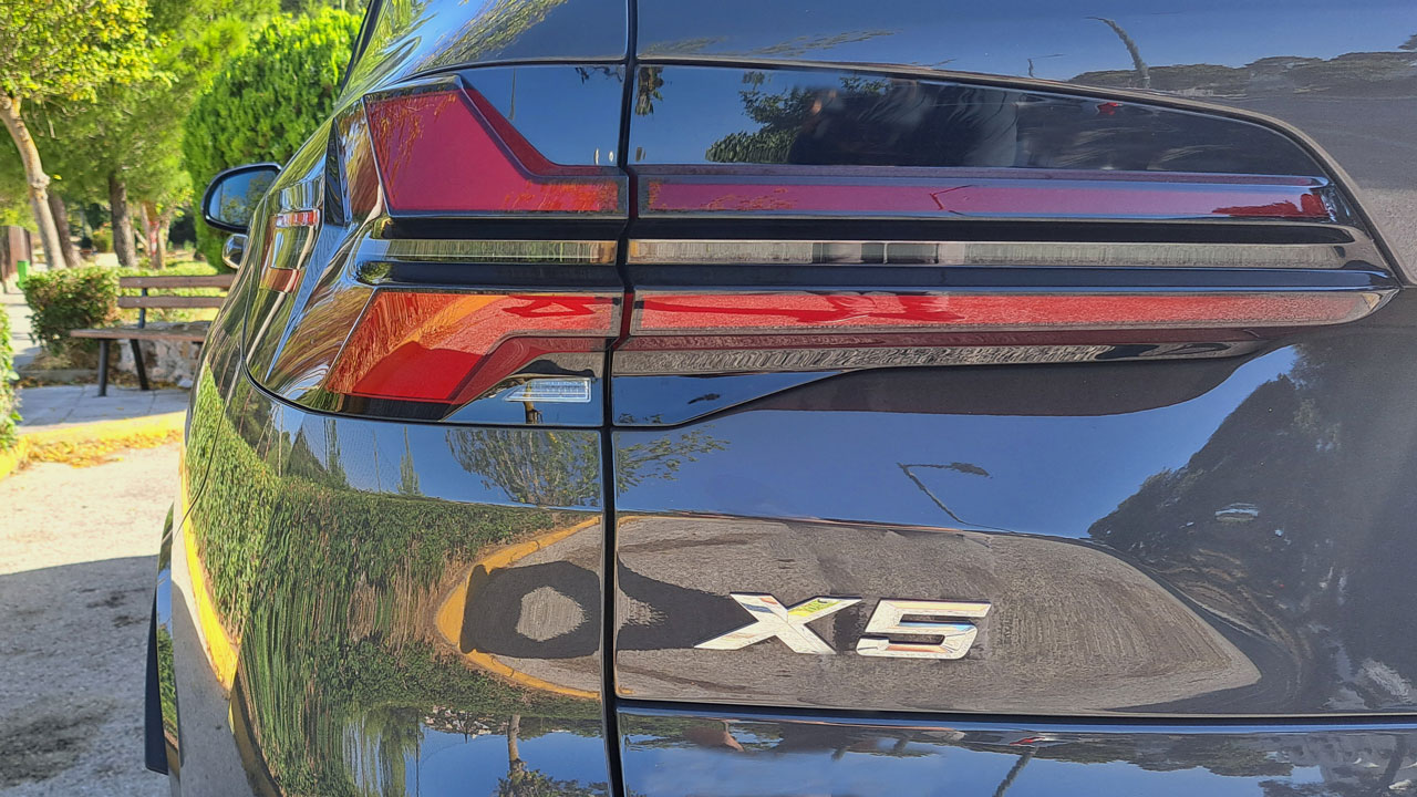 Κατά την ανανέωση του του μεγάλο SUV της γερμανικής εταιρείας απέκτησε ανασχεδιασμένα φωτιστικά σώματα εμπρός και πίσω, τα οποία τονίζουν ακόμη περισσότερο την δυναμική σχεδίαση του αμαξώματος. Επίσης, μπροστά αναθεωρημένη παρουσιάζεται η χαρακτηριστική μάσκα νεφρών της BMW, ενώ δεν γίνεται να μην αναφερθούμε στο BMW Iconic Glow, είναι τα φωτιζόμενα “νεφρά” στο εμπρός τμήμα που κάνουν την BMW X5 να ξεχωρίζει τη νύχτα. Το μοντέλο της δοκιμής μας γίνεται ακόμα πιο ιδιαίτερο με τις M πινελιές, όπως για παράδειγμα τα σχετικά λογότυπα σε αρκετά σημεία του αμαξώματος, αλλά και οι εντυπωσιακές ζάντες μεγέθους 21 ιντσών παρακαλώ! Οι πιο παρατηρητικοί θα δουν τα δύο στοιχεία που “μαρτυρούν” ότι εδώ έχουμε να κάνουμε με Plug-In υβριδικό μοντέλο. Το ένα είναι η σχετική υποδοχή φόρτισης και το άλλο είναι το xDrive50e που αναγράφεται στο πίσω μέρος. Αναφορικά με τις διαστάσεις, αυτές “προμηνύουν” ότι έχουμε να κάνουμε με ένα “Made in US” όχημα. Το μήκος αγγίζει τα 4.935 χλστ., το πλάτος τα 2.004 και το ύψος τα 1.755 χλστ.