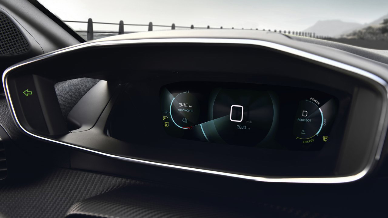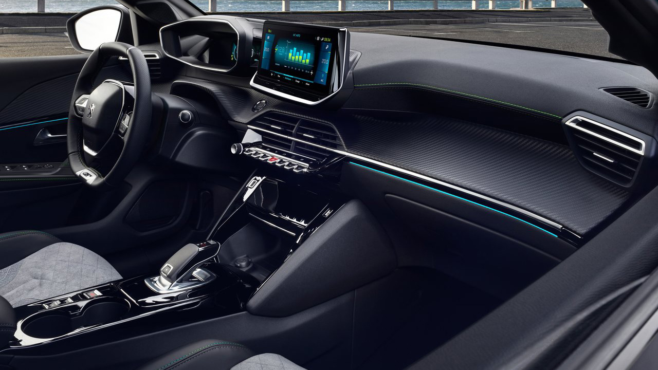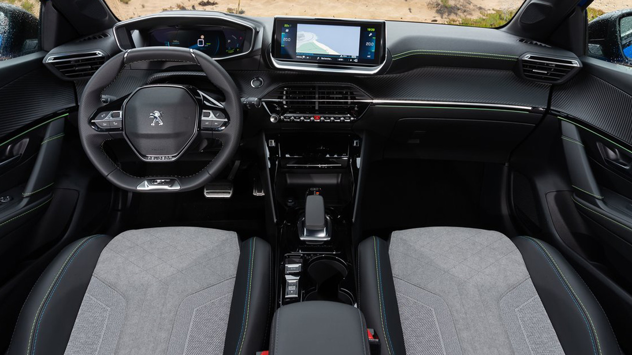 Περνώντας στην καμπίνα του νέου Peugeot e-208 γίνεται άμεσα εμφανής η προσπάθεια της γαλλικής εταιρείας να δώσει έναν σπορ τόνο στο τεχνολογικά προηγμένο περιβάλλον, χωρίς να κάνει “εκπτώσεις” στην ποιότητα. Μόλις βρέθηκα στη θέση του οδηγού, δύο ήταν τα πράγματα που με εντυπωσίασαν. Τα καθίσματα με την κορυφαία πλευρική στήριξη της έκδοσης GT (καθίσματα τύπου Dynamique τα ονομάζει η Peugeot) και η εντυπωσιακή οθόνη σε ρόλο πίνακα οργάνων. Πρόκειται για το PEUGEOT i-Cockpit με τρισδιάστατη απεικόνιση και μέγεθος που φτάνει τις 10 ίντσες, μέσα από το οποίο ο οδηγός λαμβάνει όλες τις απαραίτητες ενδείξεις του αυτοκινήτου στο ψηφιακό περιβάλλον που θα επιλέξει. Στην κεντρική κονσόλα υπάρχει μία ακόμα οθόνη για την ενημέρωση και ψυχαγωγία των επιβατών. Μέσω αυτής ελέγχονται στοιχεία του ηλεκτρικού συστήματα (πχ. αυτονομία και κατανάλωση), ο κλιματισμός, ενώ εκτός των άλλων προβάλλονται το σύστημα πλοήγησης και η κάμερα οπισθοπορείας. Το μέγεθός της φτάνει τις 10 ίντσες στην έκδοση δοκιμής και ο έλεγχος γίνεται εύκολα από τους καλαίσθητους διακόπτες αεροπορικού τύπου. Η ποιότητα των επενδύσεων είναι κορυφαία για την κατηγορία και στις περισσότερες επιφάνειες συναντάμε μαλακές επενδύσεις. Επιπλέον, η συνολική εμπειρία αναβαθμίζεται από τον ατμοσφαιρικό φωτισμό και τις αλουμινένιες επενδύσεις.