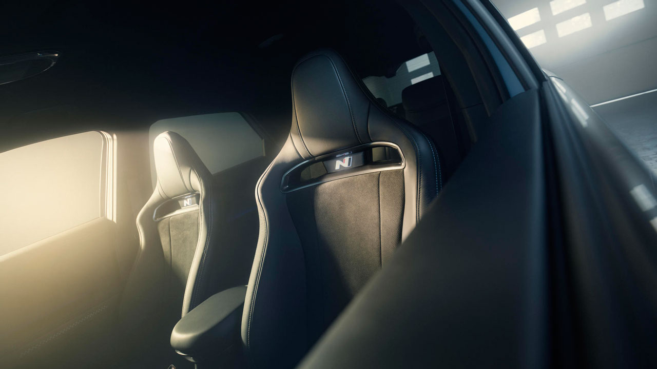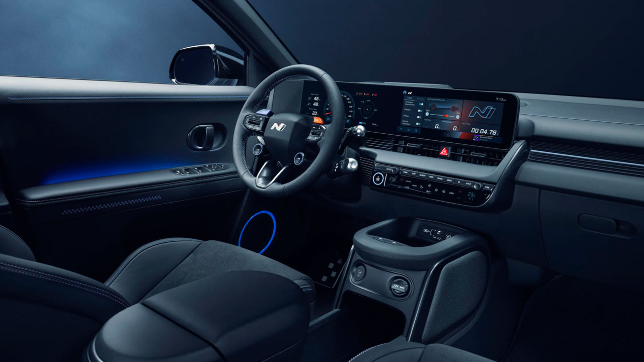 Περνώντας στην καμπίνα του Hyundai Ioniq 5 N βλέπουμε ότι η πρακτικότητα του απλού μοντέλου εξακολουθεί να υφίσταται. Υπάρχει άπλετος χώρος για πέντε επιβάτες, επαρκής χώρος για τα πόδια στην πίσω σειρά (απουσιάζει το κεντρικό τούνελ στο πάτωμα), ενώ πολλές είναι και θήκες για μικροαντικείμενα. Τα πίσω καθίσματα είναι επίσης συρόμενα, ώστε να αυξάνεται ο χώρος για αποσκευές, με τον τελευταίο να αγγίζει τα 480 λίτρα. Το Hyundai Connected Car Navigation Cockpit (ccNC) βρίσκεται στο επίκεντρο με ένα συνδυασμό οθόνης infotainment 12,3 ιντσών και ψηφιακής οθόνης 12,3 ιντσών πίσω από το τιμόνι σε ρόλο πίνακα οργάνων. Επιπλέον, το IONIQ 5 N προσφέρει ένα Head-Up Display που παρουσιάζει βασικές πληροφορίες, όπως για παράδειγμα την πλοήγηση. Πέρα από τις οθόνες, υπάρχουν πολλές θύρες φόρτισης για εμπρός και πίσω επιβάτες, αλλά και ένα πάνελ για την ασύρματη φόρτιση συσκευής.