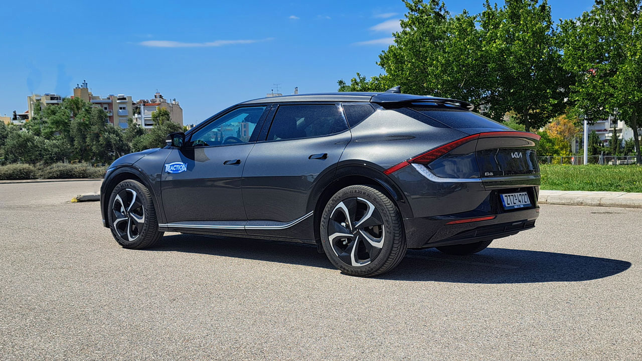 Όσο για την σχεδίαση, είναι άκρως φουτουριστική και μαγνητίζει τα βλέμματα, κάτι που το αντιλαμβάνεται κανείς από τις αντιδράσεις του κόσμου στην θέα του μοντέλου. Το εμπρός τμήμα είναι ιδιαίτερα δυναμικό, κυρίως λόγω των δύο έντονων νεύρων στο καπό και των LED εμπρός φωτιστικών σωμάτων. Πηγαίνοντας προς το πίσω μέρος, η σχεδίαση γίνεται όλο και πιο “τολμηρή”, με στοιχεία όπως οι “κρυφές” χειρολαβές, το κεκλιμένο πίσω μέρος με coupe φιλοσοφία και οι μεγάλες ζάντες αλουμινίου 20 ιντσών. Σίγουρα, όμως, το πιο εντυπωσιακό τμήμα είναι το πίσω, εκεί που υπάρχει μία αεροτομή στο επάνω μέρος, η LED λωρίδα που γεφυρώνει τα φωτιστικά σώματα, το μεγάλο λογότυπο της Kia και ασφαλώς η ηλεκτρικά ανοιγόμενη υποδοχή για φόρτιση.