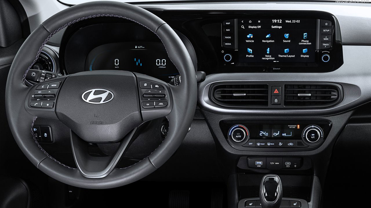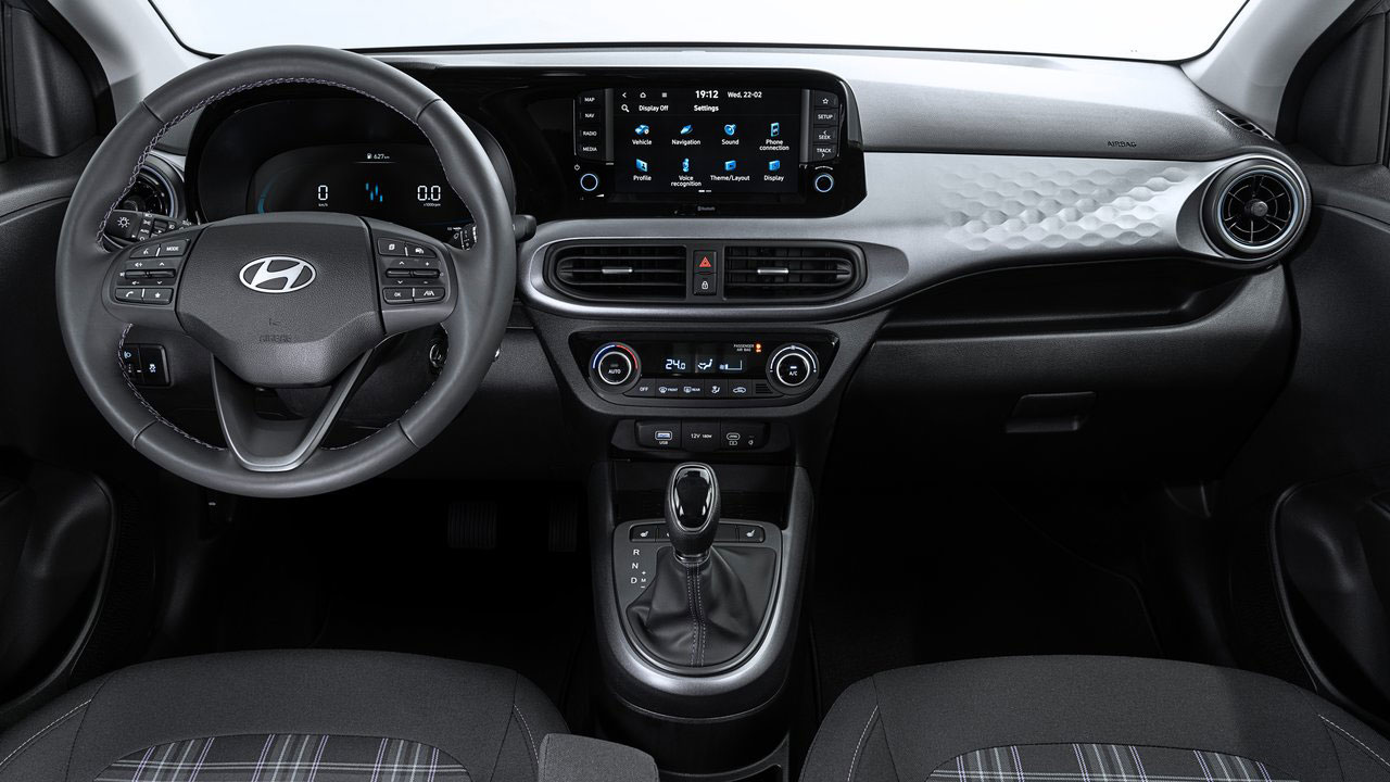 Πέρα από τις εξωτερικές αλλαγές, αέρας ανανέωσης “φύσηξε” και στην καμπίνα του Hyundai i10. Ενδεικτικά, έχει εγκατασταθεί μπλε φωτισμός που κάνει την καμπίνα πιο ατμοσφαιρική τη νύχτα, ενώ γκρι λεπτομέρειες συναντάμε στο ταμπλό και στις επενδύσεις των καθισμάτων. Σε επίπεδο τεχνολογίας, το Hyundai i10 εξοπλίζεται με οθόνη έως 8 ίντσες στο κέντρο της κονσόλας, η οποία εκτός των άλλων εξοπλίζεται και με ασύρματα Android Auto / Apple CarPlay. Μία νέα οθόνη βρίσκεται επίσης πίσω από το τιμόνι σε ρόλο πίνακα οργάνων και το μέγεθός της αγγίζει τις 4,2 ίντσες. Σε επίπεδο χώρων, όπως και στο απερχόμενο μοντέλο, ο όγκος αγγίζει τα 252 λτ. και με τα αναδιπλούμενα καθίσματα φτάνει έως τα 1.050 λτ. Αναφορικά με την πρακτικότητα, αξίζει να αναφερθούμε στις μεγάλες τσέπες των θυρών, αλλά και στις ποτηροθήκες, οι οποίες βρίσκονται σε σημείο που δεν εμποδίζει την πρόσβαση στον επιλογέα. Ιδιαίτερος χώρος αποθήκευσης ανάμεσα σε οδηγό και συνοδηγό δεν υπάρχει (λόγω μηχανικού χειρόφρενου), χωρίς ωστόσο να απουσιάζει ο “τεμπέλης” που είναι ενσωματωμένος στο κάθισμα του οδηγού.