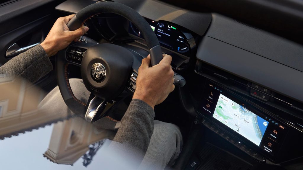 Στο εσωτερικό, σε αντίθεση με το trend της εποχής, δεν σε κερδίζει η οθόνη αλλά το τριάκτινο τιμόνι. Ο σχεδιασμός είναι οδηγοκεντρικός και η κεντρική οθόνη των 10,25 ιντσών είναι στραμμένη προς τον οδηγό. Ψηφιακή είναι και η οθόνη στην θέση του πίνακα οργάνων διαγωνίου 10,1 ιντσών. Τα υλικά είναι ευχάριστα στην όψη και πείθουν με το φινίρισμά τους. Στον τομέα των χώρων η Junior τα πάει πολύ καλά, τόσο για τους επιβάτες όσο και για τις αποσκευές (415 λίτρα), έχοντας και αρκετές θήκες για μικροαντικείμενα στο εσωτερικό.