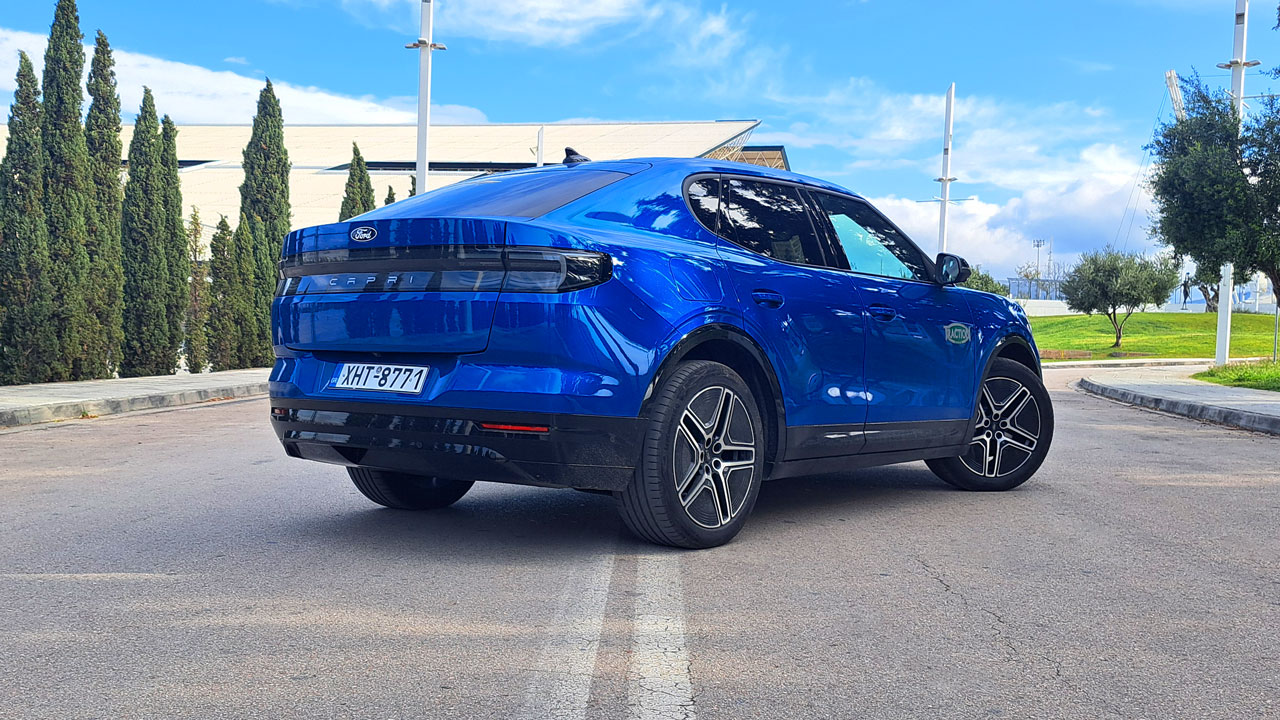 Η πισωκίνητη έκδοση του νέου Ford Capri που είναι και αυτή της δοκιμής μας, φέρει μπαταρία 77 kWh και ηλεκτροκινητήρα 286 ίππων και 545 Nm με τα 0-100 χλμ./ώρα να επιτυγχάνονται σε 6,4 δευτερόλεπτα και την τελική να φτάνει τα 180 χλμ./ώρα. Σε αυτή την περίπτωση η αυτονομία φτάνει έως και τα 627 χιλιόμετρα με μία φόρτιση. Το νέο Capri φέρει ενσωματωμένο φορτιστή ΑC 11 kW και υποστηρίζει επίσης ταχεία φόρτιση DC έως 135 και 185 kW, εξασφαλίζοντας την αναπλήρωση της ενέργειας της μπαταρίας από 10% έως 80% σε 28 λεπτά για το Extended Range RWD. Στην πράξη τώρα και σε πραγματικές συνθήκες (στα τελευταία κρύα του Απρίλη) το αυτοκίνητο ταξιδεύει στον αυτοκινητόδρομο με 20,5 kWh/100 χλμ. ενώ στην πόλη η μέση κατανάλωση είναι στα 14,0 kWh/100 χλμ. Πραγματικά και χωρίς υπερβολές στην εξοικονόμηση ενέργειας κατά την οδήγηση, η αυτονομία ξεπερνά σε ρεαλιστικές συνθήκες τα 550 χλμ. (η Ford ανακοινώνει έως και 598 χλμ. αυτονομίας).
