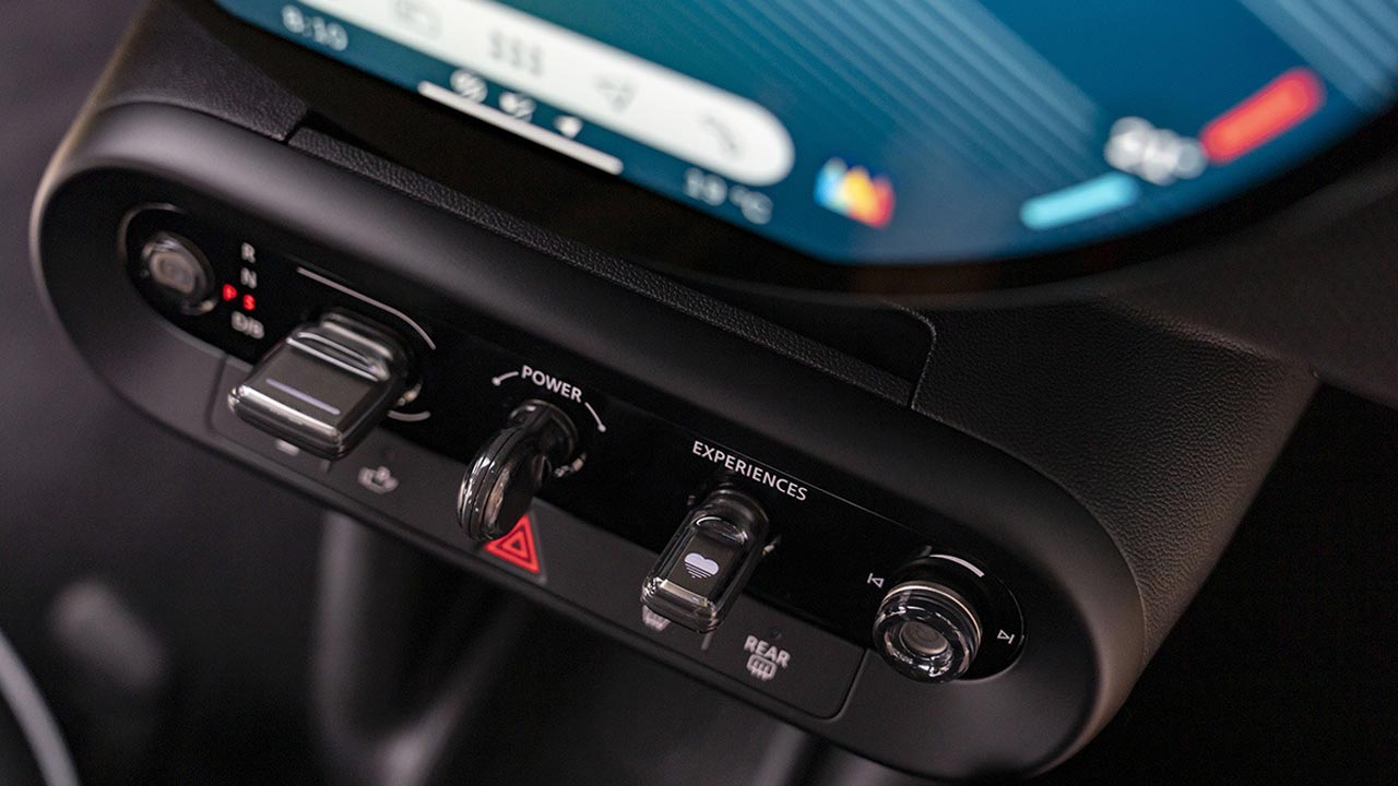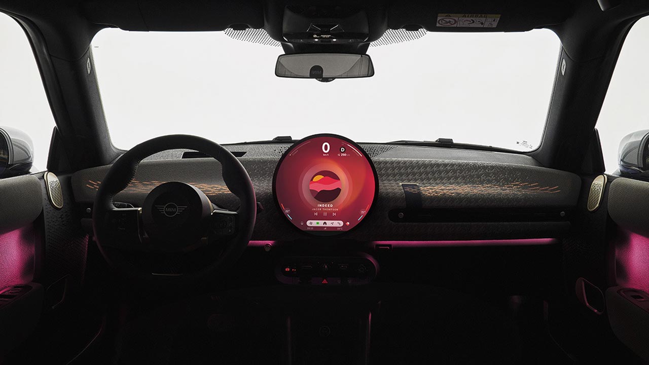 Μία φουτουριστική εκδοχή του παρελθόντος συναντάμε στο νέο εσωτερικό. Η εικόνα του MINI Cooper παραμένει γνώριμη, με στοιχεία old school να “παντρεύονται” με σύγχρονες τεχνολογίες. Η μινιμαλιστική εσωτερική σχεδίαση του Cooper είναι εμπνευσμένη από το κλασικό Mini. Εκεί συναντάμε το νέο τιμόνι, την στρογγυλή οθόνη OLED, αλλά και υφασμάτινες επενδύσεις σε αρκετές επιφάνειες. Ασφαλώς δεν γίνεται να μην αναφερθούμε και στην πανοραμική γυάλινη οροφή, η οποία στο αυτοκίνητο της δοκιμής είναι ανοιγόμενη στην περιοχή των εμπρός επιβατών. Όσον αφορά τώρα στους χώρους, αυτός ο τομέας ποτέ δεν ήταν το “δυνατό χαρτί” του MINI Cooper. Ωστόσο, τέσσερις ενήλικες θα βολευτούν χωρίς ιδιαίτερους περιορισμούς. Ειδικά για τις εμπρός θέσεις υπάρχουν θήκες για μικροαντικείμενα στην κεντρική κονσόλα, ενώ οι βολικές ποτηροθήκες και οι θύρες φόρτισης Type-C είναι “παρών”. Πάμε και στους χώρους για αποσκευές, όπου αναδιπλώνοντας το πίσω κάθισμα σε αναλογία 60:40, ο χώρος αποσκευών μπορεί να αυξηθεί από τα 210 λίτρα σε έως και 800 λίτρα. Η κεντρική οθόνη, μέσω της οποίας ο οδηγός ελέγχει και ενημερώνεται για τα πάντα έχει ομολογουμένως εξαιρετική ευκρίνεια, προβάλλει όλες τις πληροφορίες οδήγησης (βλέπε κατανάλωση, ταχύτητα, σ.α.λ.) ενώ εκεί προβάλλεται επίσης εικόνα 360 μοιρών από τις κάμερες που βρίσκονται γύρω από το αυτοκίνητο. Μέσω αυτής, ο οδηγός ρυθμίζει τον κλιματισμό, αλλά και τα προγράμματα οδήγησης (υπάρχει και φυσικός διακόπτης γι’ αυτό), τα οποία μεταβάλλουν το “περιβάλλον” πλοήγησης στο μενού, αλλά και τον εσωτερικό φωτισμό. Για να είμαι ειλικρινής, η εξοικείωση μαζί της απαιτεί λίγο χρόνο, μιας και είναι αρκετή και “συσσωρευμένη” η πληροφορία. Λίγο πιο κάτω υπάρχουν και διακόπτες αεροπορικού τύπου.