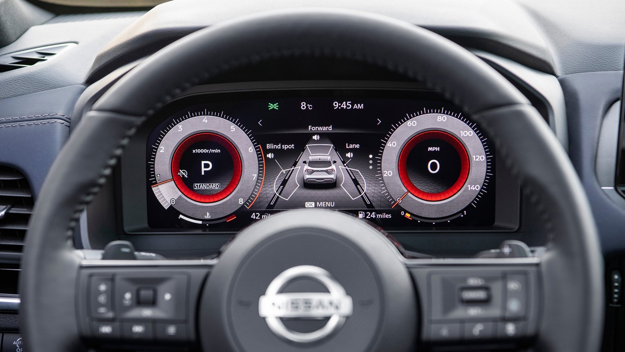 Προφανώς και σε ένα ολοκαίνουργιο αυτοκίνητο, εξολοκλήρου νέα είναι και η καμπίνα των επιβατών. Όλα είναι σχεδιασμένα από την αρχή, ενώ και τα υλικά είναι προσεγμένα. Όλη η επιφάνεια του ταμπλό καλύπτεται από μαλακό υλικό μέχρι τη μέση, ενώ το ίδιο ισχύει και για τα πάνελ των θυρών εμπρός. Τα σημεία επαφής με τους αγκώνες του οδηγού είναι και αυτά μαλακά τόσο στο υποβραχιώνιο της πόρτας όσο και σε αυτό ανάμεσα στα καθίσματα οδηγού-συνοδηγού, αν και δεν έχει ρύθμιση ύψους το τελευταίο. Από τη μέση και κάτω τόσο στο ταμπλό, όσο και στις εμπρός πόρτες τα υλικά είναι σκληρά και ανθεκτικά σε χτυπήματα, γδαρσίματα κλπ. Τα πάνελ των πίσω θυρών από την άλλη είναι εξολοκλήρου από σκληρό πλαστικό. Η εργονομία είναι εξαιρετική και το ίδιο ισχύει και για την περιμετρική ορατότητα του αυτοκινήτου. Μικρή εξοικείωση θα χρειαστεί μόνο με το σύστημα πολυμέσων και την οθόνη αφής. Ο πίνακας οργάνων με τα αναλογικά όργανα και την ψηφιακή οθόνη είναι ευανάγνωστος και πλήρης ενδείξεων (υπάρχει και πλήρως ψηφιακός πίνακας οργάνων, όπως αυτός που φαίνεται στις εικόνες), ενώ τα χειριστήρια στο τιμόνι είναι σωστά τοποθετημένα. Οι χώροι είναι άνετοι για τους εμπρός επιβάτες, με αρκετές και ευρύχωρες θήκες για μικροαντικείμενα, ενώ οι “τσέπες” στις πόρτες είναι αρκετά μεγάλες. Πίσω εύκολα θα βολευτούν δύο ενήλικες, ενώ και τρίτος μεσαίου αναστήματος δεν θα έχει πρόβλημα σε μικρές μετακινήσεις (τα καλά του μεγαλύτερου μεταξονιού είναι ο αυξημένος χώρος για τα γόνατα των πίσω επιβατών). Το τούνελ δαπέδου δεν είναι έντονο και δεν θα ενοχλήσει ιδιαίτερα τα πόδια του μεσαίου επιβάτη, ενώ απουσιάζουν οι αεραγωγοί για τους πίσω. Στα σημαντικά, το σχεδόν κάθετο άνοιγμα 90 μοιρών των πίσω θυρών ως προς το αμάξωμα, κάτι που διευκολύνει το μπες/βγες στο πίσω κάθισμα. Ευπρόσδεκτος είναι ο νυχτερινός φωτισμός, ενώ τα καθίσματα είναι αναπαυτικά. Η μεγαλύτερης και υψηλότερης ανάλυσης 9 ιντσών οθόνη (προσφέρεται και μεγαλύτερη 12,3 ιντσών) του NissanConnect είναι μια ψηφιακή πύλη για τις ρυθμίσεις της πλοήγησης, της ψυχαγωγίας, αλλά και του οχήματος και είναι συμβατή με το Android Auto και το Apple CarPlay. Τα πολλαπλά προφίλ χρήστη με ρυθμίσεις μνήμης επιτρέπουν την προσαρμογή της πλοήγησης, της μουσικής και των προτιμήσεων του συστήματος, ανάλογα με τις προτιμήσεις του εκάστοτε οδηγού. Όσον αφορά στον χώρο αποσκευών, αυτός είναι από 436 έως 504 λίτρα, ανάλογα με την διαμόρφωση της θέσης του δαπέδου. Αξίζει να σημειώσω εδώ, πως με την αναδίπλωση των πίσω καθισμάτων ο χώρος παραμένει επίπεδος (αν επιλέξετε την υψηλή θέση δαπέδου), ενώ υπάρχει και ρεζέρβα κάτω από το δάπεδο (και όχι κιτ επισκευής).