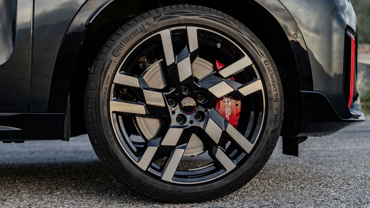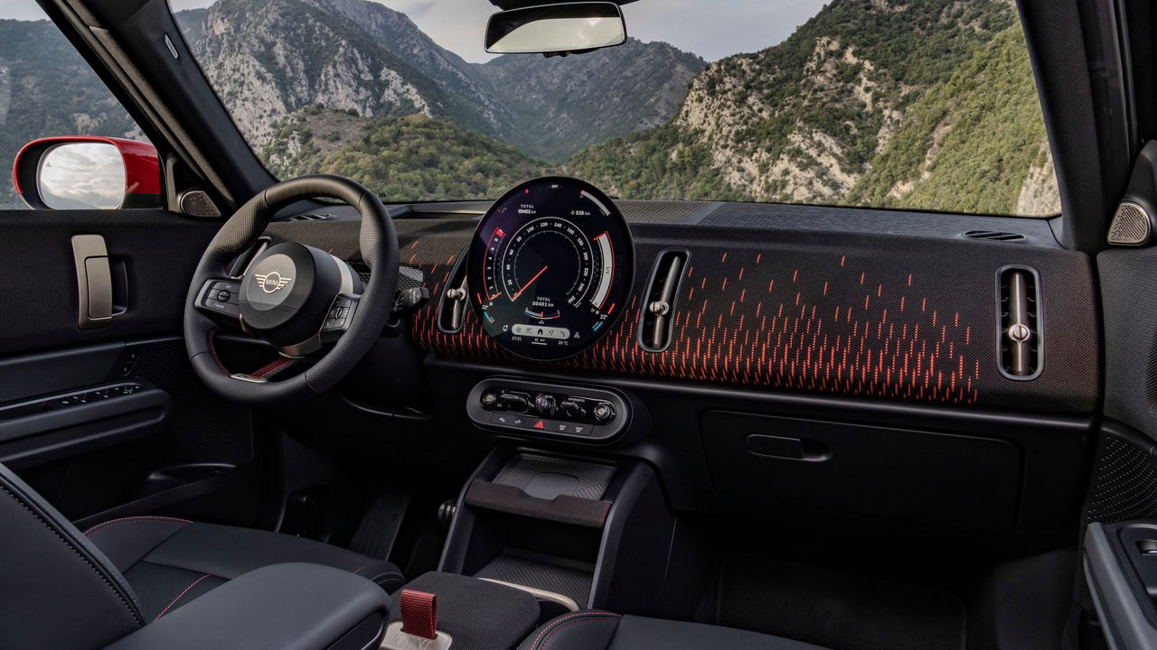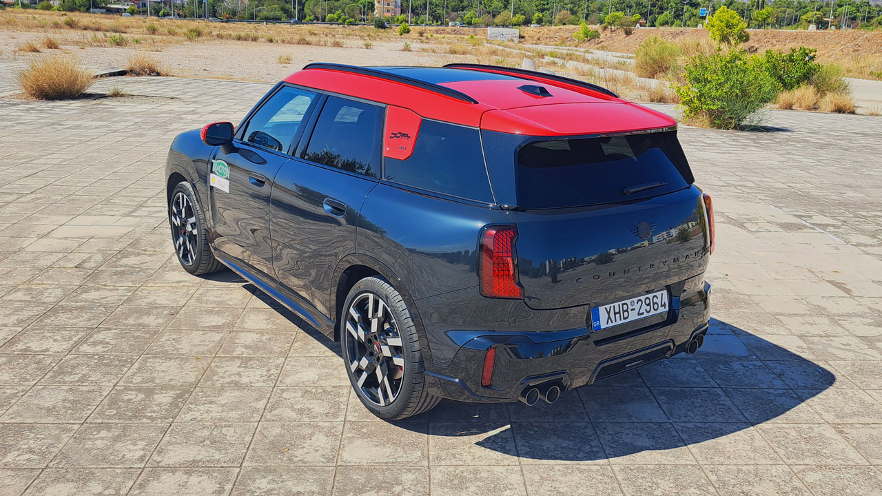 Ξεκινώντας από την εξωτερική εμφάνιση, από όποια γωνία κι αν κοιτάξει κανείς το MINI Countryman JCW αντιλαμβάνεται ότι πρόκειται για κάτι… ειδικό! Στο εμπρός τμήμα συναντάμε σκουρόχρωμα πλαίσια των φωτιστικών σωμάτων και της μάσκας, αλλά και κόκκινες λεπτομέρειες σε αρκετά σημεία του αμαξώματος, όπως για παράδειγμα τις λωρίδες στο καπό, την οροφή και τα καπάκια στους καθρέφτες. Κόκκινες είναι και οι δαγκάνες των φρένων με αεριζόμενους δίσκους εμπρός, οι οποίες “φιλοξενούνται” σε ζάντες αλουμινίου μεγέθους 20 ιντσών. Απαρατήρητο δεν περνά ούτε το πίσω μέρος, στο οποίο συναντάμε αεροτομή ψηλά και δύο διπλές απολήξεις της εξάτμισης χαμηλά. Σε αυτή την έκδοση, η ονομασία “Countryman” είναι βαμμένη σε μαύρο χρώμα, ενώ το ίδιο ισχύει και για το λογότυπο της εταιρείας. Αναφορικά τώρα με τις διαστάσεις, το μήκος του “giga” MINI αγγίζει τα 4.447 χλστ., το πλάτος φτάνει στα 1.843 και το ύψος στα 1.645 χλστ.