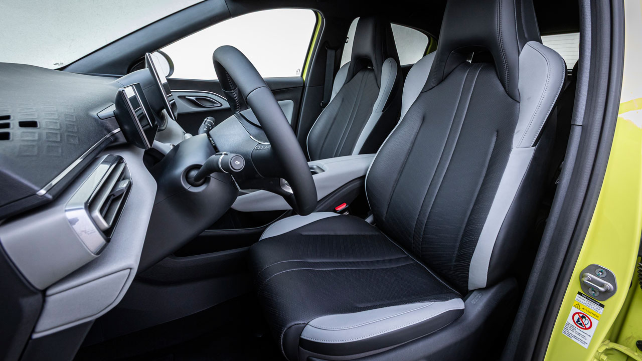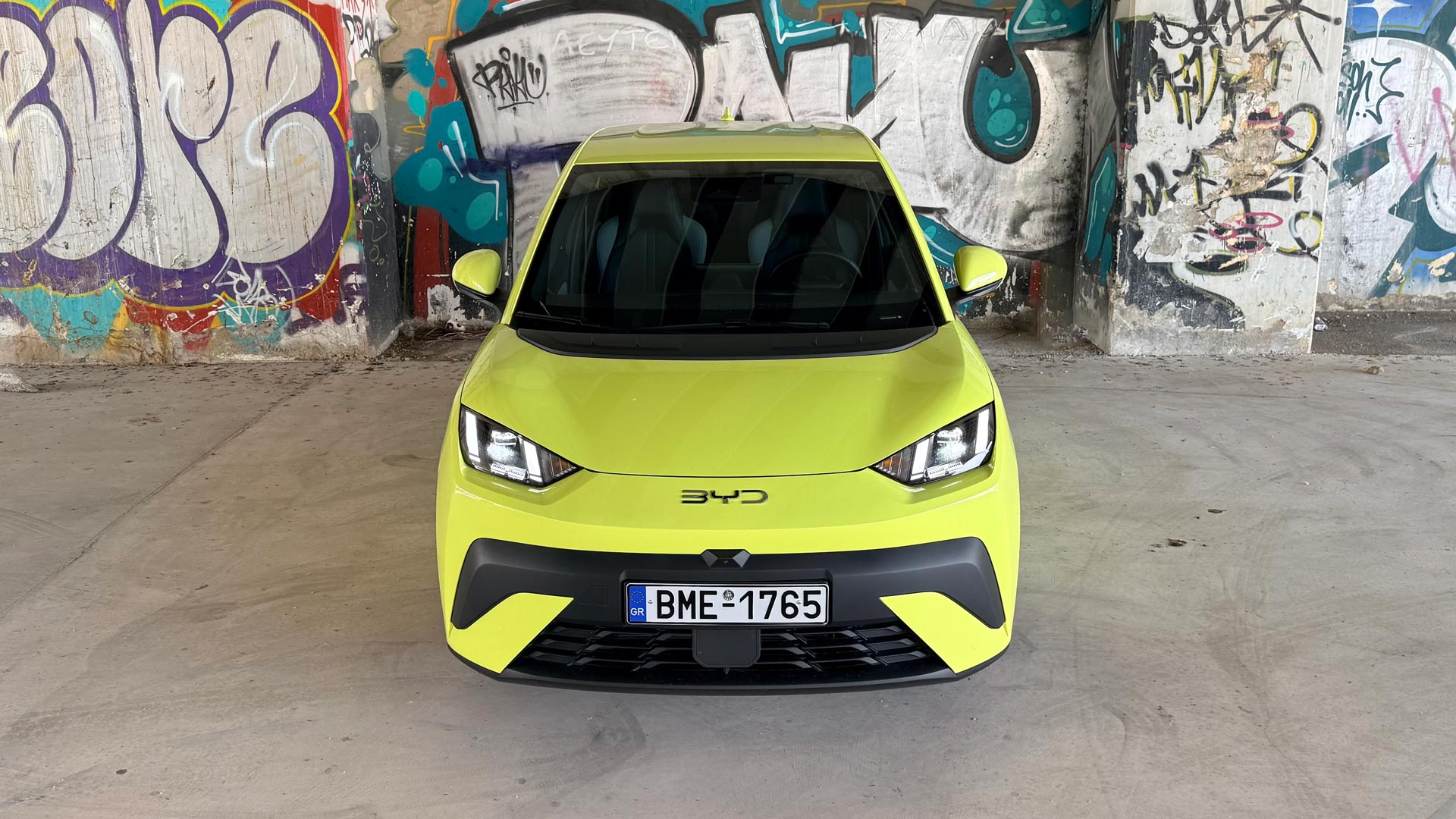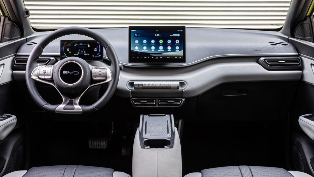 Στο εσωτερικό έχει τοποθετηθεί περιστρεφόμενη οθόνη αφής 10,1 ιντσών από την βασική έκδοση, με το multimedia σύστημα να προσφέρει υποστήριξη Apple CarPlay και Android Auto, σύστημα πλοήγησης, φωνητικό έλεγχο “Hi BYD” και συνδεσιμότητα NFC για κλείδωμα/ξεκλείδωμα χωρίς κλειδί. Τα καθίσματα είναι επενδυμένα με vegan δέρμα και ηλεκτρικές ρυθμίσεις, ενώ σε ρόλο επιλογέα βρίσκεται ένας επιλογέας που είναι τοποθετημένος κάτω από την οθόνη. Εκεί υπάρχουν και άλλοι “φυσικοί” διακόπτες για τη ρύθμιση έντασης του ήχου, για το aircondition (δεν υπάρχει σύστημα κλιματισμού), αλλά και για τα προγράμματα οδήγησης. Η κεντρική κονσόλα ανάμεσα στους δύο επιβάτες έχει αξιοποιηθεί με γνώμονα τη μέγιστη πρακτικότητα, προσφέροντας έναν χώρο κάτω από το υποβραχιόνιο, δύο θήκες για μπουκαλάκια, αλλά και μία βάση ασύρματης φόρτισης (διαθέσιμη μόνο στην κορυφαία έκδοση). Ο διαθέσιμος όγκος για τις αποσκευές αγγίζει τα 308 λίτρα και φτάνει μέχρι τα 1.037 μόλις πέσουν τα καθίσματα. Η εν λόγω τιμή είναι καλύτερη από αυτή που προσφέρουν πολλά οχήματα της αμέσως μεγαλύτερης κατηγορίας. Επιπλέον, στο εσωτερικό υπάρχουν συνολικά περισσότεροι από 20 αποθηκευτικοί χώροι.
