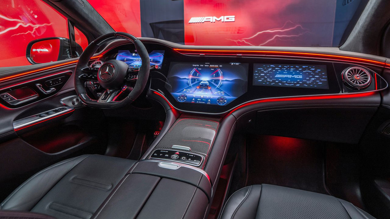 Ανοίγοντας την στιβαρή πόρτα της Mercedes-AMG EQE 43 4MATIC, ο οδηγός θα έρθει σε επαφή με ένα περιβάλλον που πιθανότατα δεν έχει ξανά συναντήσει στη ζωή του. Στην προκειμένη περίπτωση μιλάμε για μία νέα ψηφιακή εμπειρία που θα βιώσει όποιος βρεθεί μπροστά στην λεγόμενη “MBUX Hyperscreen”. Πρόκειται για ένα ενιαίο πάνελ με πλάτος 1.410 χλστ., το οποίο καλύπτει σχεδόν δυόμιση τετραγωνικά μέτρα (2,432 τ.), δηλαδή σχεδόν όλο το ταμπλό. Ας το χωρίσουμε, όμως, σε τρία τμήματα, ξεκινώντας από την οθόνη που βρίσκεται πίσω από το τιμόνι. Αυτή είναι υπεύθυνη για την πληροφόρηση του οδηγού με χρήσιμες ενδείξεις, όπως η αυτονομία, το επίπεδο της μπαταρίας, η ταχύτητα κ.α. Η κυρτή, κεντρική οθόνη αφής αποτελεί το infotainment της Mercedes-AMG EQE 43 4MATIC, μέσω του οποίου ελέγχονται όλα τα συστήματα. Θα χρειαστούν αμέτρητες λέξεις για να περιγράψουμε όλες τις λειτουργίες, οπότε ας αναφέρουμε ενδεικτικά τα συστήματα τηλεμετρίας για χρήση σε πίστα, την κάμερα 360 μοιρών, το σύστημα πλοήγησης και την ρύθμιση ατμοσφαιρικού φωτισμού τη νύχτα. Η ψηφιακή πανδαισία ολοκληρώνεται με την τρίτη οθόνη για τον συνοδηγό. Σε πρώτη φάση θα πει κανείς… υπερβολή της εποχής. Αλλά δίνει την δυνατότητα ελέγχου λειτουργιών από τον συνεπιβάτη που δεν θα ενοχλήσουν το τελετουργικό της οδήγησης.