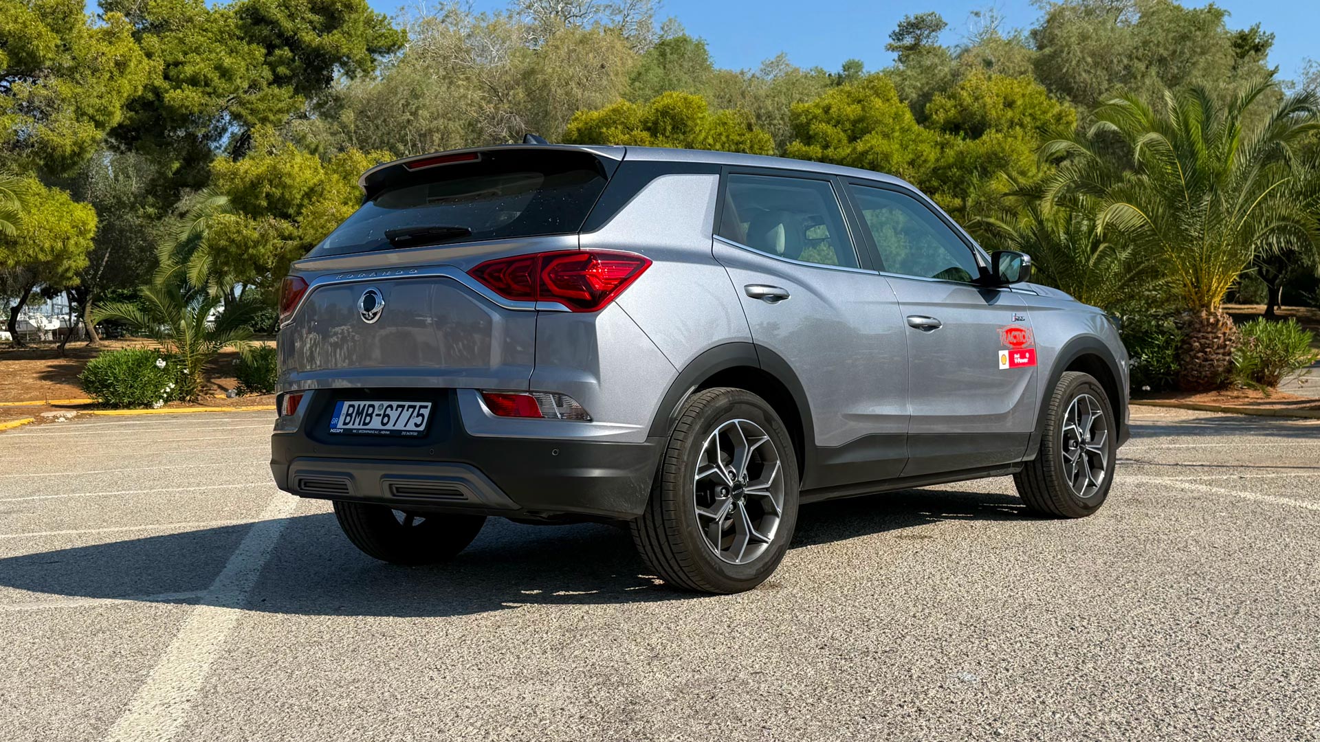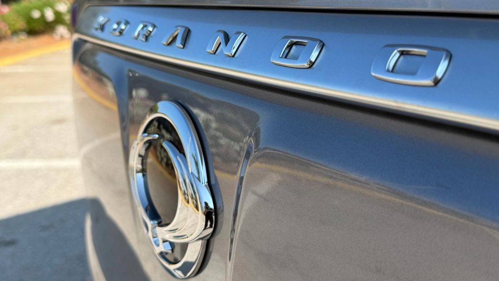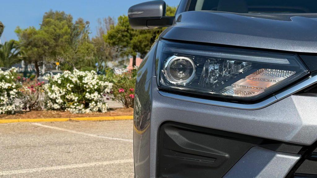 Ξεκινάω με την εξωτερική εμφάνιση του KGM Korando, το οποίο διατηρεί μία “συντηρητική” θα έλεγα εμφάνιση, χωρίς ωστόσο σε καμία περίπτωση να του λείπουν τα σύγχρονα στοιχεία. Στο εμπρός τμήμα ξεχωρίζει το νίκελ διακοσμητικό στοιχείο που διατρέχει την μάσκα, ενώ στο πλαϊνό τμήμα βλέπουμε δύο “νεύρα” που διατρέχουν το αμάξωμα. Στο πίσω τμήμα υπάρχει μία διακριτική αεροτομή στο άνω τμήμα, ενώ στο σύνολο του αμαξώματος υπάρχουν πλαστικές επενδύσεις στο κατώτερο τμήμα για επιπλέον προστασία. Οι ζάντες του αμαξώματος είναι 18 ιντσών (17″ στη βασική έκδοση) και “πατούν” σε ελαστικά μεγέθους 235/55. Όσο για τις διαστάσεις, το μήκος αγγίζει τα 4.450 χλστ., το πλάτος τα 1.870 και το ύψος τα 1.620 χλστ., ενώ η απόσταση από το έδαφος αγγίζει τα 182 χλστ.