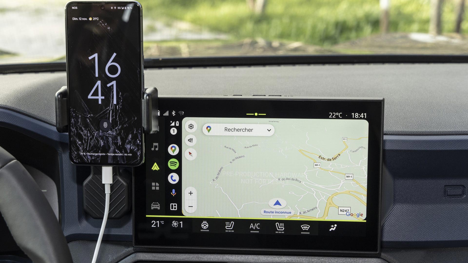 Σύγχρονη αισθητική επικρατεί και στην καμπίνα, η οποία απέκτησε νέα οθόνη αφής μεγέθους 10,1 ιντσών (από την έκδοση Expression). Εννοείται πως υπάρχει δυνατότητα ασύρματης συνδεσιμότητας μέσω Apple CarPlay και Android Auto, ενώ πίσω από το τιμόνι υπάρχει οθόνη 3,5 ιντσών ανάμεσα στα αναλογικά όργανα. Προαιρετικά, για πρώτη φορά σε μοντέλο της Dacia συναντάμε ψηφιακή οθόνη σε ρόλο πίνακα οργάνων μεγέθους 7 ιντσών. Αξιοσημείωτη είναι και η ύπαρξη μίας θήκης για στήριξη του κινητού κοντά στο τιμόνι. Βέβαια, δεδομένου ότι υπάρχει το Android Auto και το Apple CarPlay… δεν χρειάστηκε να χρησιμοποιηθεί στη διάρκεια της δοκιμής. Η δε ποιότητα της καμπίνας έχει αναβαθμιστεί, με τις επενδύσεις να παραμένουν σκληρές. Ωστόσο, δεν υπάρχουν “προχειρότητες” στη συναρμολόγηση και όλα τα υλικά δίνουν την αίσθηση ότι θα αντέξουν στο χρόνο.