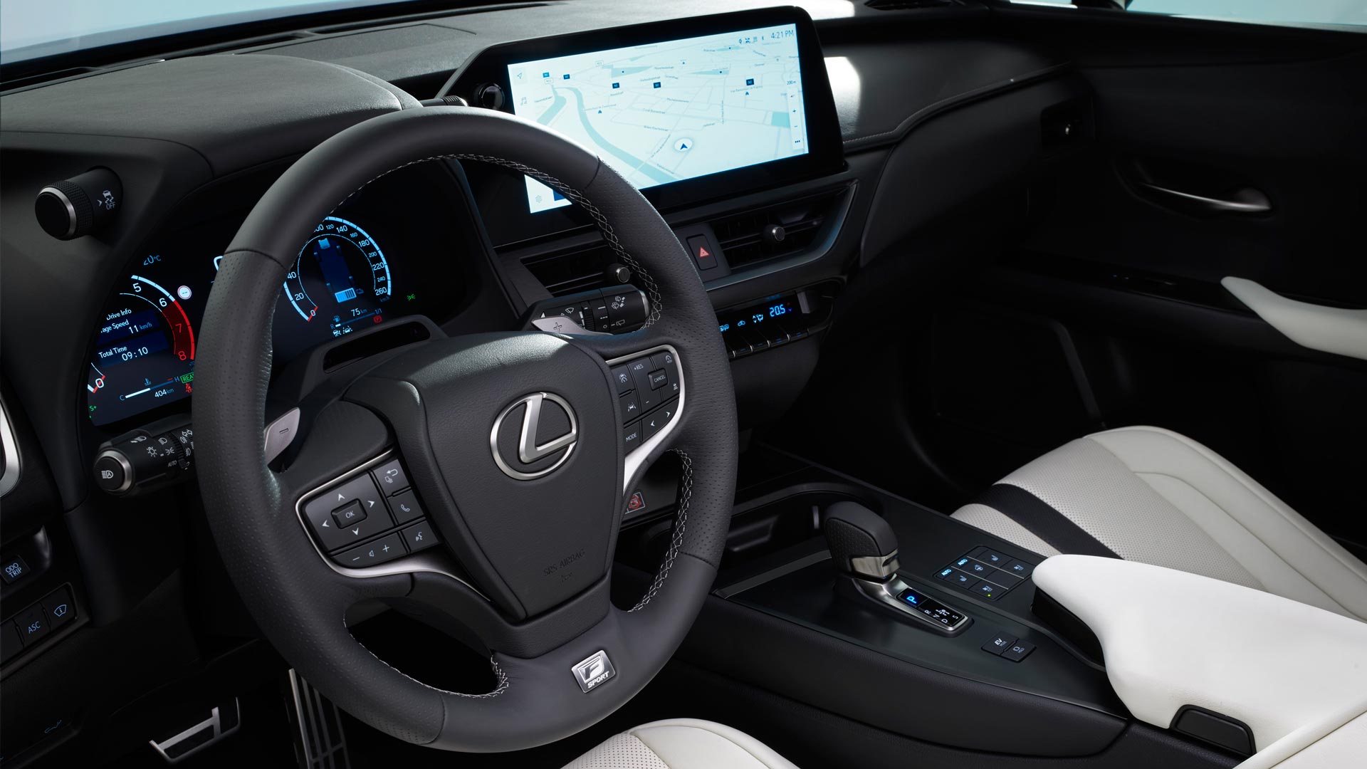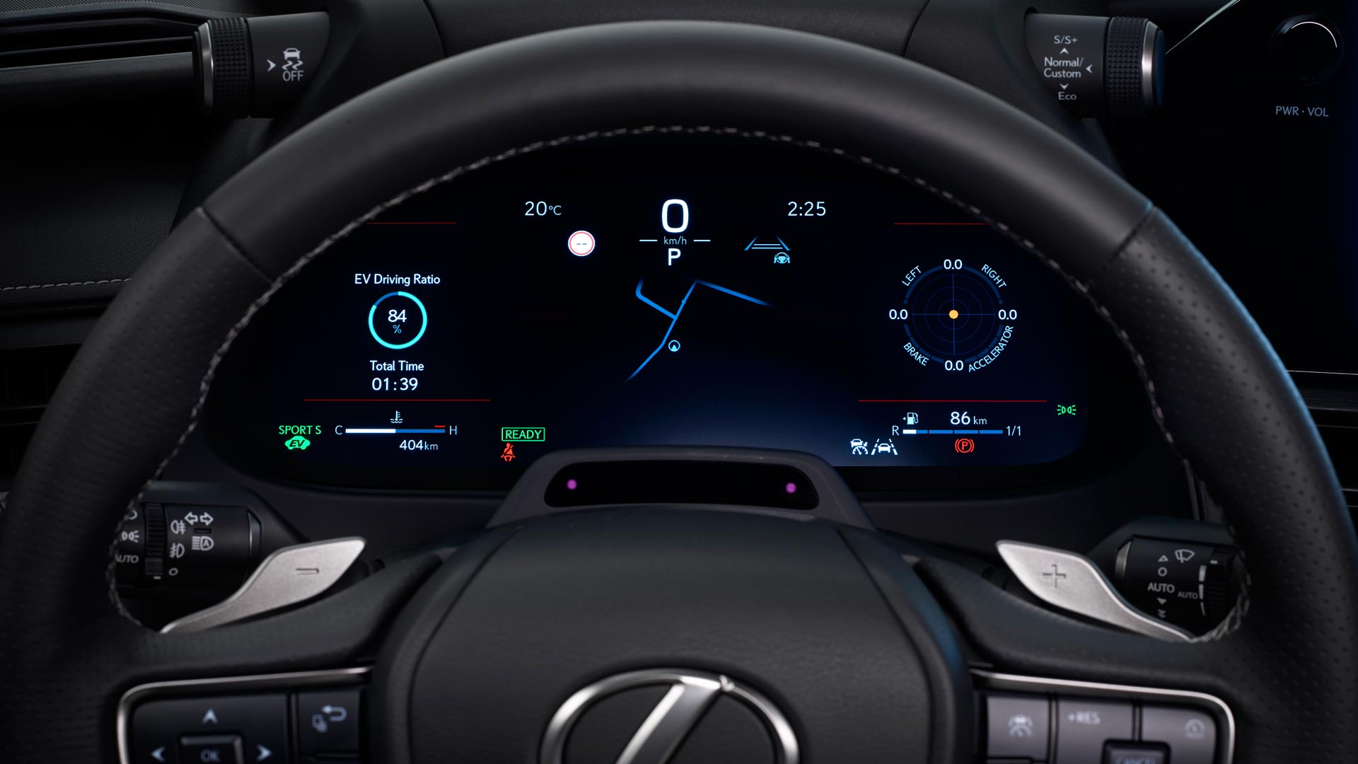 Περνάμε στο εσωτερικό, εκεί όπου η Lexus διατηρεί μία οδηγοκεντρική φιλοσοφία. Η χαμηλή θέση οδήγησης για τα δεδομένα ενός SUV και η κορυφαία εργονομία είναι μερικά από τα στοιχεία που διαπιστώσει κανείς από τα πρώτα κιόλας χιλιόμετρα πίσω από το τιμόνι. Η ποιότητα των υλικών είναι κάτι παραπάνω από προσεγμένη και, ειδικά στα ανώτερα τμήματα της καμπίνας, τα υλικά που έχουν χρησιμοποιηθεί είναι μαλακά στην υφή. Επίσης, υπάρχουν επαρκείς θήκες για μικροαντικείμενα που συμβάλλουν στην κορυφαία πρακτικότητα του ιαπωνικού μοντέλου. Κάπου εδώ, αξίζει να αναφέρουμε ότι υπάρχουν αρκετοί “φυσικοί” διακόπτες στο εσωτερικό που διευκολύνουν σημαντικά τον οδηγό εν κινήσει. Για παράδειγμα, υπάρχει περιστροφικός διακόπτης για την ένταση της φωνής, ενώ πολύ εύκολα γίνεται και ο έλεγχος του συστήματος κλιματισμού. Και τώρα πάμε στο μοναδικό ψεγάδι που εντόπισα στη διάρκεια της δοκιμής που δεν είναι άλλο από τον χώρο αποσκευών. Ο διαθέσιμος όγκος αγγίζει τα 327 λίτρα, τιμή που παραπέμπει σε μικρότερη κατηγορία, και το σχήμα του δεν είναι ιδιαίτερα φιλικό για την φόρτωση αποσκευών. Όσο για το ψηφιακό περιβάλλον, αυτό αποτελείται από μία κεντρική οθόνη αφής που πλέον έχει μέγεθος 12,3 ιντσών, ενώ πίσω από το τιμόνι υπάρχει ακόμα μία οθόνη ίδιου μεγέθους, αλλά και το head-up display.