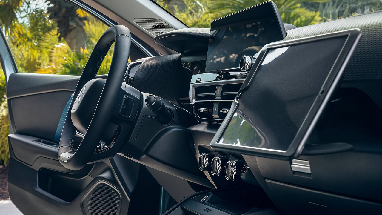 Το νέο Citroen C4 συνεχίζει την υπαρξιακή του… φιλοσοφία και στο εσωτερικό, καθώς οι χωροταξικές λύσεις και η εκμετάλλευση χώρων παραπέμπει σε πολυμορφικό (χωρίς το αυτοκίνητο να ανήκει στην συγκεκριμένη κατηγορία). Εξάλλου, η Citroen έχει μεγάλη παράδοση σε αυτό τον τομέα. Ενδεικτικά οι Γάλλοι κάνουν λόγο για θήκες συνολικής χωρητικότητας 39 λίτρων. Μάλιστα στην μεριά του συνοδηγού υπάρχει συρτάρι και θέση για στήριξη τάμπλετ, ενώ στην κεντρική κονσόλα η θήκη είναι τεράστια. Το μεγάλο άνοιγμα θυρών εξασφαλίζει εύκολη είσοδο/έξοδο, ενώ ο χώρος αποσκευών είναι στα 380 λίτρα (νούμερο που φτάνει στα 1.250 λίτρα με την αναδίπλωση της πίσω σειράς καθισμάτων). Τα υλικά στην πλειοψηφία τους είναι ποιοτικά, με καλό φινίρισμα και με καλή αίσθηση κατά την αφή ακόμη και στα πιο χαμηλά σημεία. Όπως σε κάθε σύγχρονο αυτοκίνητο έτσι και εδώ οι οθόνες έχουν πάρει τα ηνία στο ταμπλό και στον πίνακα οργάνων. Επιλογή που σύμφωνα με την Citroen έχει γίνει συνειδητά για λόγους ασφάλειας, προκειμένου να μην αποσπάτε η προσοχή του οδηγού. Η βασική οθόνη όμως στο κέντρο του ταμπλό, είναι 10 ιντσών και… παίρνει εκδίκηση, καθώς είναι υπερπλήρης πληροφοριών και με εξαιρετική ανάλυση.