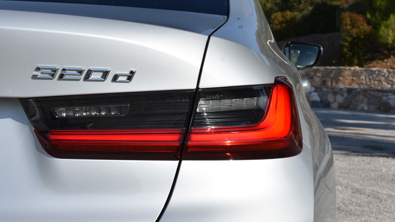 Μπορεί η εξωτερική της εμφάνιση να παραμένει αναλλοίωτη εδώ και περίπου τρία χρόνια, αλλά η BMW 320d mHEV είναι ένα σύγχρονο και εντυπωσιακό sedan. Στο εμπρός τμήμα κυριαρχούν τα μεγάλα “νεφρά” και οι Full-LED προβολείς που προσφέρονται στον στάνταρ εξοπλισμό. Το προφίλ του αμαξώματος διατρέχουν δύο νεύρα και στην “sportive” εμφάνιση συμβάλουν οι ζάντες 18 ιντσών με τις οποίες εξοπλιζόταν το αυτοκίνητο της δοκιμής. Το πίσω μέρος χαρακτηρίζεται από οριζόντιες γραμμές, και δίχρωμα, τρισδιάστατα φώτα LED. Όσον αφορά στις διαστάσεις της, η BMW Σειρά 3 είναι 85 χλστ. μακρύτερη από την προκάτοχό της (4.709 χλστ.), 16 χλστ. φαρδύτερη (1.827 χλστ.) και 1 χλστ. ψηλότερη (1.442 χλστ.). Το μακρύτερο κατά 41 χλστ. μεταξόνιό της (2.851 χλστ.) και τα αυξημένα μετατρόχια (εμπρός κατά 43 χλστ. και πίσω κατά 21 χλστ.) εξασφαλίζουν μεγαλύτερο αποτύπωμα στο δρόμο και καλύτερη εκμετάλλευση χώρων στην καμπίνα. Κοιτώντας εξωτερικά το αυτοκίνητο, θα διαπιστώσει κανείς ότι δεν υπάρχουν ενδείξεις που “μαρτυρούν” ότι πρόκειται για ήπια υβριδικό μοντέλο, αφού το μοναδικό στοιχείο που απεικονίζεται στο πίσω μέρος του αμαξώματος είναι το 320d.