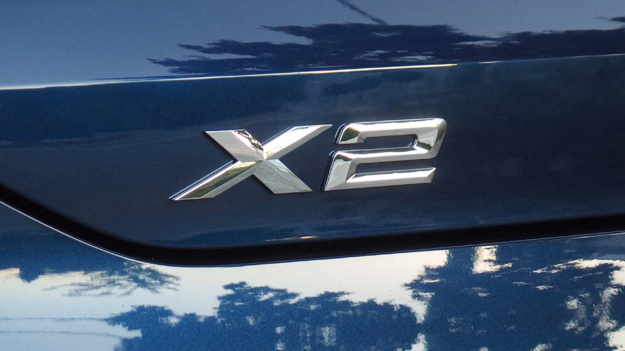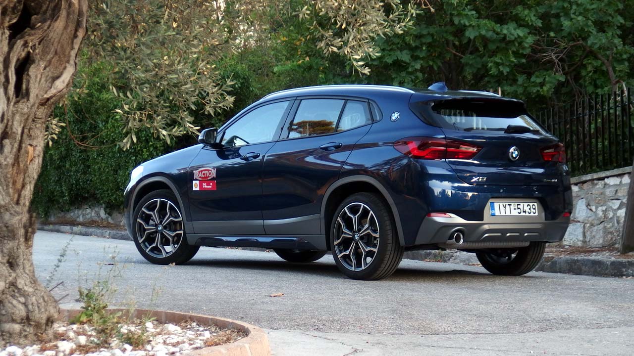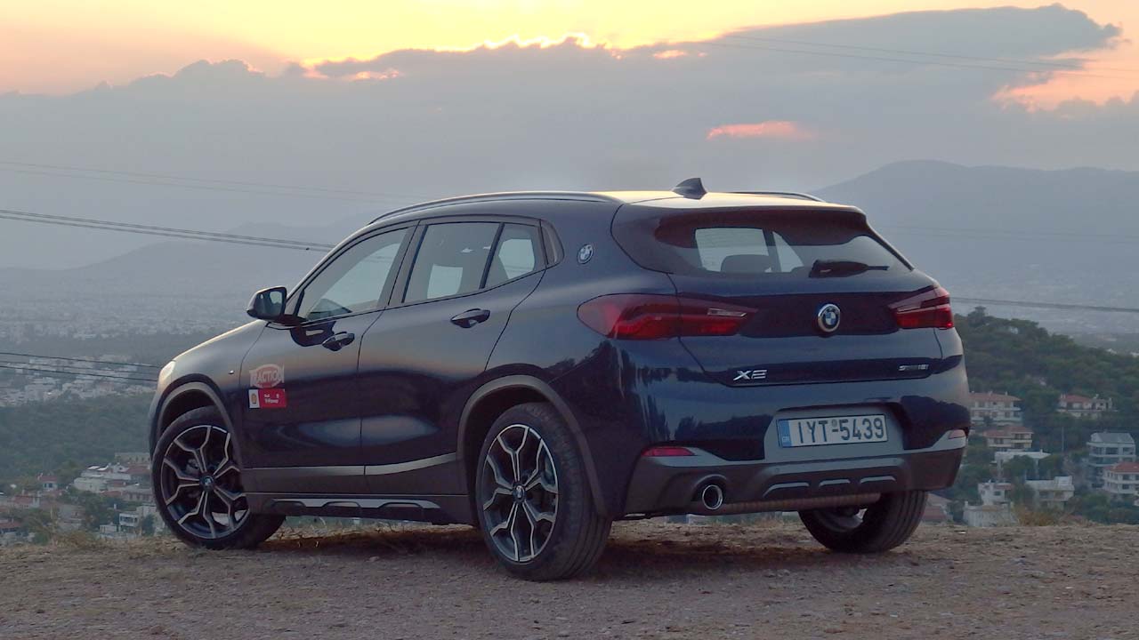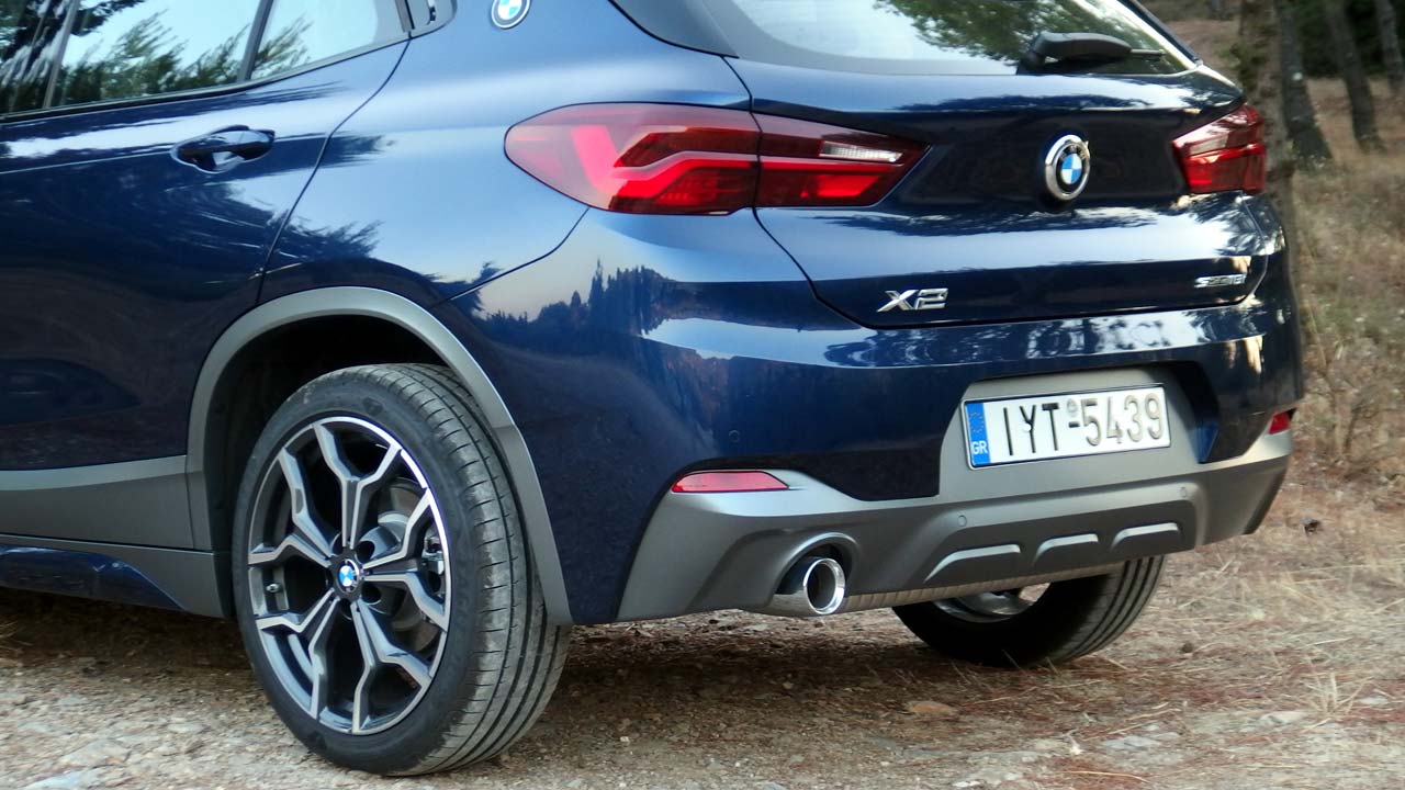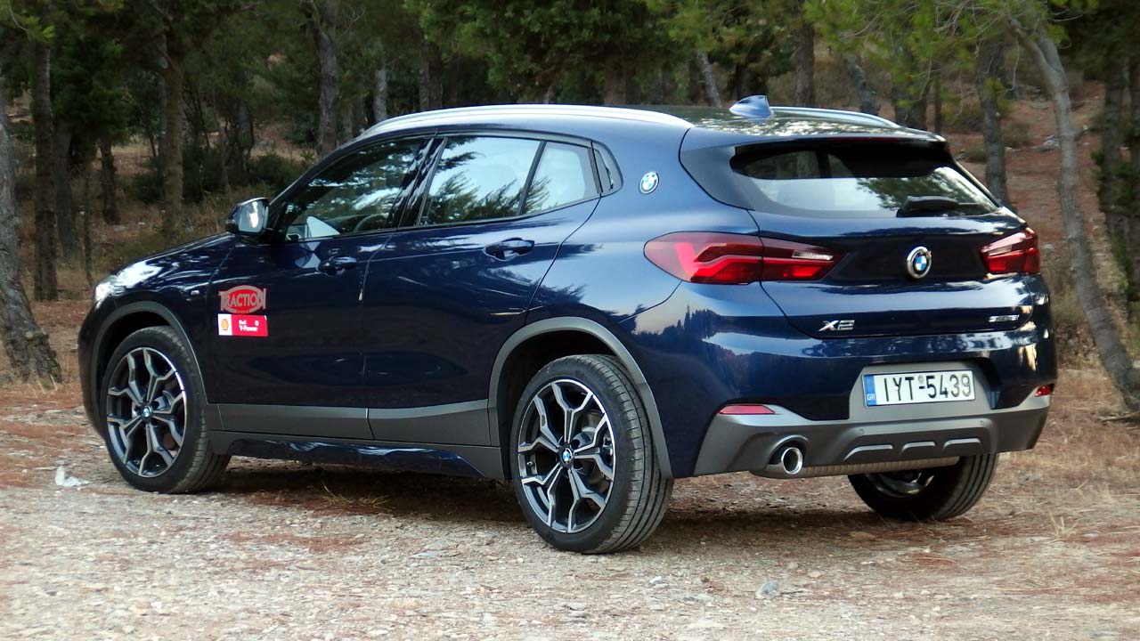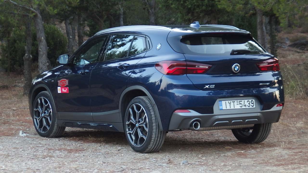 Η BMW Χ2 ήρθε να συμπληρώσει την X1, με την οποία μοιράζονται το ίδιο μεταξόνιο, όχι όμως και τις ίδιες διαστάσεις, καθώς η X2 έχει ελαφρώς μικρότερο μήκος στα 4.360 χλστ. Φυσικά τα δύο μοντέλα διαφέρουν και αισθητικά με την X2 να είναι πιο επιθετικά σχεδιασμένη, όντας παράλληλα το πρώτο αυτοκίνητο της BMW, του οποίου η μάσκα είναι πιο πλατιά στο κάτω μέρος από ότι στο άνω μέρος της. Ακόμη ένα χαρακτηριστικό της εμφάνισής της είναι οι μικρές γυάλινες επιφάνειες (περιορίζουν λίγο την ορατότητα προς τα πίσω), οι οποίες τονίζουν τον δυναμισμό της σχεδίασης του αμαξώματος. Οι πίσω κολόνες είναι αρκετά “χοντρές” ενώ επάνω τους βρίσκεται το σήμα της BMW (χαρακτηριστικό που είχαμε χρόνια να δούμε σε αυτοκίνητο της βαυαρικής μάρκας). Όσον αφορά τα επιπλέον χαρακτηριστικά της έκδοσής μας, η M Sport X διαθέτει μπροστινό προφυλακτήρα με ένθετο σε γκρι Frozen μεταλλικό, ειδικά σχεδιασμένες εισαγωγές αέρα και διακοσμητικά καλύμματα μαρσπιέ σε γκρι Frozen μεταλλικό επίσης με ένθετα στο χρώμα του αμαξώματος και διακοσμητικά θόλων καθώς και ένθετο διαχύτη στον πίσω προφυλακτήρα στο γκρι Frozen μεταλλικό και πάλι. Οι ζάντες ελαφρού κράματος “M” 19 ιντσών “ντύνονται” με ελαστικά runflat (υπάρχουν και σε 20 ίντσες). Φυσικά δεν λείπει το σήμα “M” στα εμπρός φτερά.