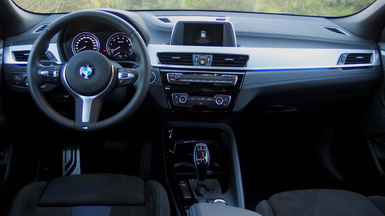 Μπαίνοντας στην καμπίνα της BMW X2 αντιλαμβάνεσαι εξαρχής πως έχει δοθεί μεγάλη προσοχή στην ποιότητα κατασκευής και στη συναρμολόγηση. Όλα τα υλικά είναι προσεκτικά επιλεγμένα, ενώ δεν ακούς… τσικ ακόμη και όταν το αυτοκίνητο κινηθεί εκτός δρόμου. Ο πίνακας οργάνων είναι αναλογικός, με δύο μεγάλα και ευανάγνωστα κυκλικά όργανα (ταχύμετρο και στροφόμετρο), ενώ έχει και ψηφιακές ενδείξεις στο κάτω μέρος του για τον υπολογιστή ταξιδιού αλλά και για το σύστημα πλοήγησης (εφόσον διατίθεται). Στο κέντρο του ταμπλό η εργονομία παίρνει την σκυτάλη, αφού ξεκάθαρος είναι ο διαχωρισμός των ζωνών ανάμεσα σε κλιματισμό και ηχοσύστημα, ενώ λίγο πιο πάνω συναντάμε την οθόνη του συστήματος πολυμέσων. Οι λειτουργίες του τελευταίου μπορούν να γίνουν φυσικά με το iDrive (ο πιεζοπεριστροφικός διακόπτης στην κεντρική κονσόλα), το οποίο απαιτεί ένα διάστημα εξοικείωσης, αλλά όταν το μάθεις είναι… παιχνιδάκι. Θήκες υπάρχουν αρκετές για μικροαντικείμενα, ενώ τέσσερις ενήλικες επιβάτες θα βολευτούν χωρίς πρόβλημα. Στο πίσω κάθισμα πάντως αν υπάρξει μεσαίος επιβάτης θα περιοριστεί λίγο από το τούνελ δαπέδου ανάμεσα στα πόδια του. Όσον αφορά το χώρο αποσκευών, αυτός είναι στα 470 λίτρα και με την αναδίπλωση των πίσω καθισμάτων φτάνει στα 1.355 λίτρα. Η συγκεκριμένη έκδοση έχει να επιδείξει επιπλέον διακοσμητικά καλύμματα μαρσπιέ “Μ” μπροστά και υποπόδιο για τον οδηγό “Μ”, εντυπωσιακά μπάκετ καθίσματα οδηγού και συνοδηγού με άψογη πλευρική στήριξη, δερμάτινο τιμόνι “Μ”, διακοσμητικές επενδύσεις εσωτερικού από αλουμίνιο κυψελοειδούς σχεδίασης σε ανθρακί χρώμα και αποκλειστικές οπτικές ίνες LED στα διακοσμητικά πάνελ των θυρών.