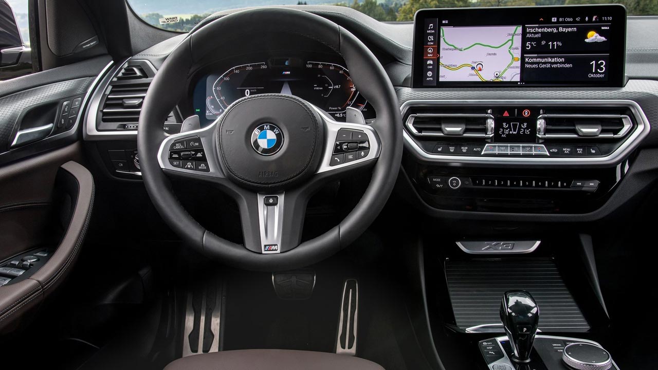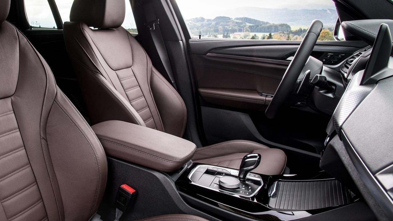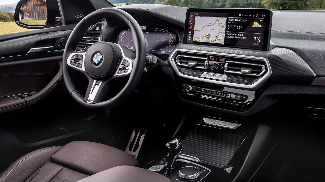 Η νέα BMW X3 υιοθετεί την κεντρική κονσόλα της τρέχουσας BMW Σειράς 4. Το εσωτερικό κερδίζει τις εντυπώσεις με τον σχεδιασμό του, με διακοσμητικές επενδύσεις σε γυαλιστερό μαύρο χρώμα και νέα χειριστήρια για το σύστημα κλιματισμού. Τα σπορ καθίσματα με επενδύσεις από διάτρητο ύφασμα Sensatec περιλαμβάνονται στον βασικό εξοπλισμό και προσφέρουν μεγαλύτερη άνεση. Φυσικά, τα υλικά που έχουν χρησιμοποιηθεί είναι από το… πάνω ράφι, ενώ η συναρμογή δεν αφήνει περιθώρια για… παράπονα. Είναι απλώς τέλεια! Η κεντρική κονσόλα φιλοξενεί τη νέας σχεδίασης νησίδα ελέγχου με τον επιλογέα ταχυτήτων, κουμπιά για το σύστημα start/stop, το ηλεκτρικό χειρόφρενο, τον έλεγχο κατάβασης σε ανηφόρα και διάφορες λειτουργίες οδηγικής εμπειρίας. Το κουμπί εκκίνησης κινητήρα βρίσκεται επίσης εδώ. Νέες ενθέσεις υπάρχουν στους αεραγωγούς και προσθέτουν μια πινελιά κομψότητας, ενώ τονίζουν τις οριζόντιες γραμμές στο εσωτερικό. Με το BMW Live Cockpit Plus ως στάνταρ και την έξυπνη δικτύωση, συμπεριλαμβανομένων καινοτόμων ψηφιακών υπηρεσιών που βασίζονται στο λειτουργικό σύστημα BMW Operating System 7, η BMW X3 προσφέρει κορυφαία αλληλεπίδραση μεταξύ οδηγού και οχήματος. Το BMW Live Cockpit Plus περιλαμβάνει το λειτουργικό σύστημα iDrive (με τον κλασικό πιεζοπεριστροφικό διακόπτη) με οθόνη ελέγχου και ελεγκτή αφής, καθώς και πίνακα οργάνων σε εμφάνιση μαύρου πίνακα με έγχρωμη οθόνη 5,1 ιντσών στο κέντρο. Το BMW Live Cockpit Plus μπορεί να συμπληρωθεί με την προαιρετική BMW Head-Up Display. Ως προαιρετικό πρόσθετο, το BMW Live Cockpit Professional προσφέρει ένα πλήρως ψηφιακό δίκτυο ενδείξεων: ο πίνακας οργάνων υψηλής ανάλυσης πίσω από το τιμόνι και η οθόνη ελέγχου έχουν διαγώνιο οθόνης 12,3 ιντσών. Όσον αφορά τους χώρους, το εσωτερικό έχει πολλές και μεγάλες θήκες, τσέπες στις πόρτες και ποτηροθήκες στην κεντρική κονσόλα. Τέσσερεις επιβάτες θα ταξιδέψουν άνετα, ενώ και πέμπτος δεν θα έχει πρόβλημα παρά μόνο στον χώρο για τα πόδια του λόγω του κεντρικού τούνελ δαπέδου. Ο χώρος αποσκευών από την άλλη είναι στα 550 λίτρα και με την αναδίπλωση των πίσω καθισμάτων φτάνει στα 1.600 λίτρα. Ο αεροδυναμικός συντελεστής του αυτοκινήτου είναι στα 0,29-0,34 Cd (αναλόγως έκδοσης), ενώ το ρεζερβουάρ καυσίμου χωράει 65 λίτρα.