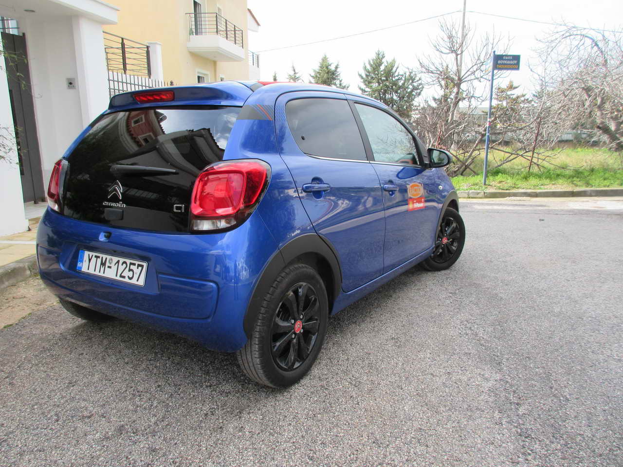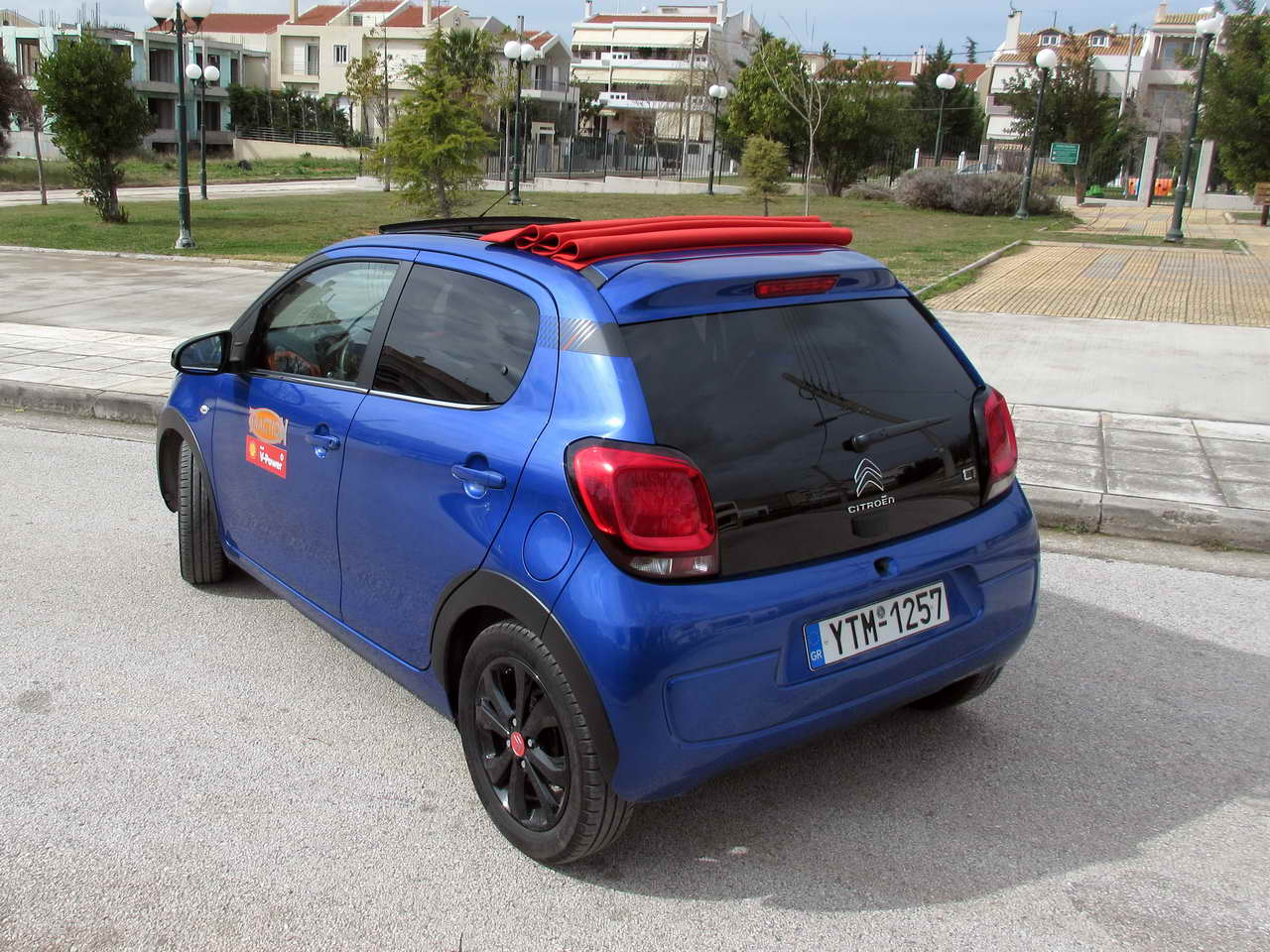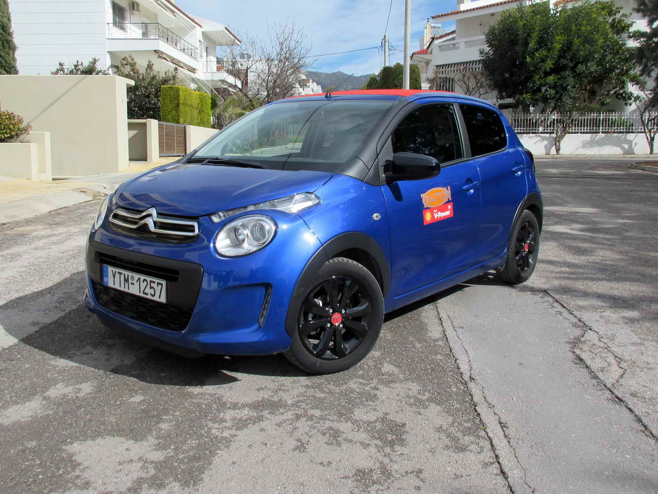 … όπως προδίδει και το χαρακτηριστικό “Urban Ride” που συνοδεύει το αυτοκίνητο της δοκιμής μας. Μετά την ανανέωση του 2018, το C1 διαθέτει ειδικές εκδόσεις με σαφή νεανικό προσανατολισμό, όπως η Elle και η Urban Ride. Το Citroen C1 Elle, αποτείνεται περισσότερο στις γυναίκες, ενώ το Citroen C1 Urban Ride έχει πιο… αρρενωπά χαρακτηριστικά. Οι διαφοροποιήσεις στην εξωτερική εμφάνιση της συγκεκριμένης έκδοσης, με την οποία συνυπάρξαμε, είναι ορατές με την πρώτη ματιά. Η διχρωμία του αμαξώματος, το οποίο στην περίπτωσή μας ήταν και “Airscape“, δηλαδή με ηλεκτρικά ανοιγόμενη οροφή, τραβά το βλέμμα, χάρη στα εξεζητημένα χρώματα που έχουν επιλεχθεί και την επιγραφή “Urban Ride”. Στην έκδοση που οδηγήσαμε, το Blue Calvi του αμαξώματος συνδυάστηκε με Sunrise Red της υφασμάτινης οροφής, προσδίδοντας σαφώς νεανικό χαρακτήρα. Παράλληλα, οι πολυάριθμες μαύρες επιφάνειες όπως προστατευτικά πάνω από τους τροχούς, καθρέπτες, φιμέ πίσω τζάμια και ζάντες αλουμινίου 15 ιντσών, δημιουργούν μια εικόνα που θυμίζει πιο σπορ αυτοκίνητα.