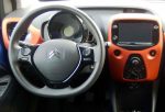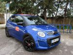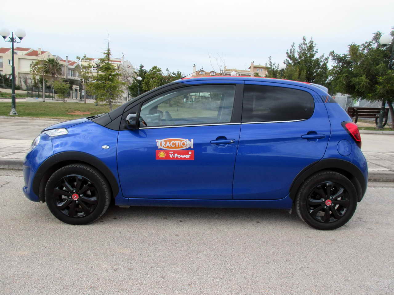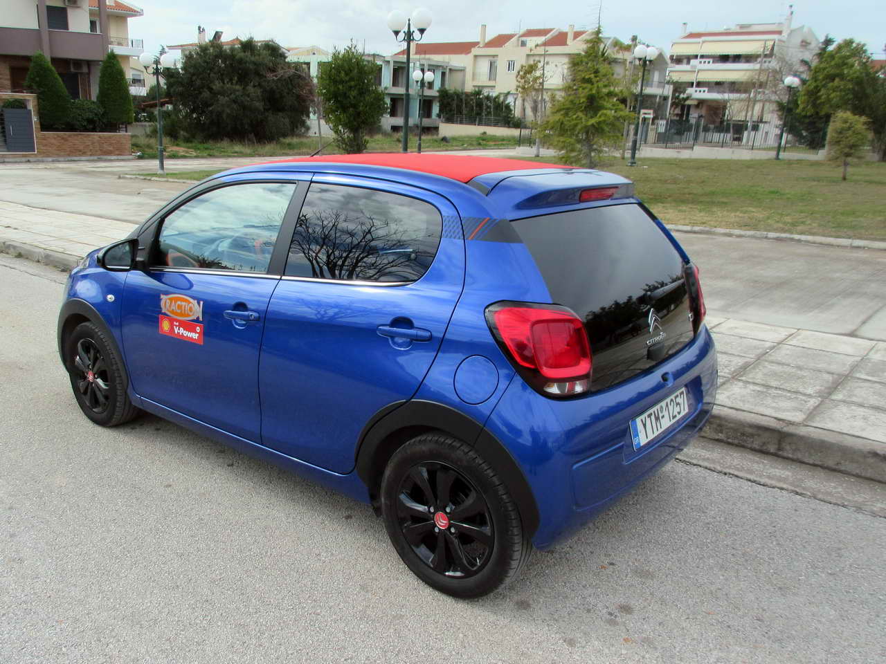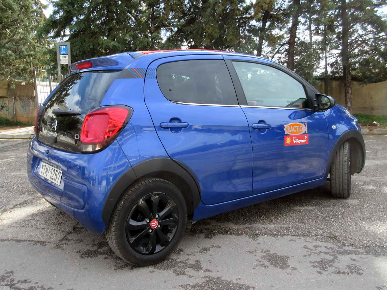 … όπως προδίδει και το χαρακτηριστικό “Urban Ride” που συνοδεύει το αυτοκίνητο της δοκιμής μας. Μετά την ανανέωση του 2018, το C1 διαθέτει ειδικές εκδόσεις με σαφή νεανικό προσανατολισμό, όπως η Elle και η Urban Ride. Το Citroen C1 Elle, αποτείνεται περισσότερο στις γυναίκες, ενώ το Citroen C1 Urban Ride έχει πιο… αρρενωπά χαρακτηριστικά. Οι διαφοροποιήσεις στην εξωτερική εμφάνιση της συγκεκριμένης έκδοσης, με την οποία συνυπάρξαμε, είναι ορατές με την πρώτη ματιά. Η διχρωμία του αμαξώματος, το οποίο στην περίπτωσή μας ήταν και “Airscape“, δηλαδή με ηλεκτρικά ανοιγόμενη οροφή, τραβά το βλέμμα, χάρη στα εξεζητημένα χρώματα που έχουν επιλεχθεί και την επιγραφή “Urban Ride”. Στην έκδοση που οδηγήσαμε, το Blue Calvi του αμαξώματος συνδυάστηκε με Sunrise Red της υφασμάτινης οροφής, προσδίδοντας σαφώς νεανικό χαρακτήρα. Παράλληλα, οι πολυάριθμες μαύρες επιφάνειες όπως προστατευτικά πάνω από τους τροχούς, καθρέπτες, φιμέ πίσω τζάμια και ζάντες αλουμινίου 15 ιντσών, δημιουργούν μια εικόνα που θυμίζει πιο σπορ αυτοκίνητα.