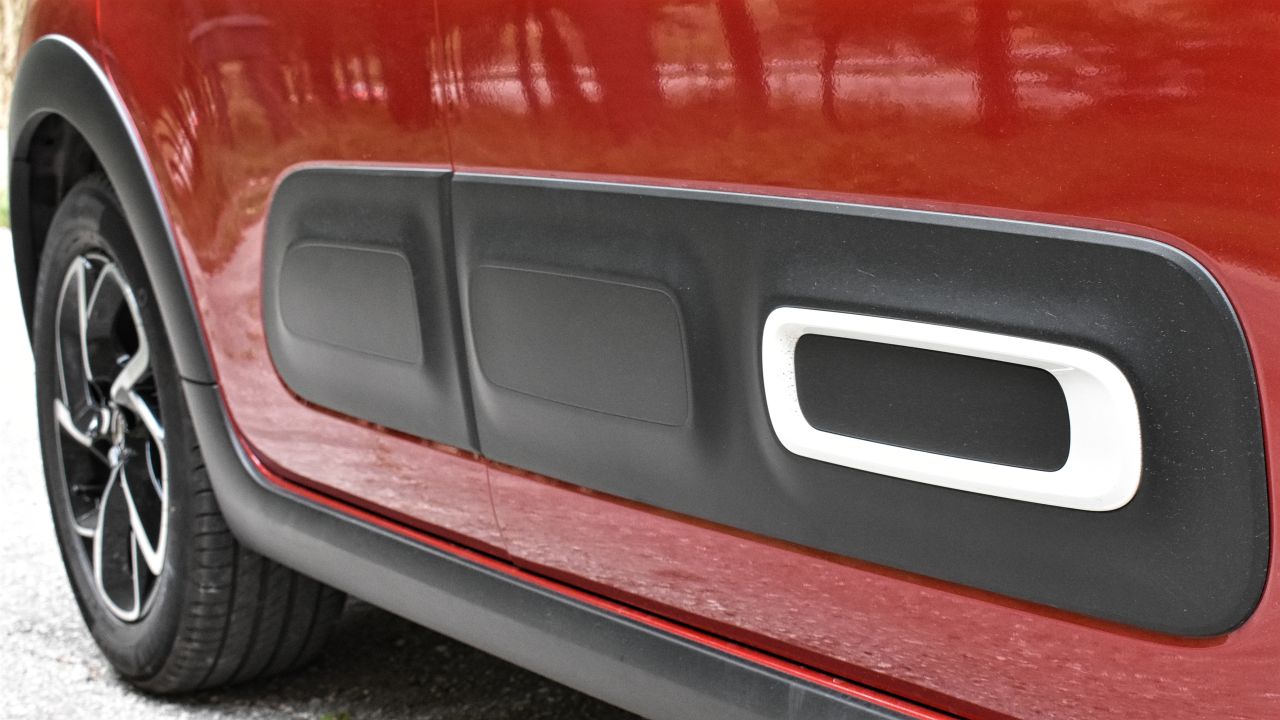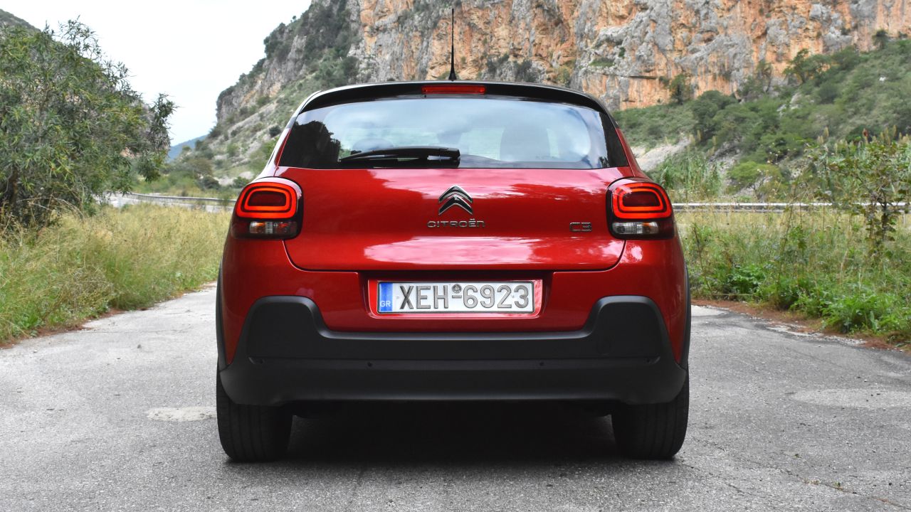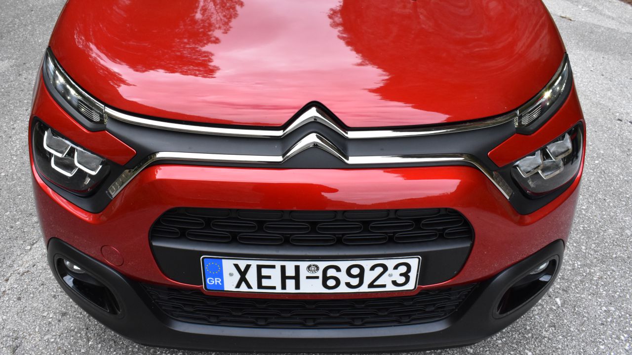 Ως προς τις σχεδιαστικές αλλαγές, με την πρώτη ματιά γίνεται αισθητή η αλλαγή στη σχεδίαση των εμπρός led φωτιστικών σωμάτων. Αλλαγή υπάρχει και στη μάσκα, όπου πλέον το σήμα της Citroen εκτείνεται προς τα κάτω, διαφοροποιώντας αισθητά το εμπρός τμήμα. Οι τροποποιήσεις στα νέα σχέδια για τις ζάντες μεγέθους 16 ή 17 ιντσών. Το αυτοκίνητο της δοκιμής ανήκει στην έκδοση “Shine”, η οποία έρχεται με ζάντες αλουμινίου 16 ιντσών. Ασφαλώς, από το πλαϊνό τμήμα δεν απουσιάζουν τα προστατευτικά “airbumps”, σήμα κατατεθέν πλέον του γαλλικού supermini, αλλά και των υπόλοιπων μοντέλων της Citroen. Η μοντέρνα αισθητική συνεχίζεται με την προσθήκη δύο νέων χρωμάτων στην παλέτα, τα οποία ονομάζονται Red Elixir και Spring Blue. Το πρώτο είναι αυτό που βλέπουμε στις φωτογραφίες του αυτοκινήτου δοκιμής. Κάπως έτσι είναι δυνατόν να επιτευχθούν 97 διαφορετικοί χρωματικοί συνδυασμοί, στοιχείο που κάνει το νέο Citroen C3 να διαφέρει αισθητά. Το μήκος του μικρού supermini βρίσκεται οριακά κάτω από τα τέσσερα μέτρα (3,99 μέτρα για την ακρίβεια), γεγονός που το καθιστά ευέλικτο σε αστικό περιβάλλον.