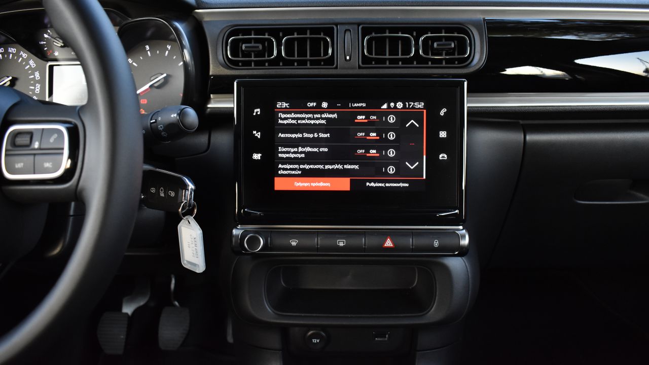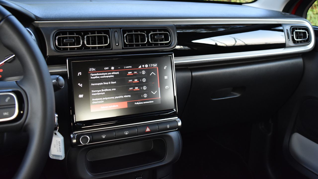 Η σχεδίαση της καμπίνας του νέου Citroen C3 παραμένει στο μεγαλύτερο μέρος της ως έχει. Στην κεντρική κονσόλα δεσπόζει μία οθόνη αφής μεγέθους 7 ιντσών (στάνταρ σε όλες τις εκδόσεις πλην της βασικής “Flair”) μέσα από την οποία ο οδηγός μπορεί να ρυθμίσει πολλές παραμέτρους σχετικά με την ενημέρωση, την ψυχαγωγία και τα συστήματα ασφαλείας. Είναι ευανάγνωστη, εύκολη στη χρήση και η εξοικείωση έρχεται άμεσα. Ίσως να προβληματίσει αρχικά το γεγονός ότι το σύστημα κλιματισμού ρυθμίζεται χωρίς την ύπαρξη φυσικού διακόπτη, αλλά αυτό είναι κάτι που σύντομα συνηθίζεται. Οι χώροι είναι αρκετοί για τέσσερις μεγαλόσωμους επιβάτες και οι θέσεις για μικροαντικείμενα στην κεντρική κονσόλα και τις πόρτες κρίνονται ικανοποιητικές. Βέβαια, πάνω από ικανοποιητική κρίνεται και η χωρητικότητα στο ντουλαπάκι του συνοδηγού. Η σημαντικότερη προσθήκη στο εσωτερικό είναι τα νέα καθίσματα. Η Citroen τα ονομάζει “Advanced Comfort” και έχουν ένα πολύ ιδιαίτερο και αφρώδες “στρώμα” που βυθίζεται από 2 έως 15 χιλιοστά προσφέροντας εντυπωσιακή οσφυϊκή υποστήριξη στους επιβάτες. Ίσως μία πιο αποτελεσματική πλευρική στήριξη να μπορούσε να τελειοποιήσει τα καθίσματα. Η υψηλή θέση οδήγησης θα βολέψει κάθε σωματότυπο και η ορατότητα βρίσκεται σε πολύ καλό επίπεδο. Ο χώρος τον αποσκευών αγγίζει τα 300 λίτρα (922 με αναδίπλωση των καθισμάτων σε διάταξη 60/40), είναι καλοσχηματισμένος, ενώ κάτω από το πάτωμά του υπάρχει ρεζέρβα ανάγκης.