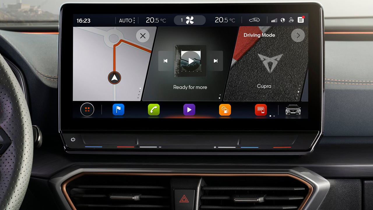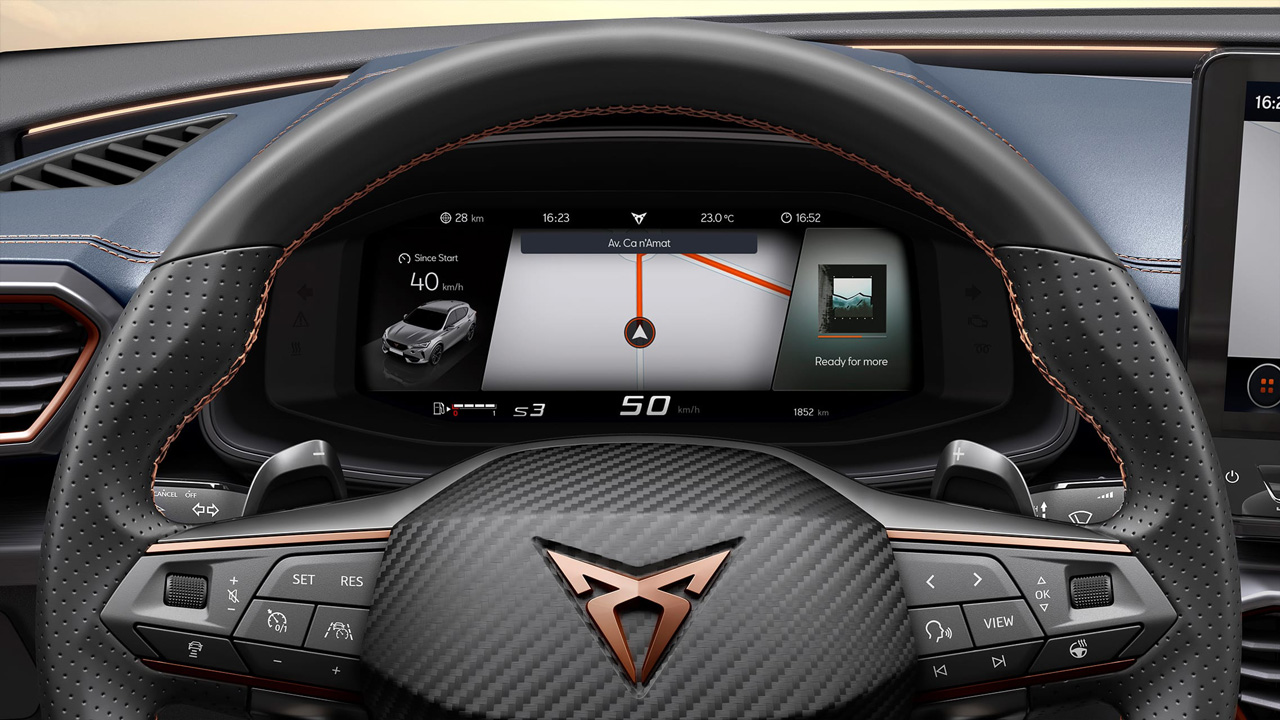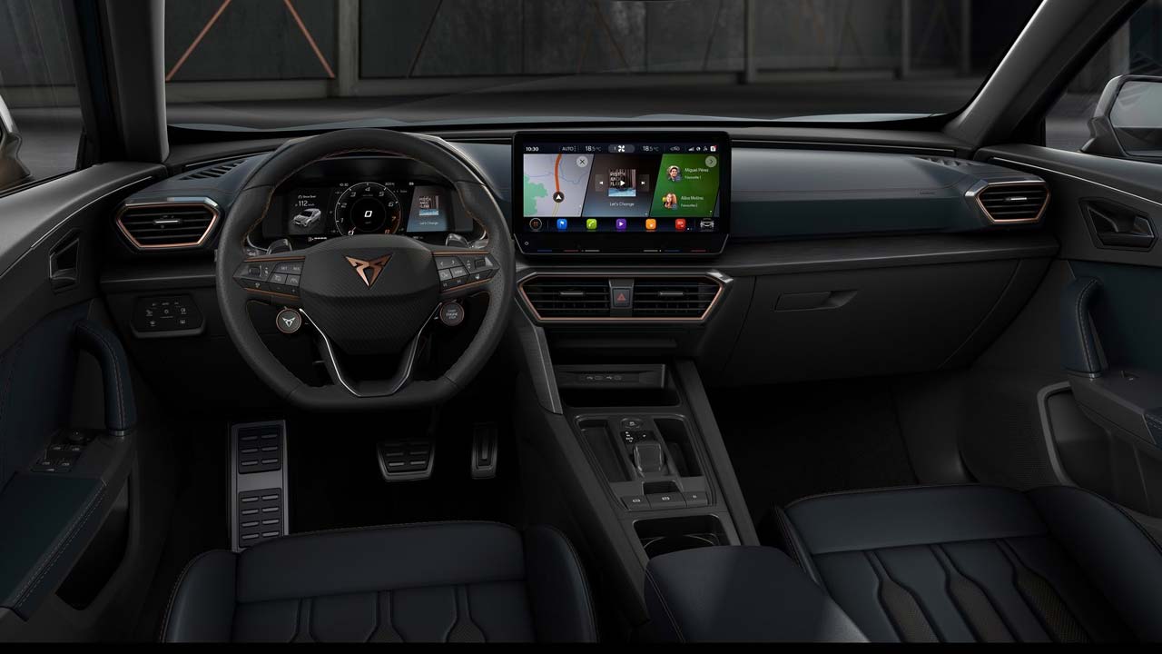 Περνώντας στο εσωτερικό του νέου Cupra Formentor, η εικόνα είναι πιο γνώριμη, μιας και εντοπίζονται στοιχεία που συναντάμε και σε μοντέλα της Seat, όπως για παράδειγμα το Leon. Η ποιότητα των υλικών είναι άνω του μετρίου, με πολύ μαλακές επενδύσεις στο άνω τμήμα του ταμπλό, αλλά και “sportive” πινελιές. Μερικές εξ’ αυτών είναι το flat-buttomed τιμόνι, τα χάλκινα διακοσμητικά στοιχεία γύρω από τους αεραγωγούς και τα καθίσματα με την πολύ καλή πλευρική στήριξη. Εννοείται ότι ιδιαίτερη έμφαση έχει δοθεί και στην ψηφιακή “υπόσταση” του μοντέλου, με δύο μεγάλες οθόνες. Η πρώτη έχει τον ρόλο του πίνακα οργάνων, το μέγεθός της αγγίζει τις 10,25 ίντσες και φέρει πολλές χρήσιμες ενδείξεις για τον οδηγό (υπάρχει ακόμα και μετρητής g-meter και laptimer). Η δεύτερη είναι αφής και αναλαμβάνει τον ρόλο του κεντρικού συστήματος infotainment με μέγεθος 10 ίντσες. Αξιοσημείωτη είναι και η ύπαρξη ενός πάνελ αφής ακριβώς από κάτω για την ρύθμιση της έντασης του ήχου αλλά και της θερμοκρασίας του κλιματισμού.