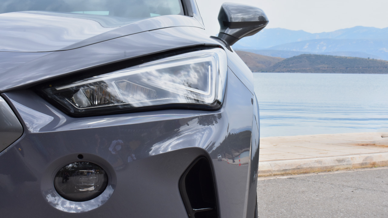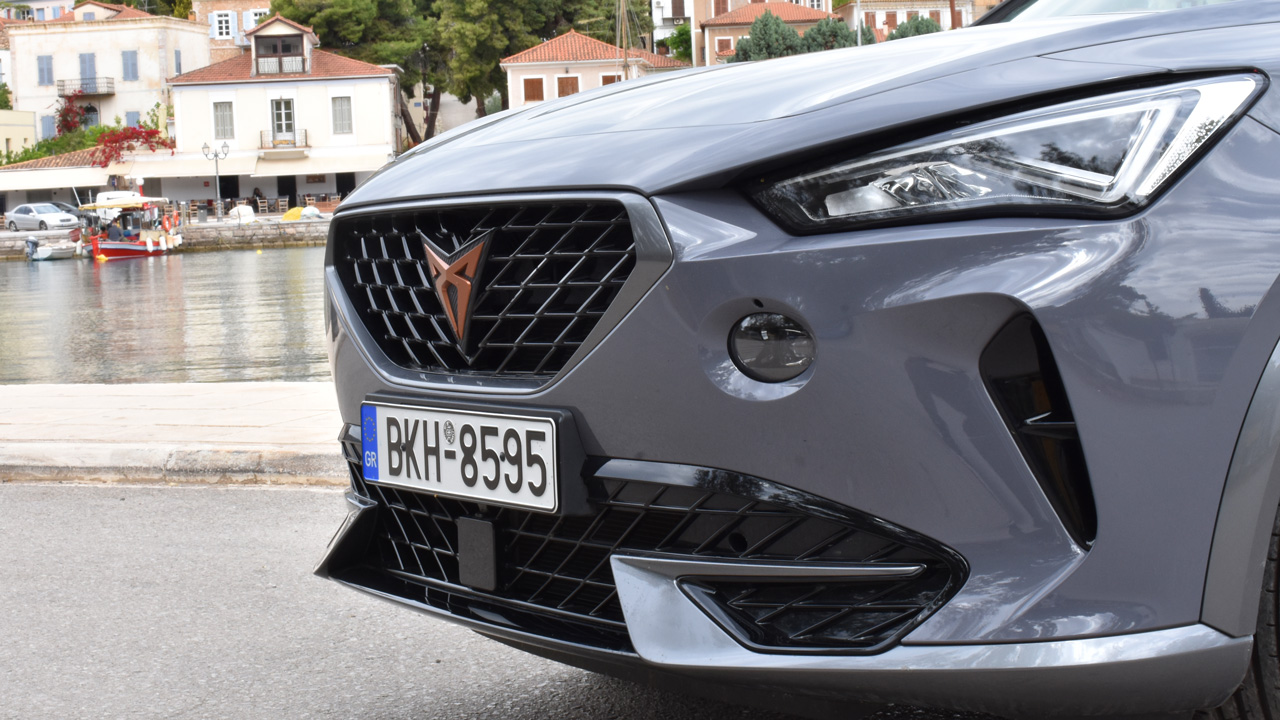 Το πρώτο στοιχείο που μπορεί να διαπιστώσει κανείς κοιτώντας το Cupra Formentor από κάθε γωνία, είναι το γεγονός πως δεν θυμίζει άλλο αυτοκίνητο. Έχει την δική του σχεδιαστική φιλοσοφία και το μόνο σίγουρο είναι ότι δεν αφήνει κανέναν αδιάφορο με την δυναμική του εμφάνιση. Στην διάρκεια της δοκιμής, είδα τους περισσότερους περαστικούς ρίχνουν μία “κλεφτή” ματιά στη μάσκα. Σίγουρα κάτι τέτοιο οφείλεται στο νέο σήμα στο χρώμα του χαλκού που δεν είναι ακόμα γνώριμο, αλλά και στην εντυπωσιακή σχεδίαση με τα διπλά φωτιστικά σώματα και τις αιχμηρές γωνίες. Στο μεγάλο καπό ξεχωρίζουν τα δύο έντονα “νεύρα”, ενώ στο πίσω μέρος συναντάμε τα LED φωτιστικά σώματα που ενώνονται με μία λωρίδα, την αεροτομή και το όνομα της εταιρείας με μαύρα γράμματα. Η Cupra αποκαλεί το Formentor coupe SUV και πράγματι, υπάρχουν στοιχεία που επιβεβαιώνουν και τους δύο χαρακτηρισμούς, όπως για παράδειγμα η κεκλιμένη οροφή, η αυξημένη απόσταση από το έδαφος, αλλά και οι ράγες οροφής. Όσο για τις διαστάσεις, οι αριθμοί επιβεβαιώνουν την ογκώδη εμφάνιση του αμαξώματος, με το μήκος να φτάνει τα 4.446 χλστ., το πλάτος τα 1.839 και το ύψος τα 1.520 χλστ.